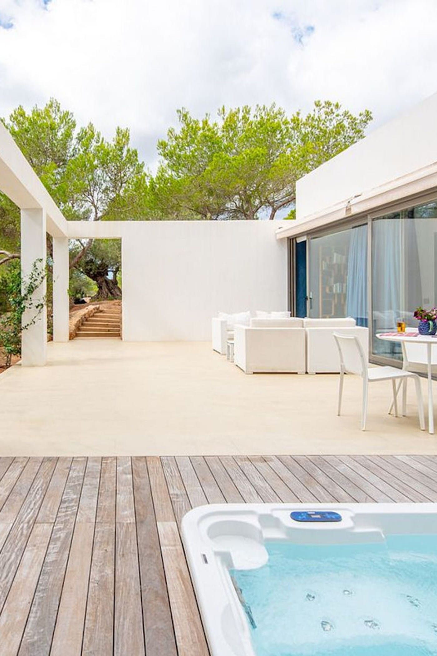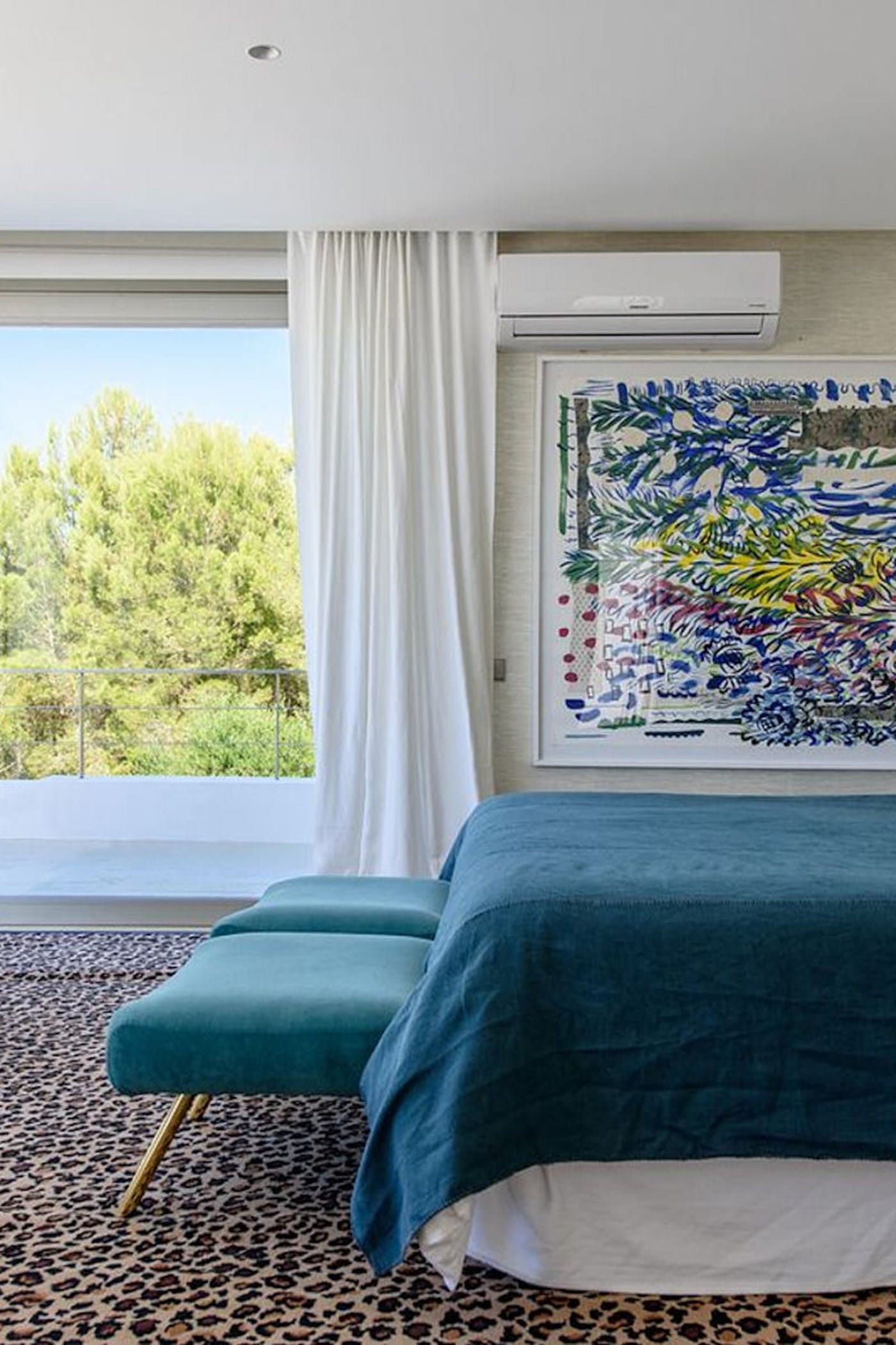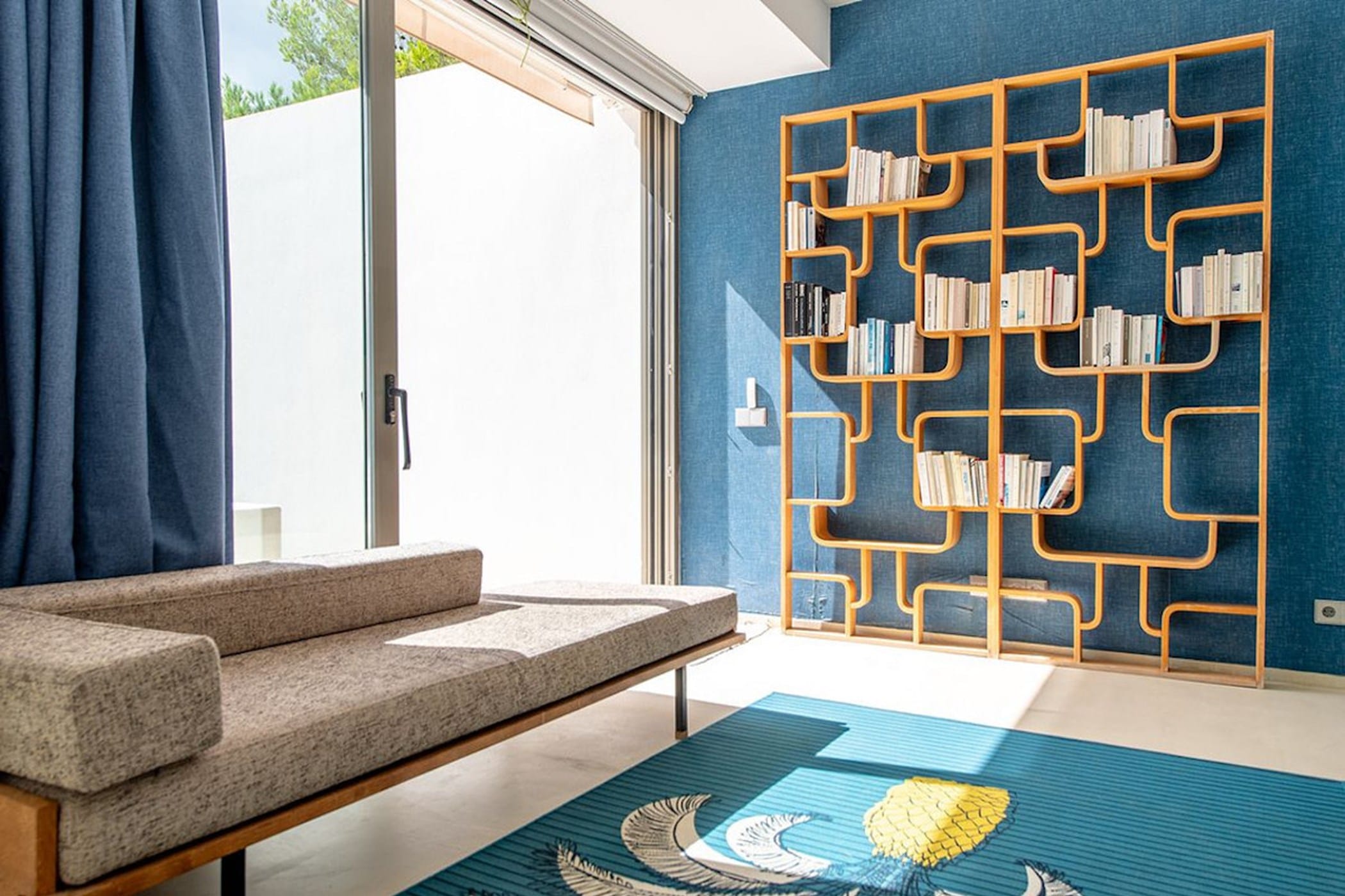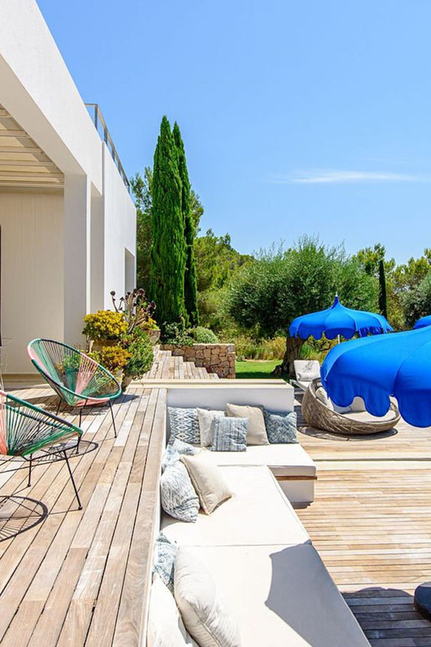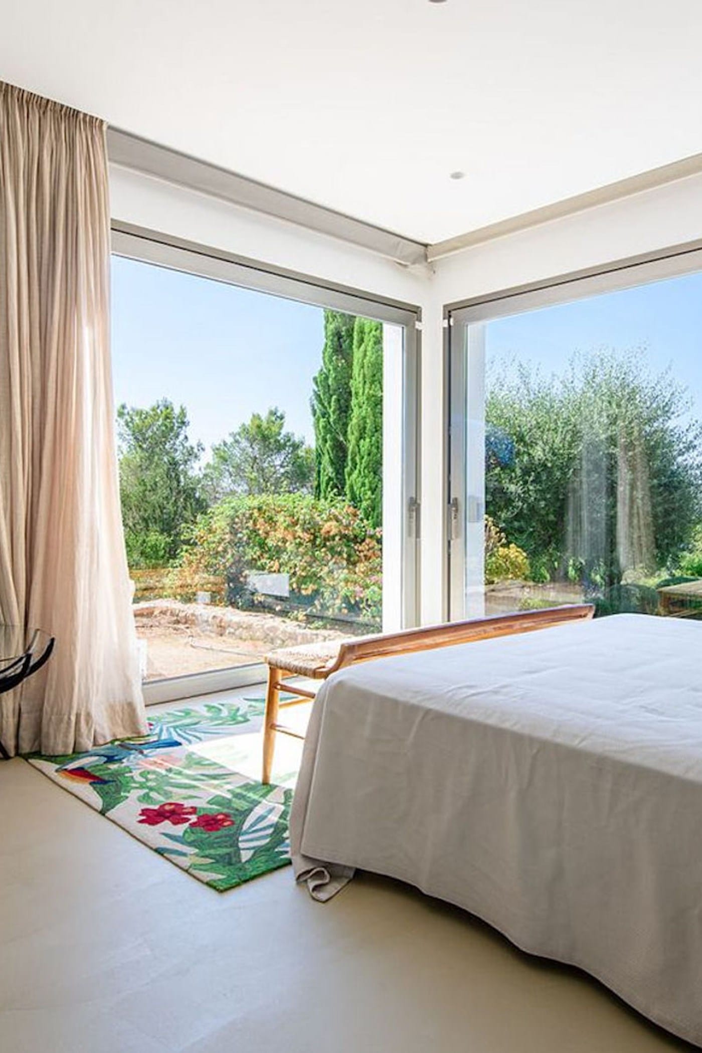 This modern 7-bedroom mansion, designed by renowned architect Jaime Serra, sits majestically on a hillside with beautiful views over green hills and Cala Jondal bay, home to the world-famous Blue Marlin beach club. Close to the charming village of San Jose and Ibiza Town.