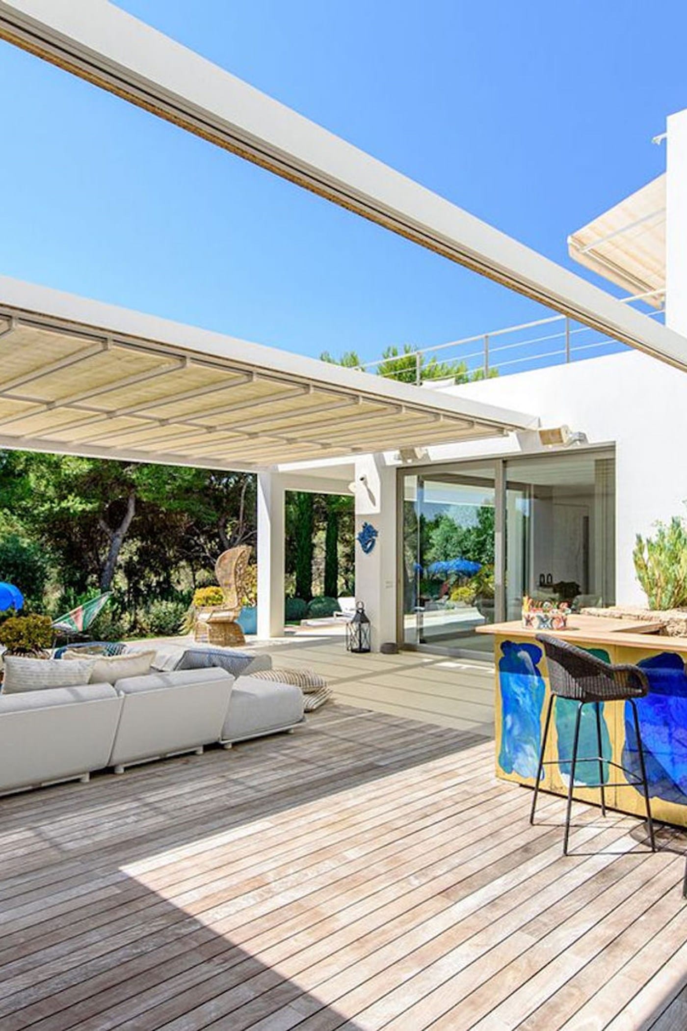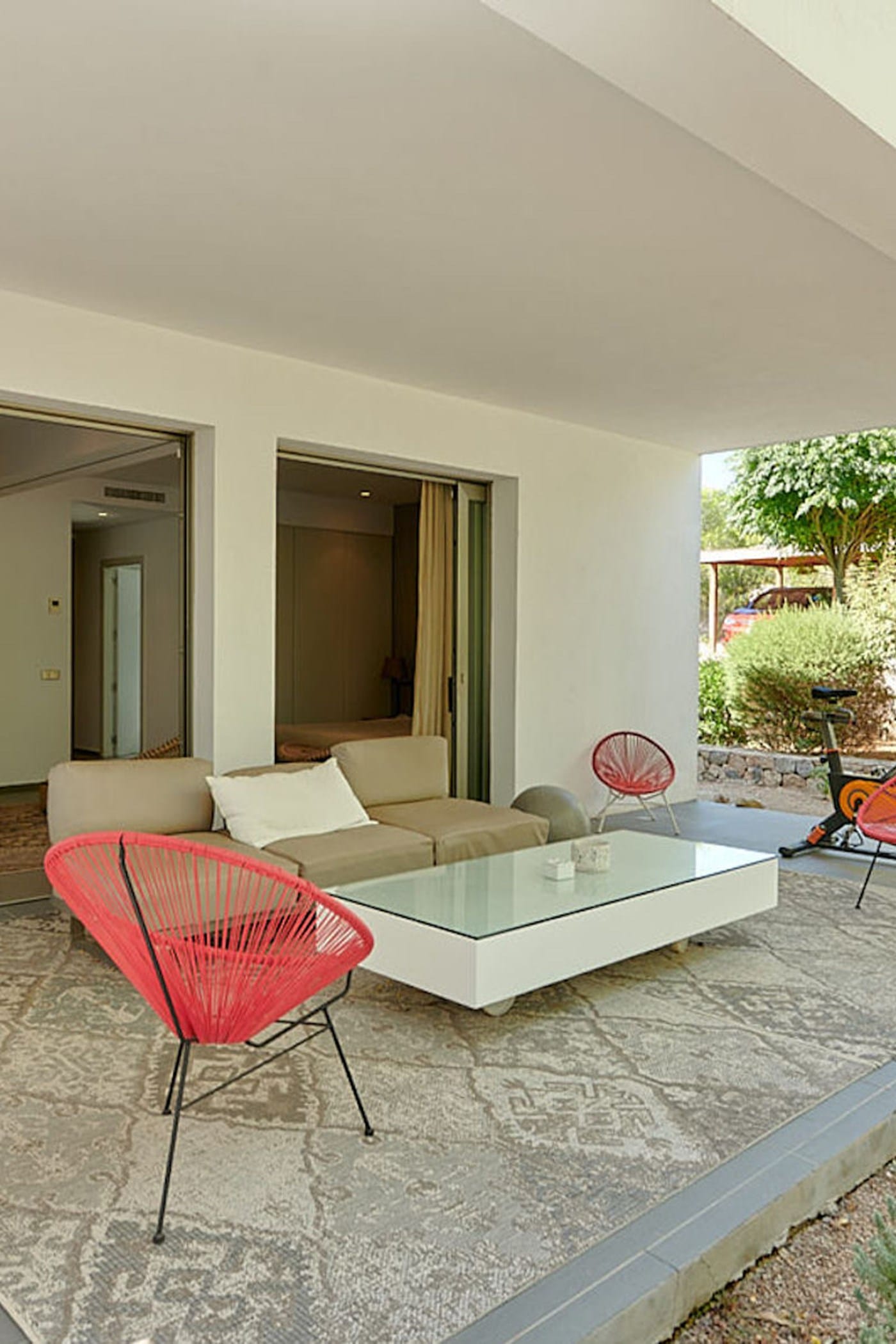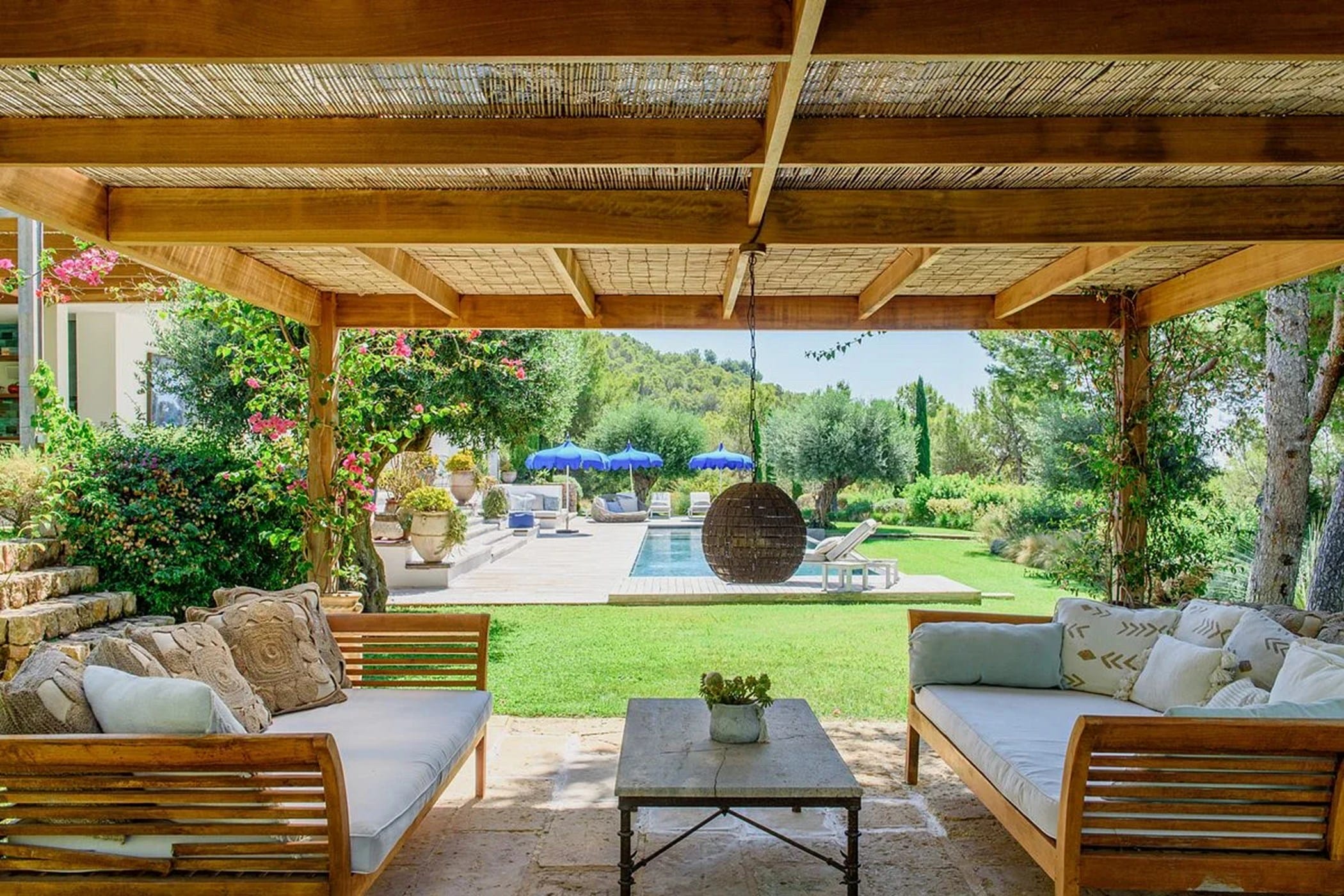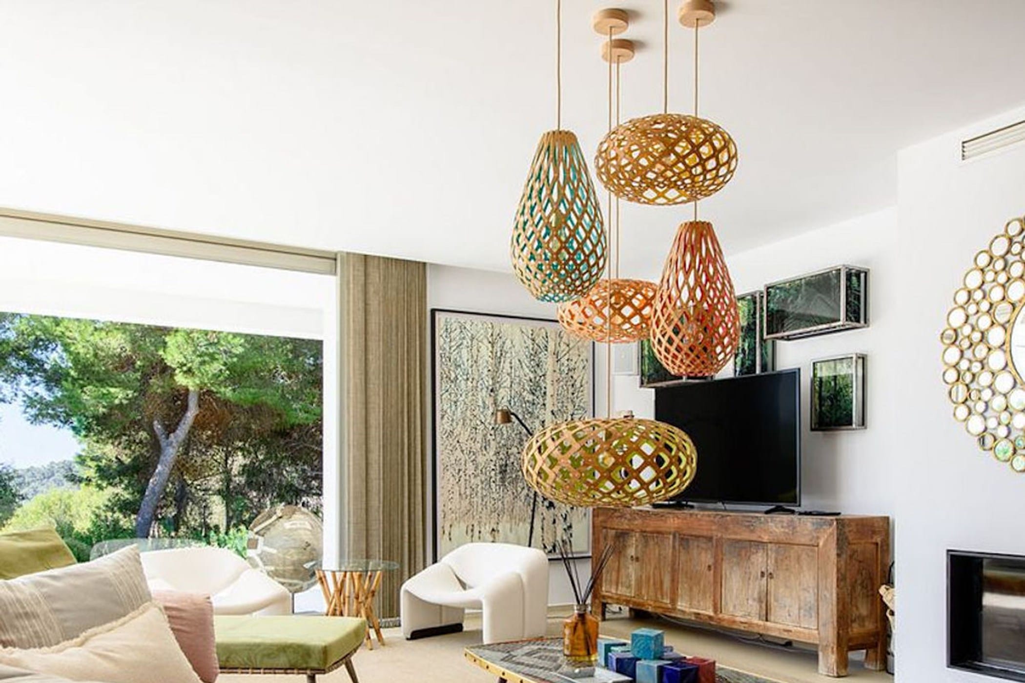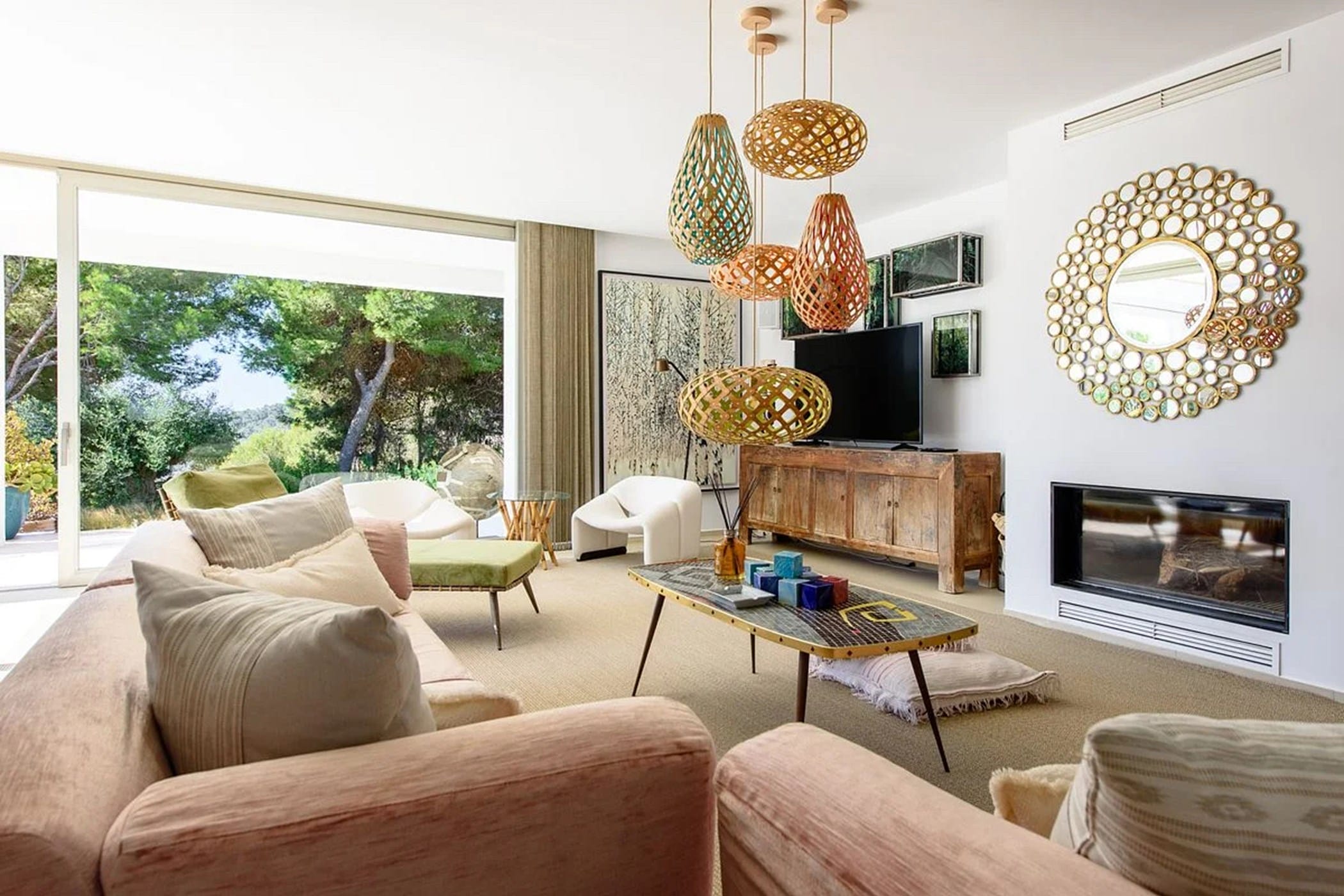 This modern 7-bedroom mansion, designed by renowned architect Jaime Serra, sits majestically on a hillside with beautiful views over green hills and Cala Jondal bay, home to the world-famous Blue Marlin beach club. Close to the charming village of San Jose and Ibiza Town.