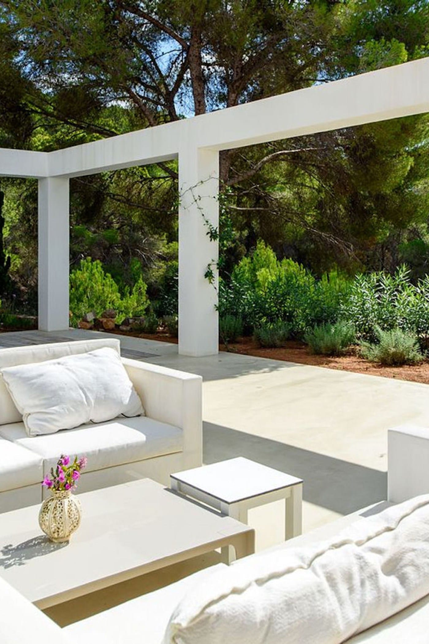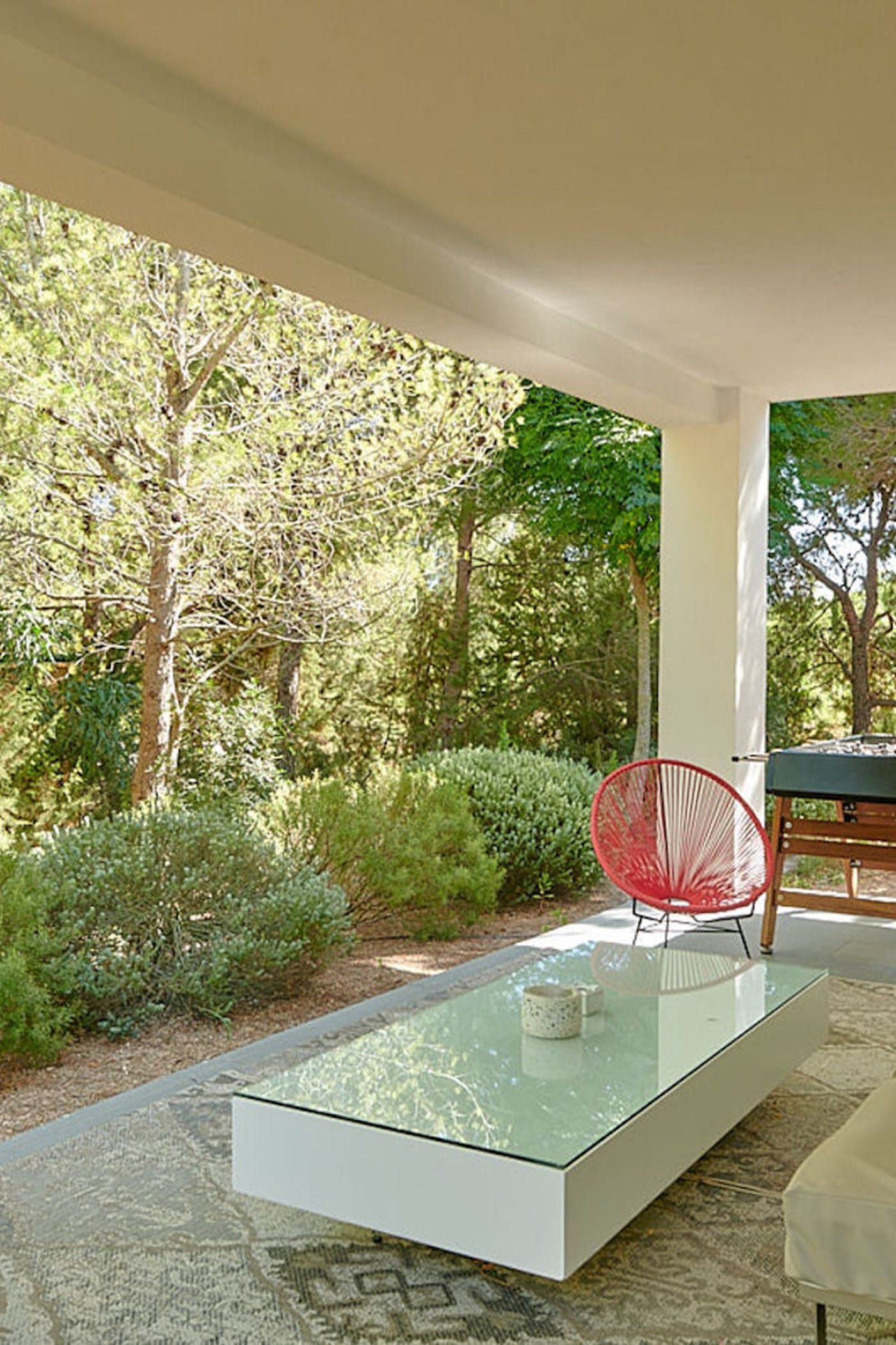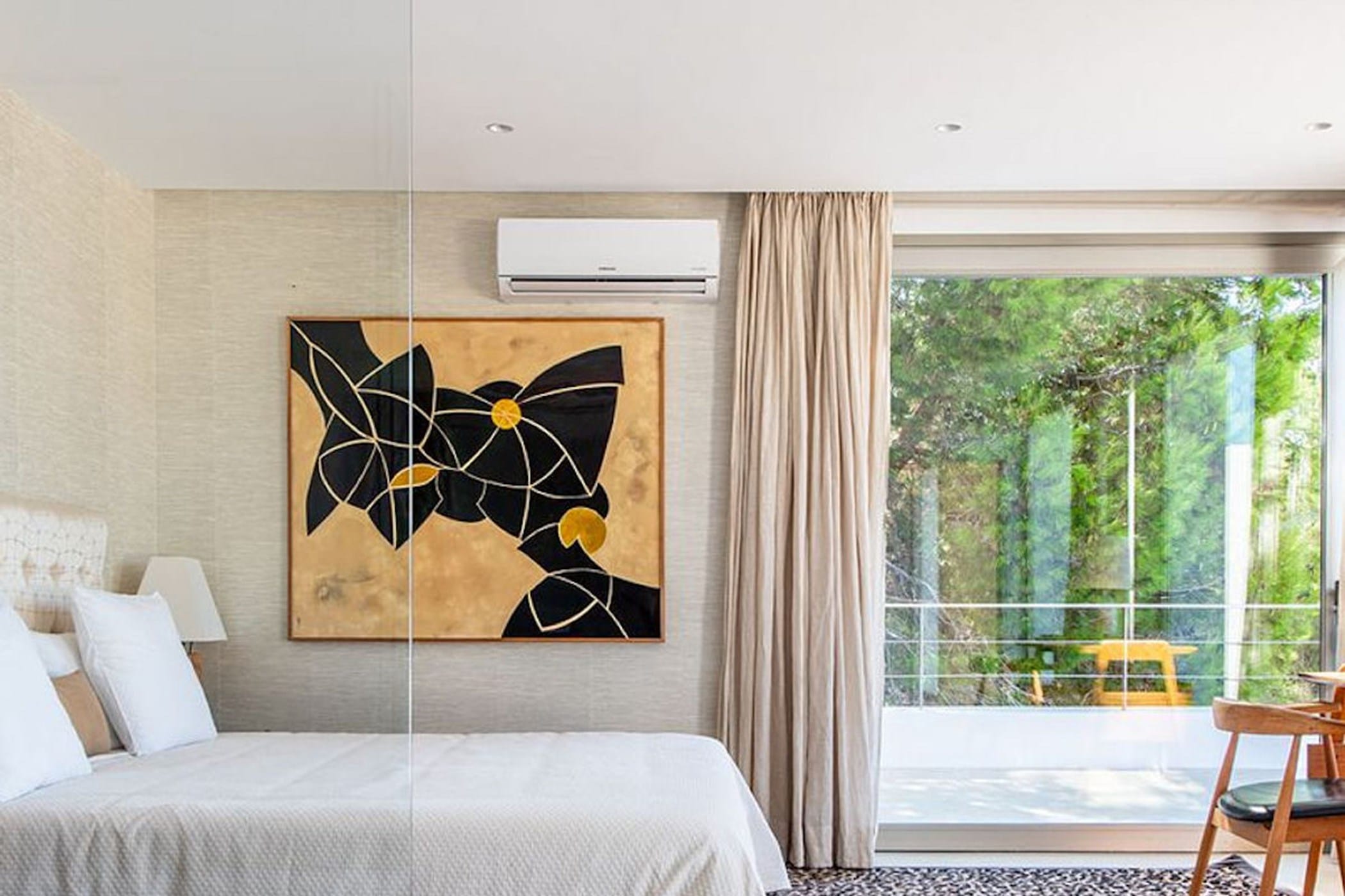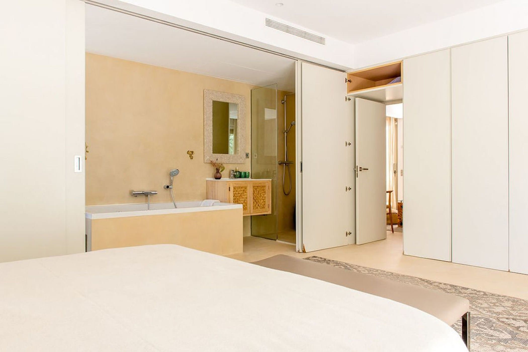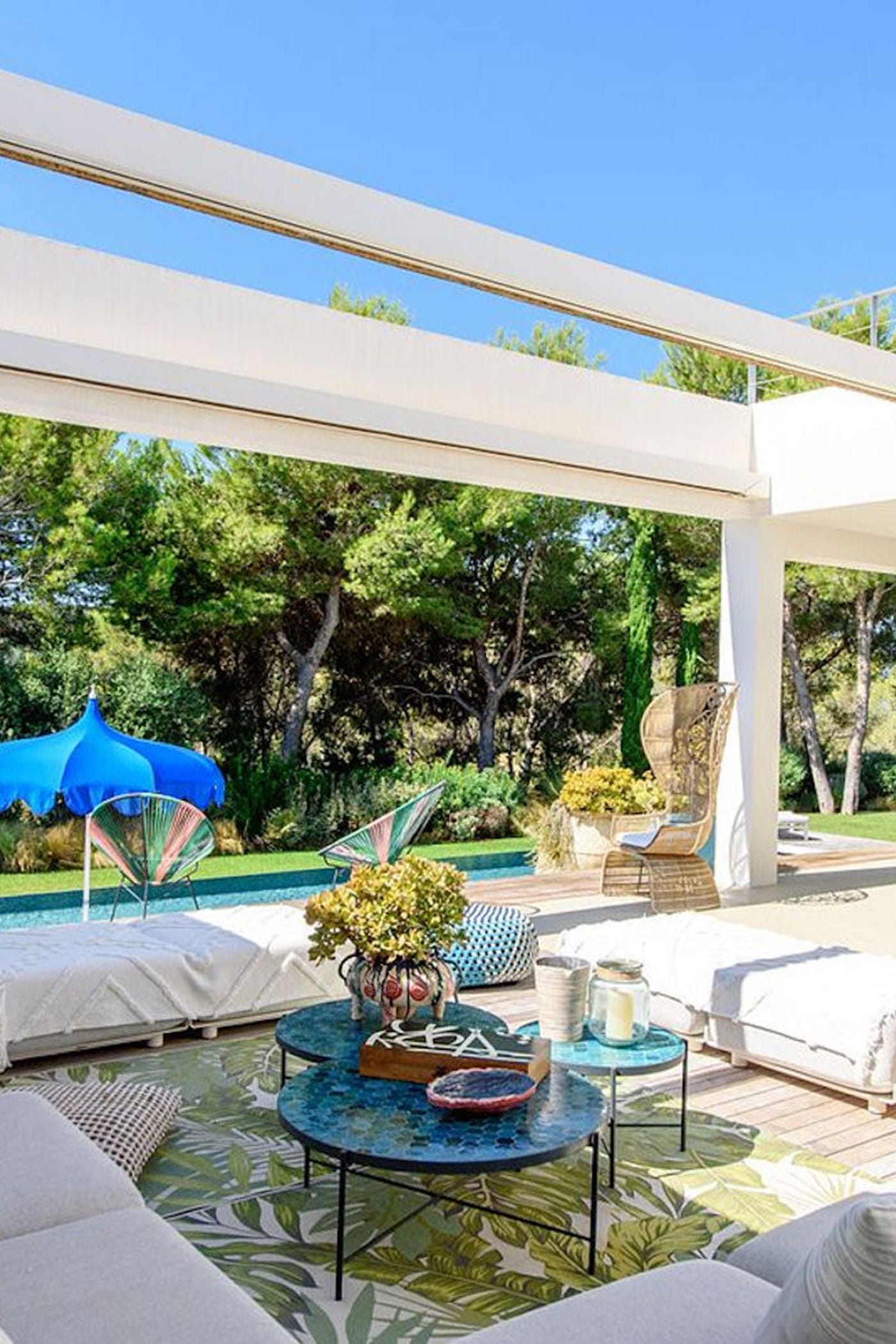 This modern 7-bedroom mansion, designed by renowned architect Jaime Serra, sits majestically on a hillside with beautiful views over green hills and Cala Jondal bay, home to the world-famous Blue Marlin beach club. Close to the charming village of San Jose and Ibiza Town.