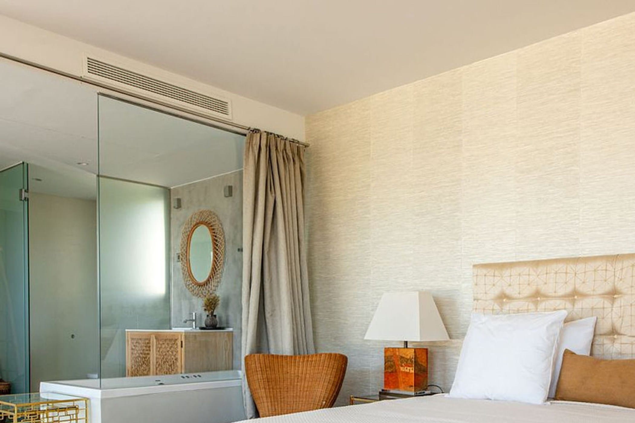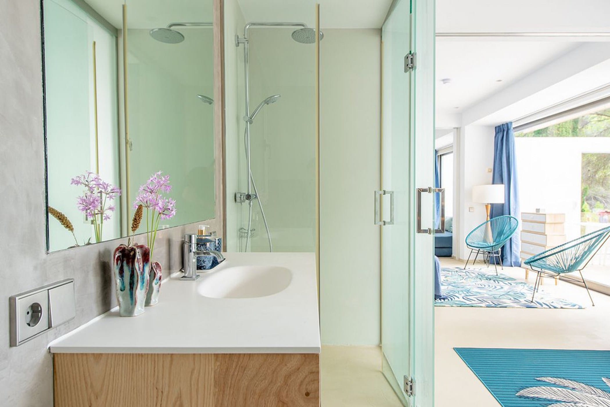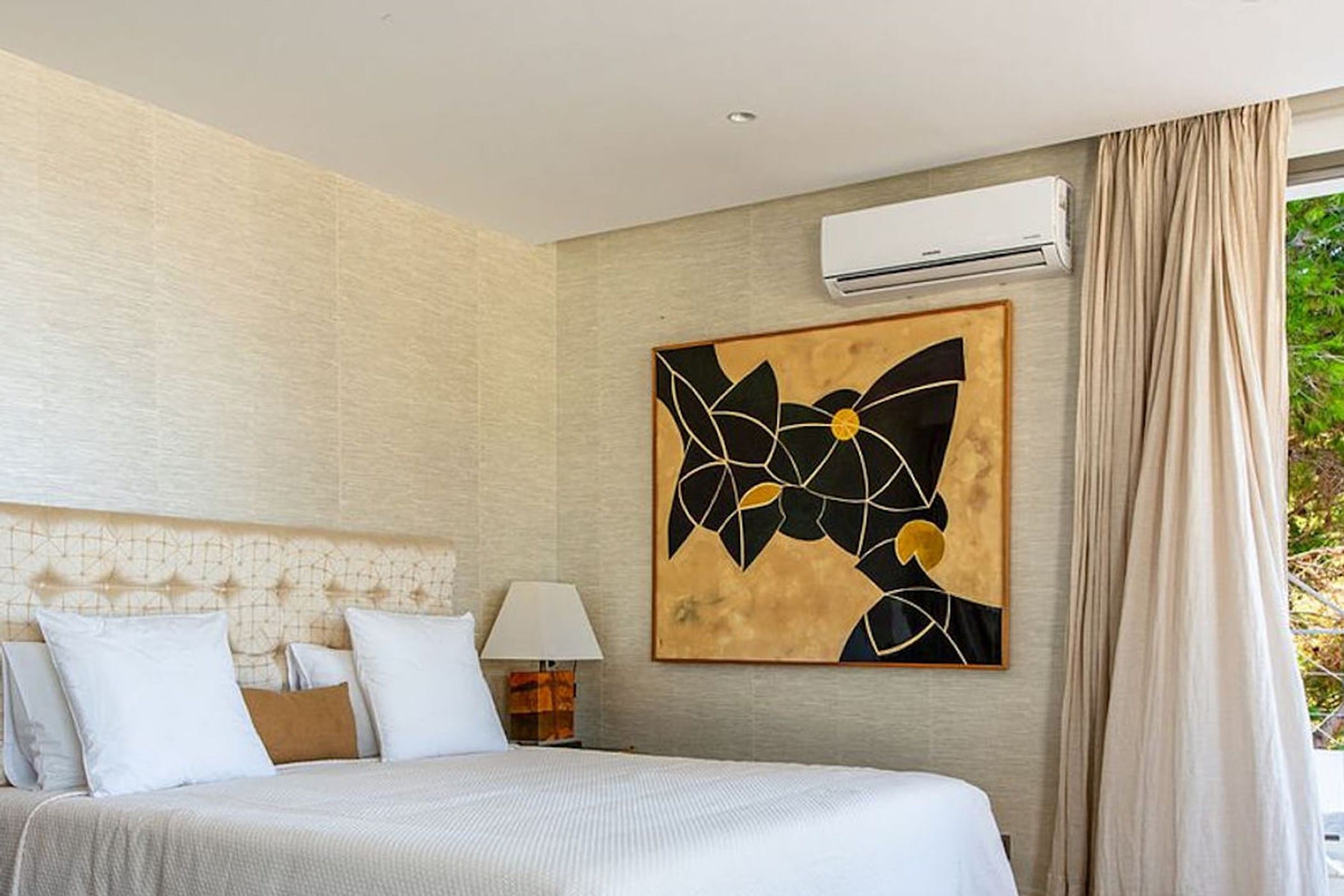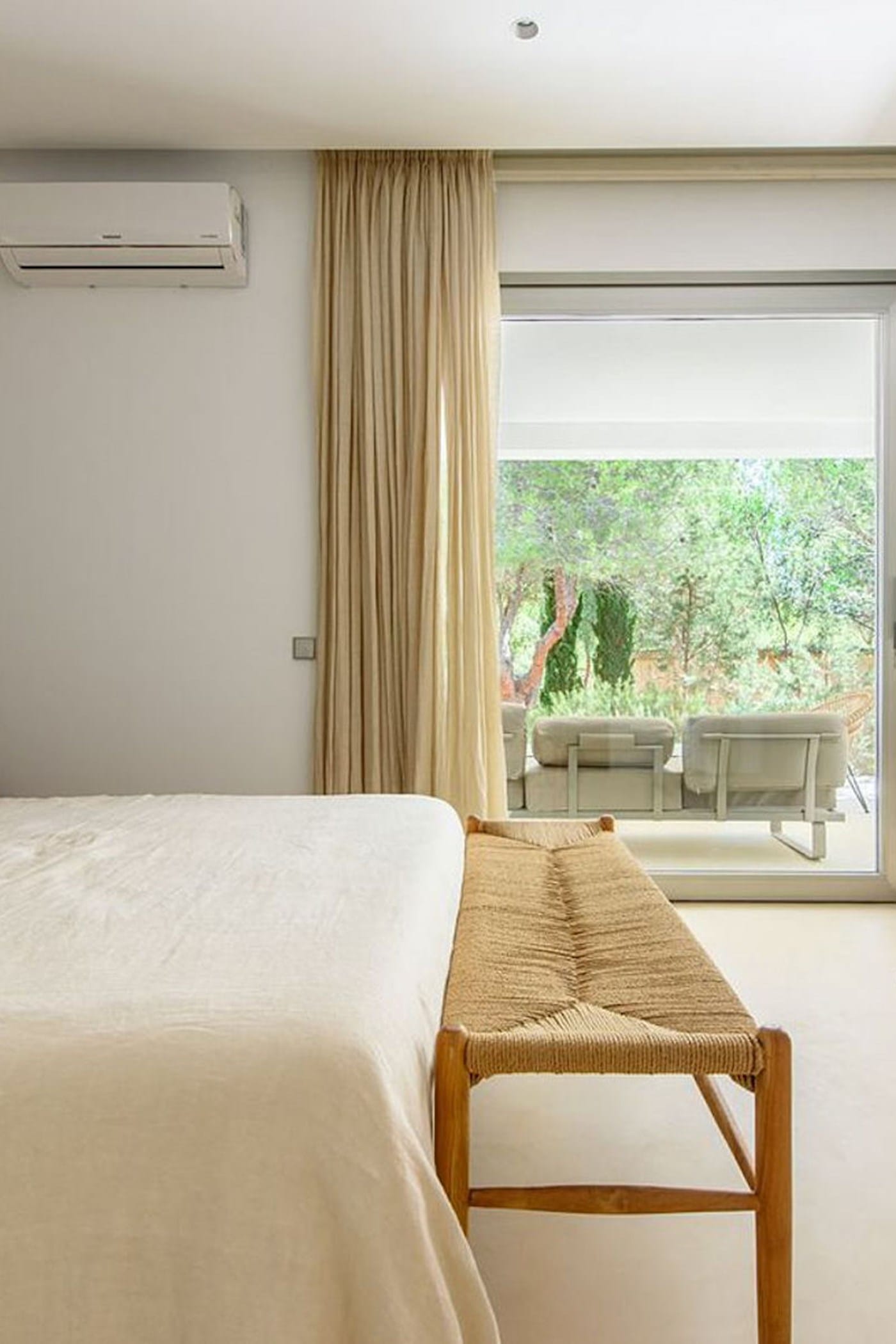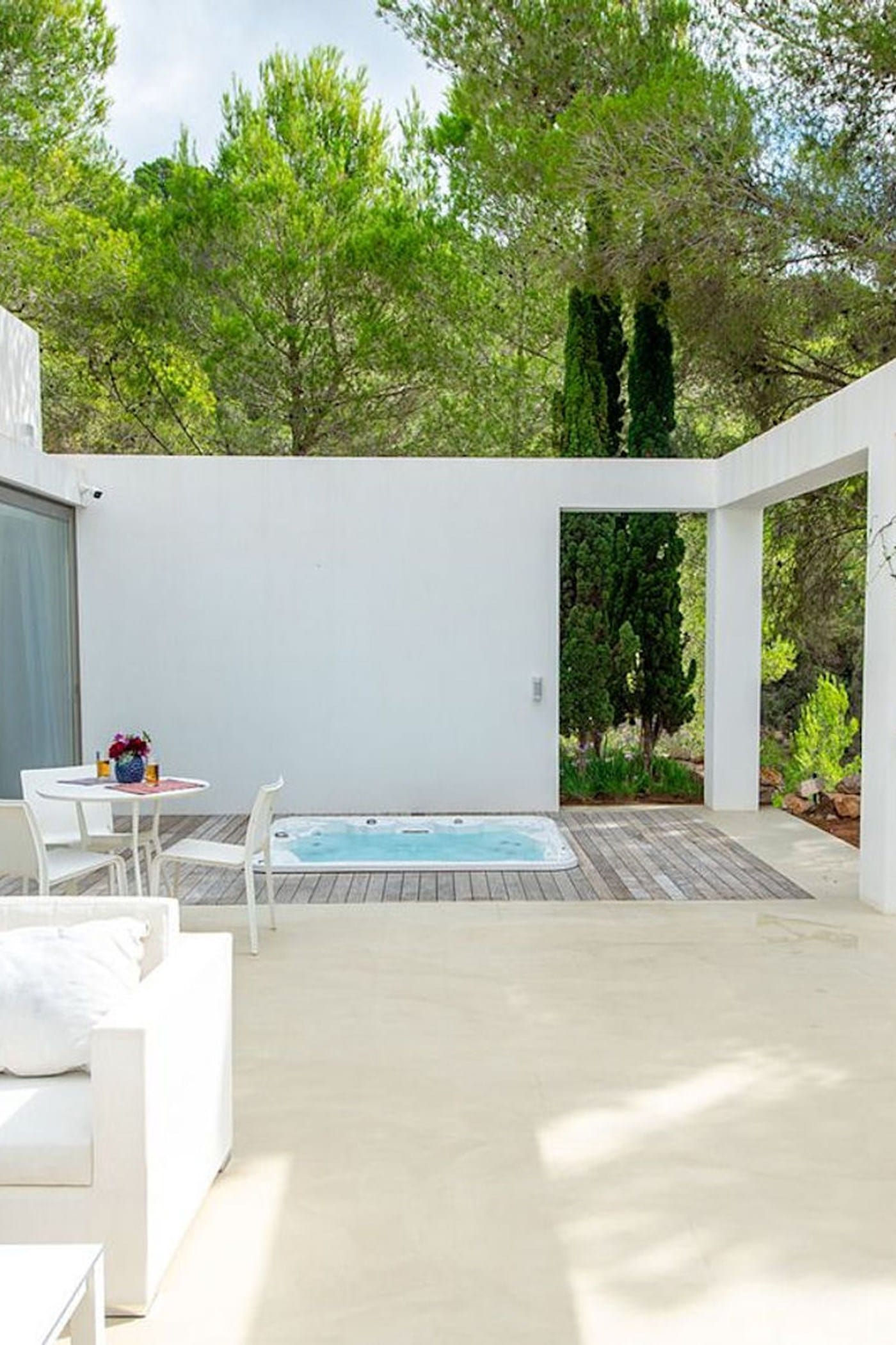 This modern 7-bedroom mansion, designed by renowned architect Jaime Serra, sits majestically on a hillside with beautiful views over green hills and Cala Jondal bay, home to the world-famous Blue Marlin beach club. Close to the charming village of San Jose and Ibiza Town.