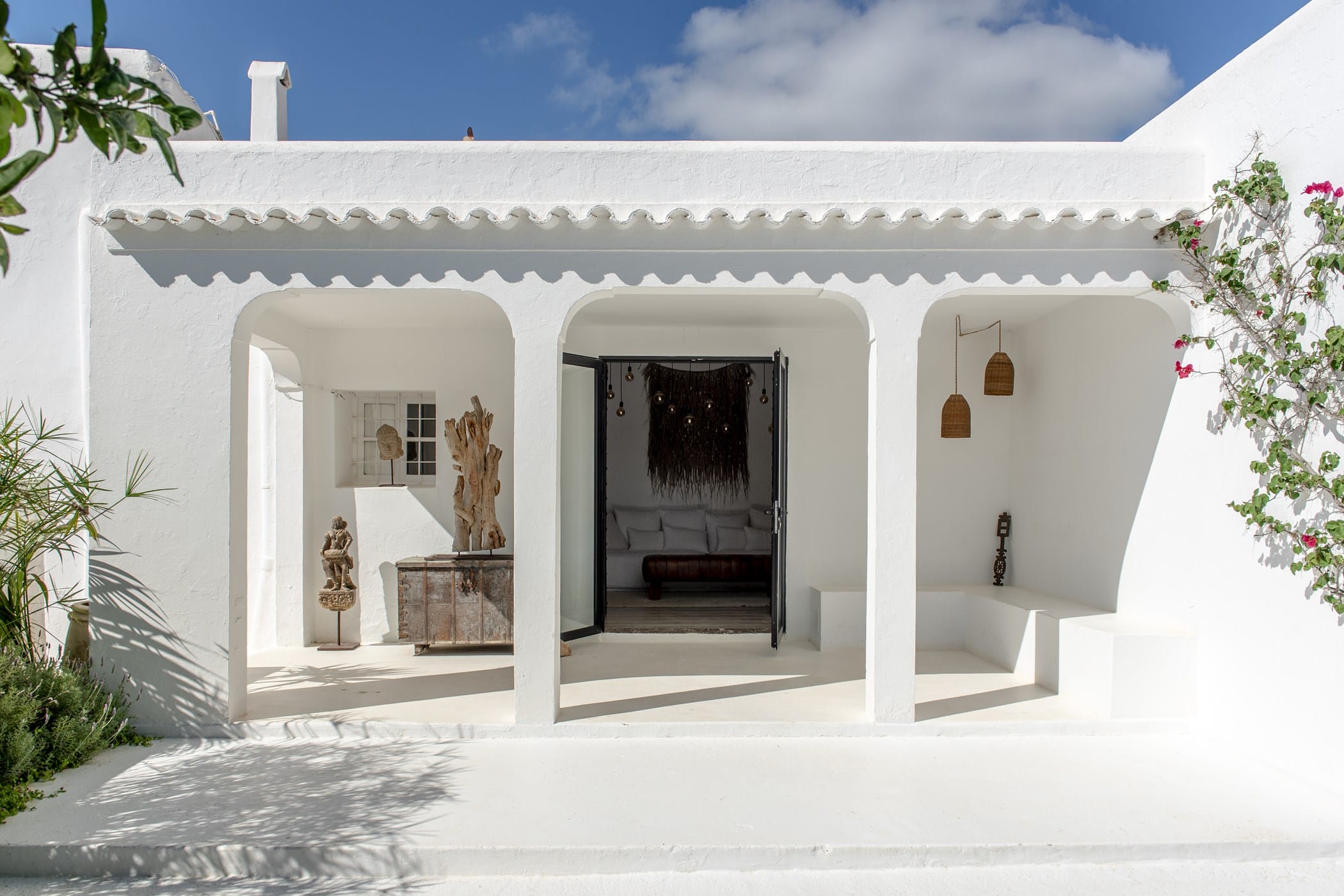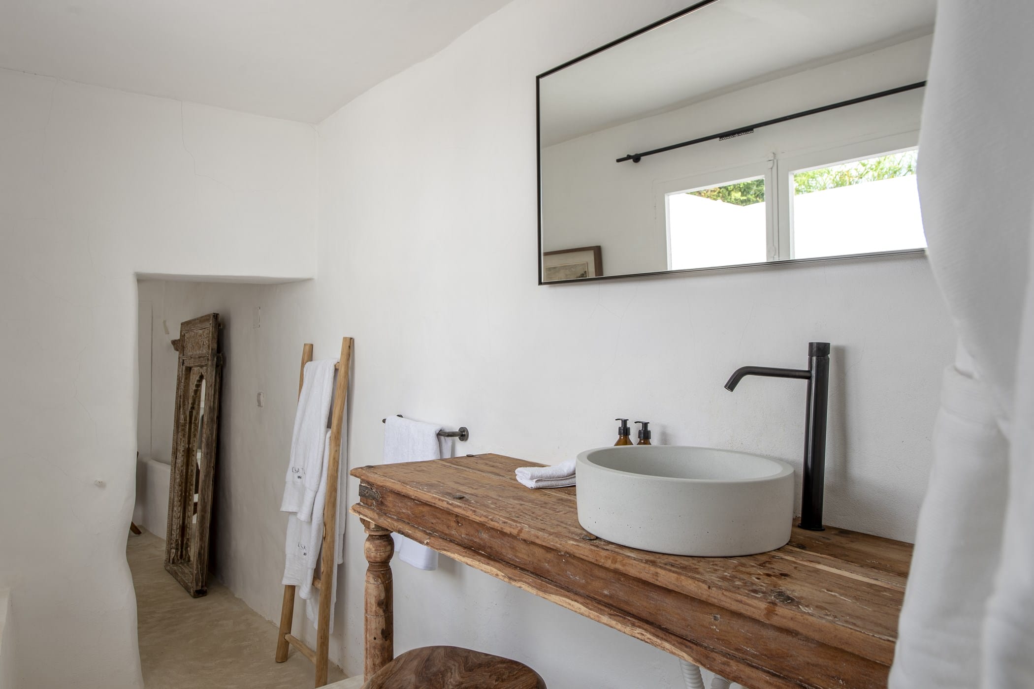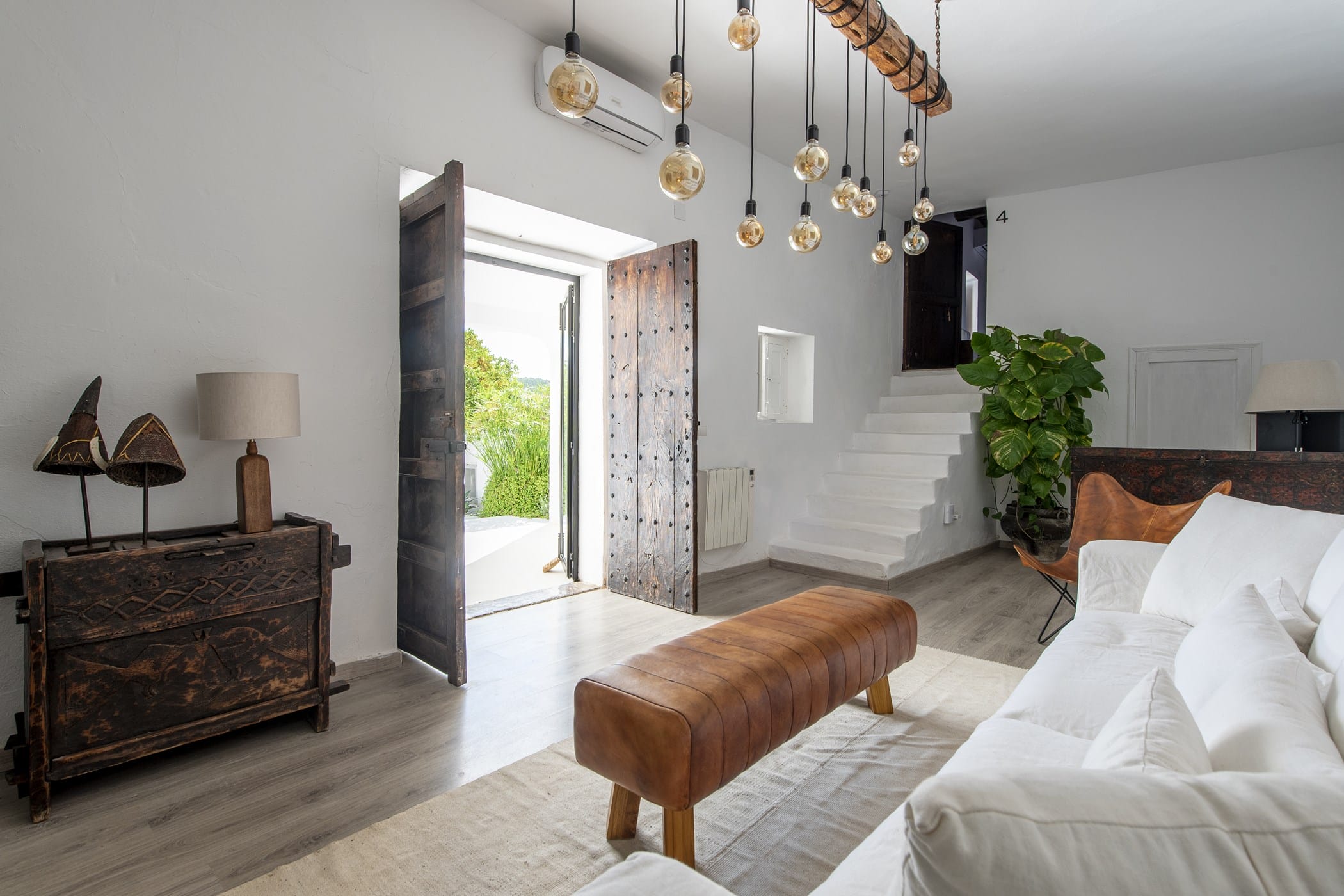This charming 200-year-old renovated Ibizan finca blends rustic authenticity with unique style, featuring antiques from India, Nepal, Tibet, and Africa alongside Provencal and bohemian furnishings. High-tech comforts include Apple TV, SONOS sound system, WiFi, heating, and air conditioning throughout.
