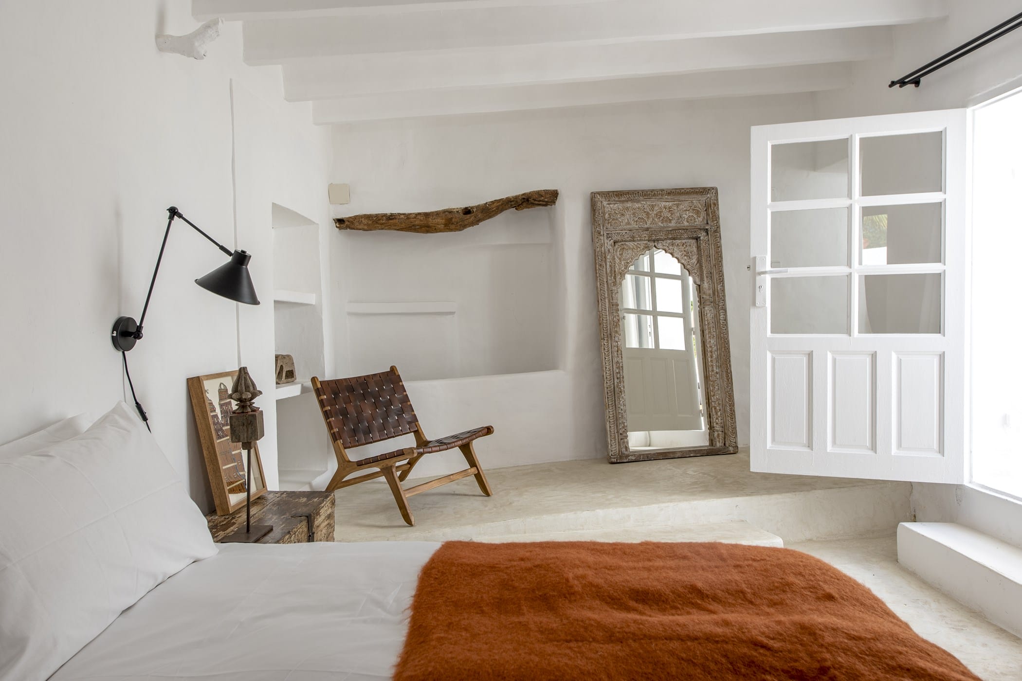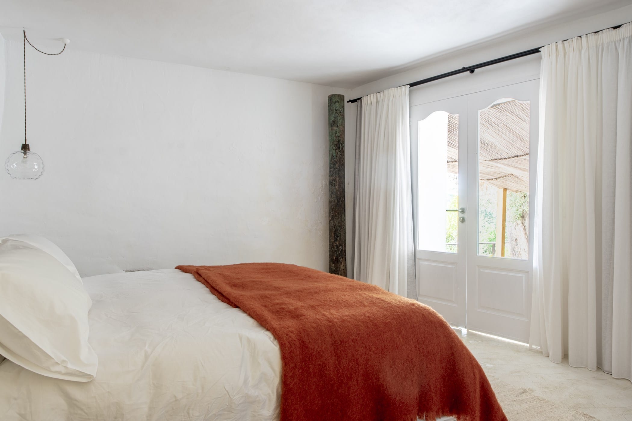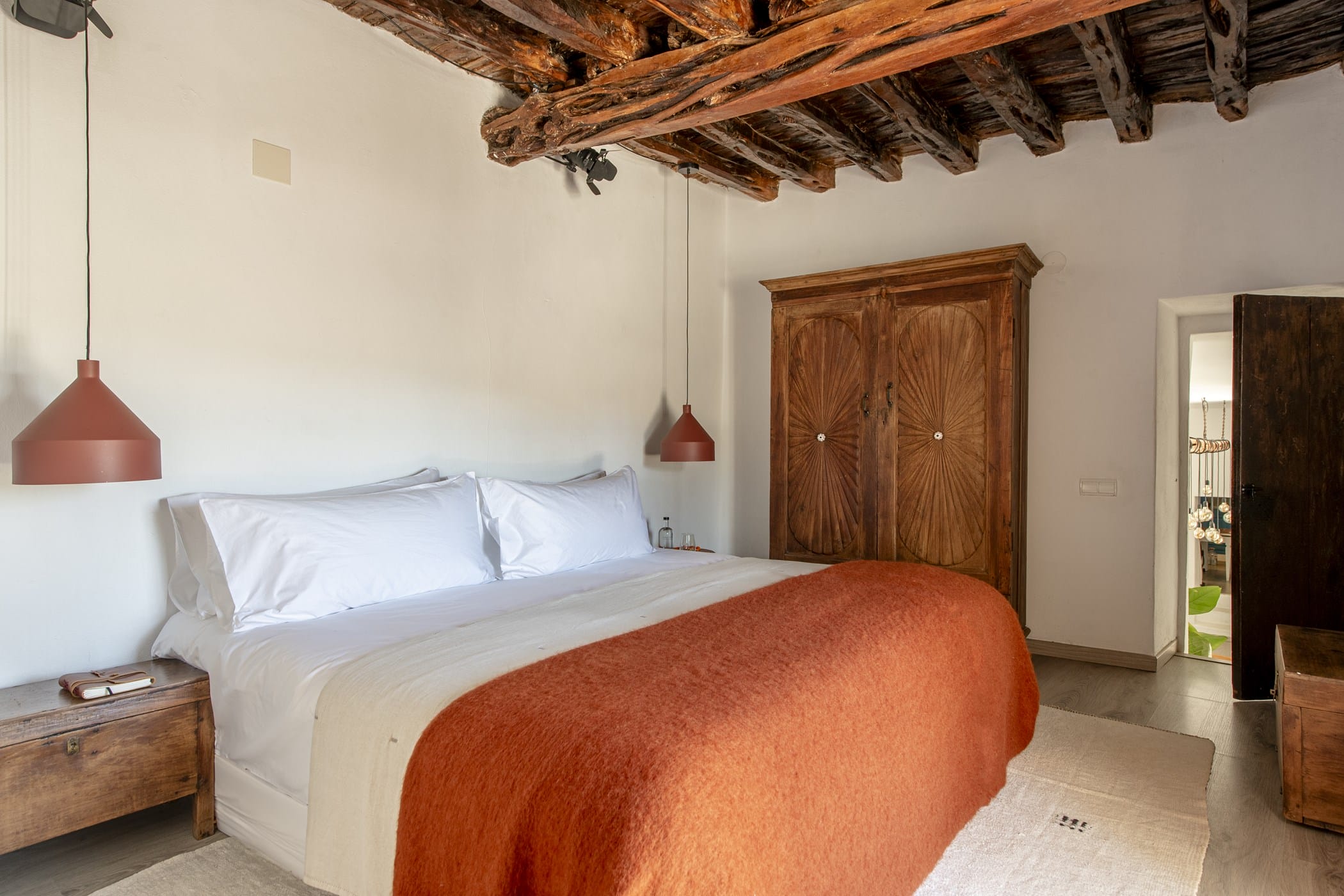 This charming 200-year-old renovated Ibizan finca blends rustic authenticity with unique style, featuring antiques from India, Nepal, Tibet, and Africa alongside Provencal and bohemian furnishings. High-tech comforts include Apple TV, SONOS sound system, WiFi, heating, and air conditioning throughout.