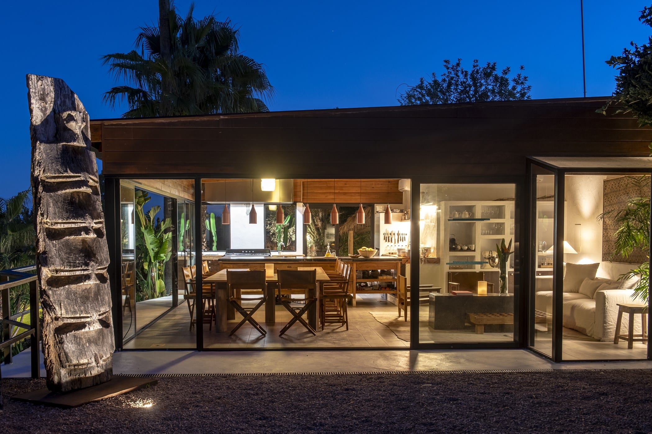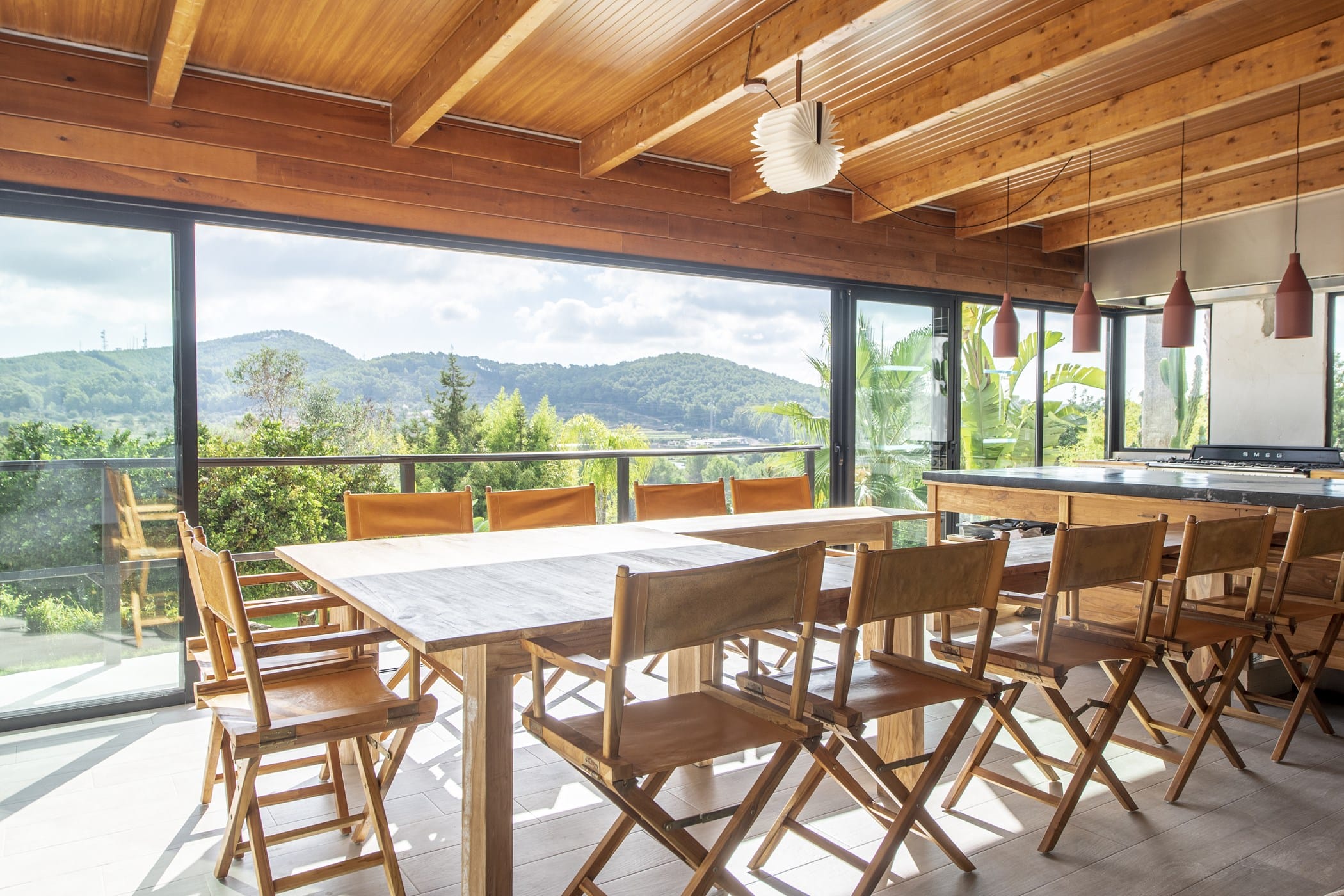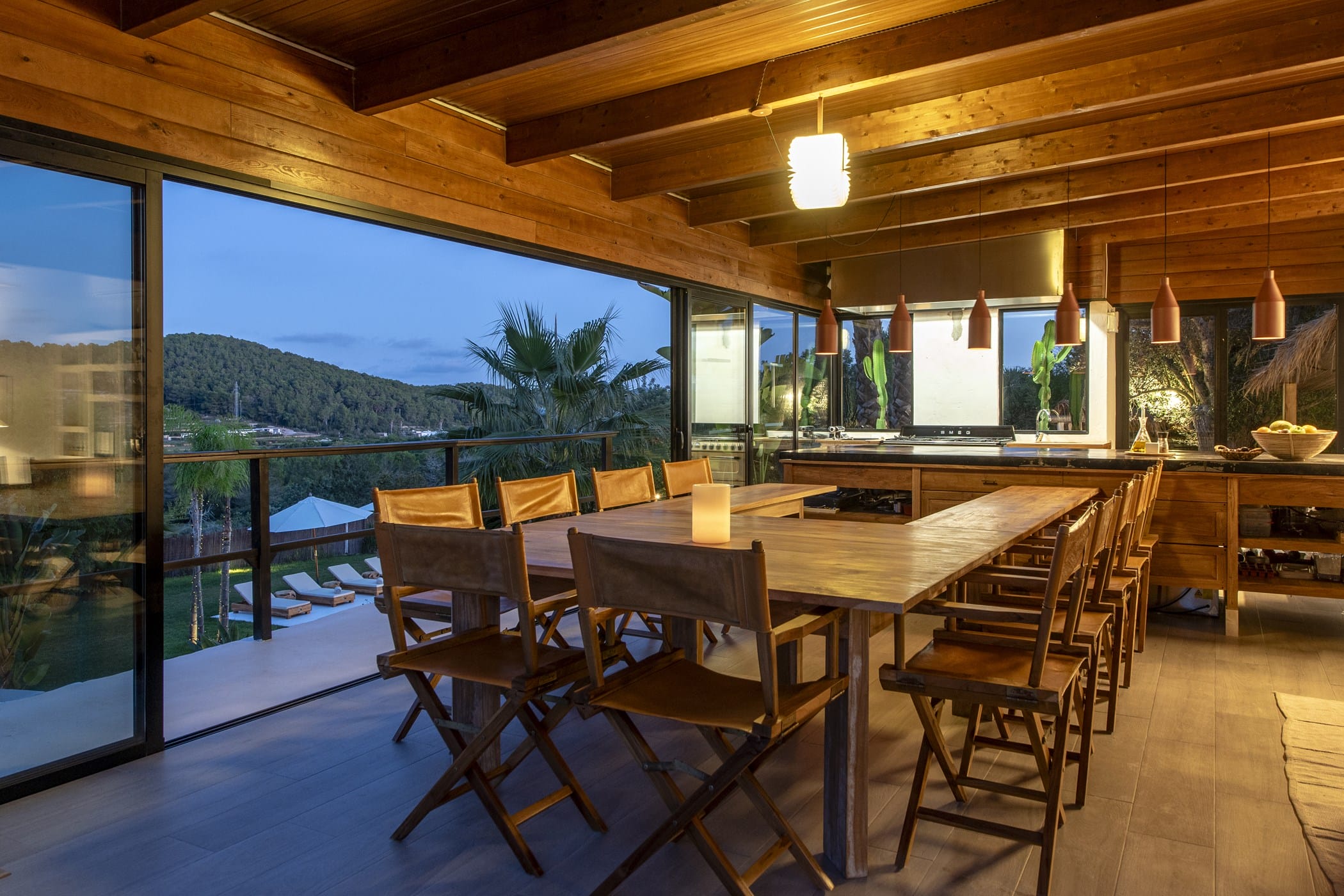 The bright open-plan living room and kitchen are in a glass-sided building overlooking the pool and valley. Outside, a saltwater pool is surrounded by lush lawns, multiple chill-out areas, and a covered outdoor bar/kitchen. Guests can enjoy fresh produce from the ecological garden and fruit trees (oranges, lemons, apricots).