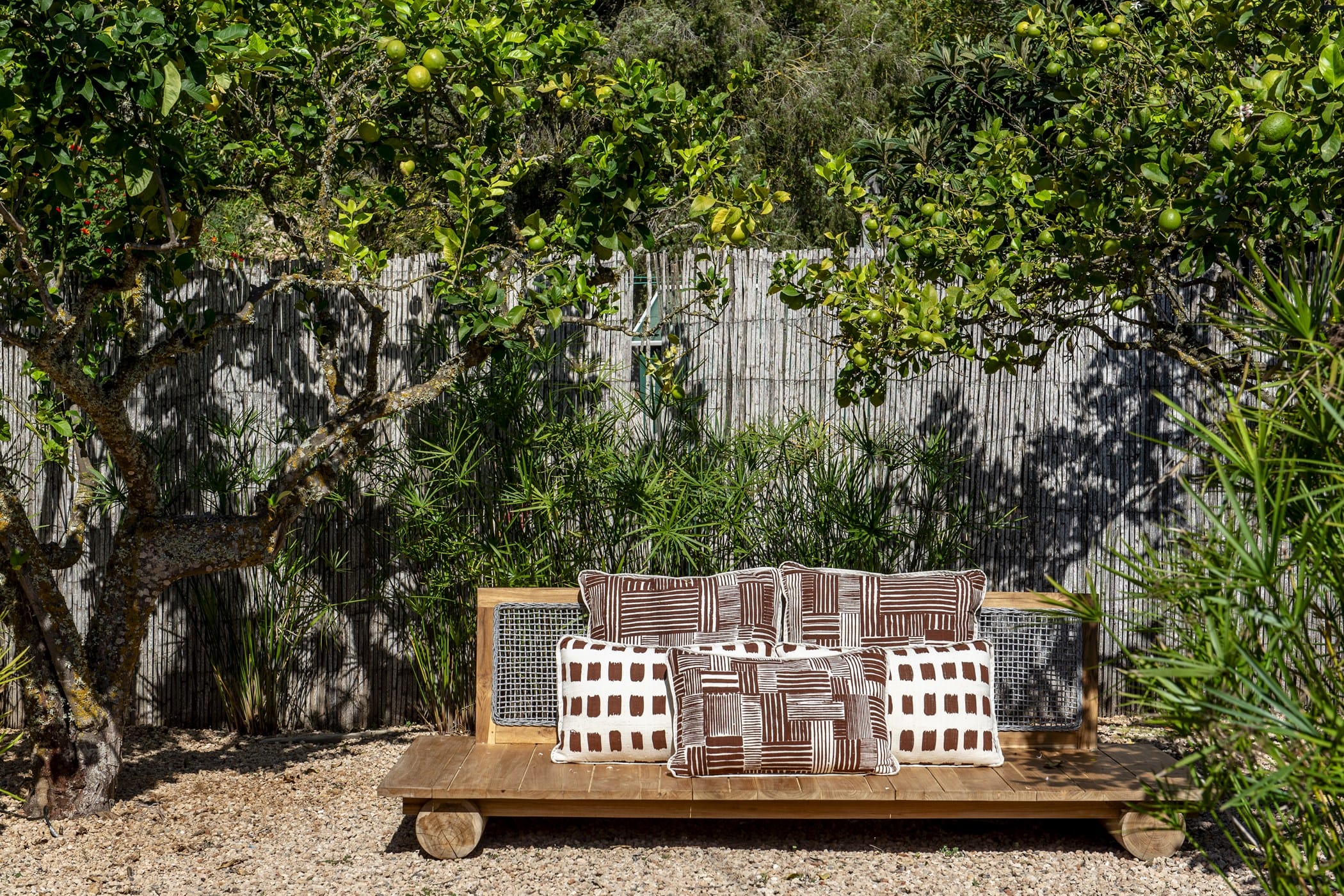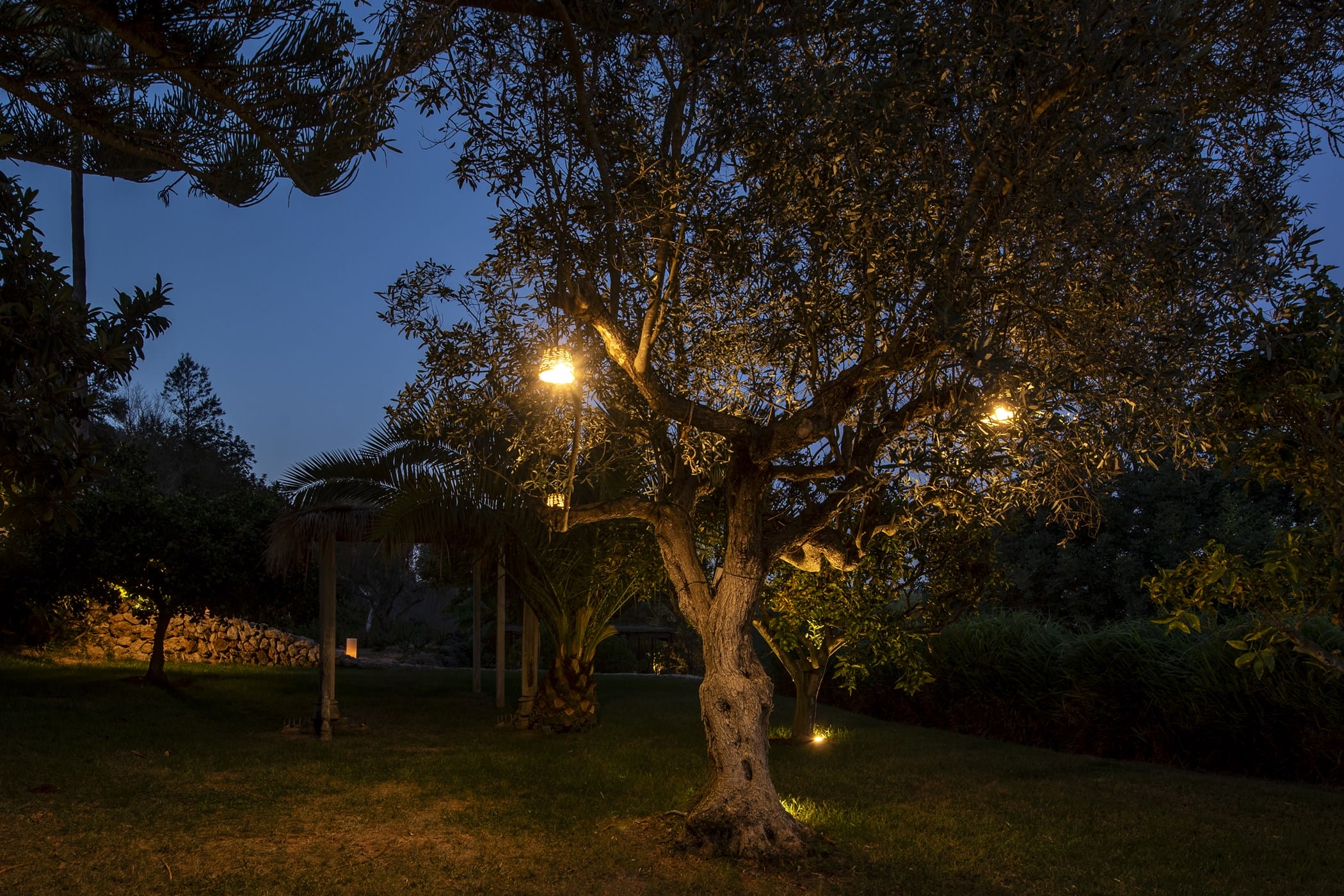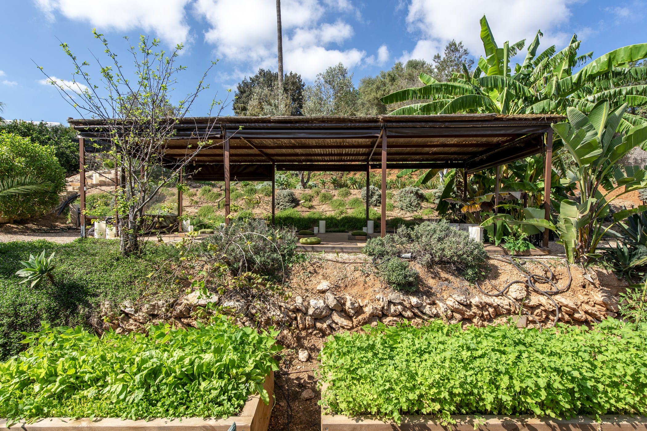 The bright open-plan living room and kitchen are in a glass-sided building overlooking the pool and valley. Outside, a saltwater pool is surrounded by lush lawns, multiple chill-out areas, and a covered outdoor bar/kitchen. Guests can enjoy fresh produce from the ecological garden and fruit trees (oranges, lemons, apricots).