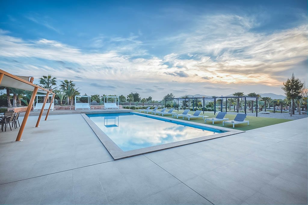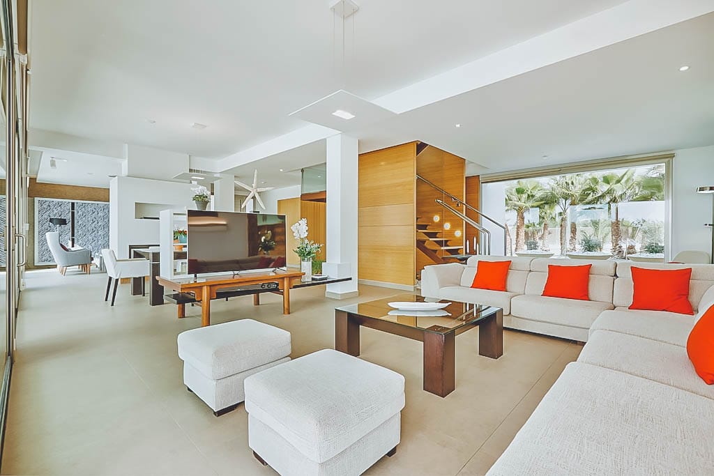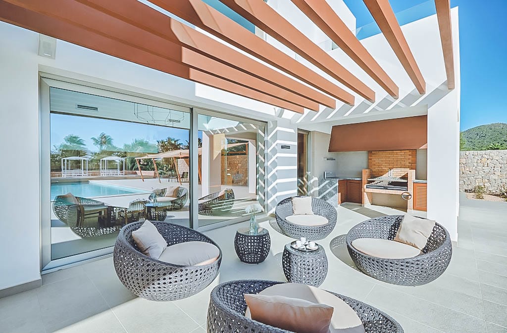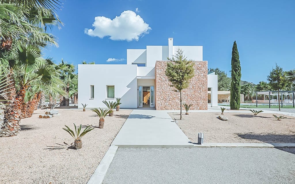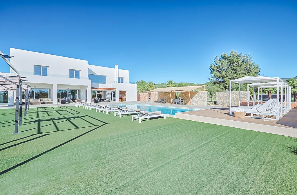 This stylish modern 7-bedroom villa is located in a quiet residential area of Jesús, close to Ibiza Town and a short drive from Talamanca beach.