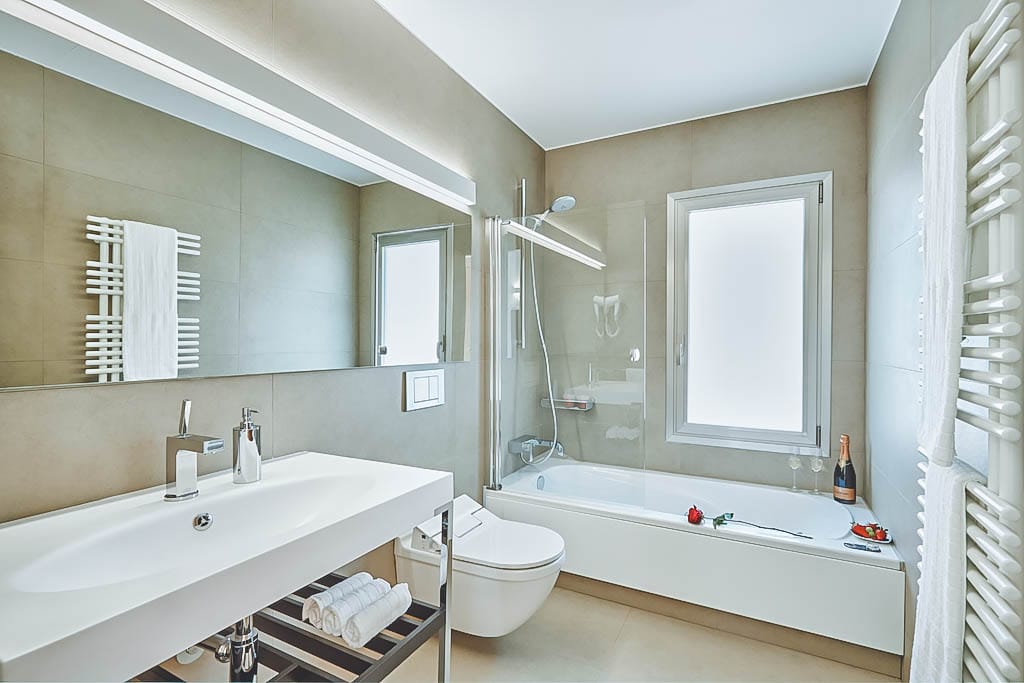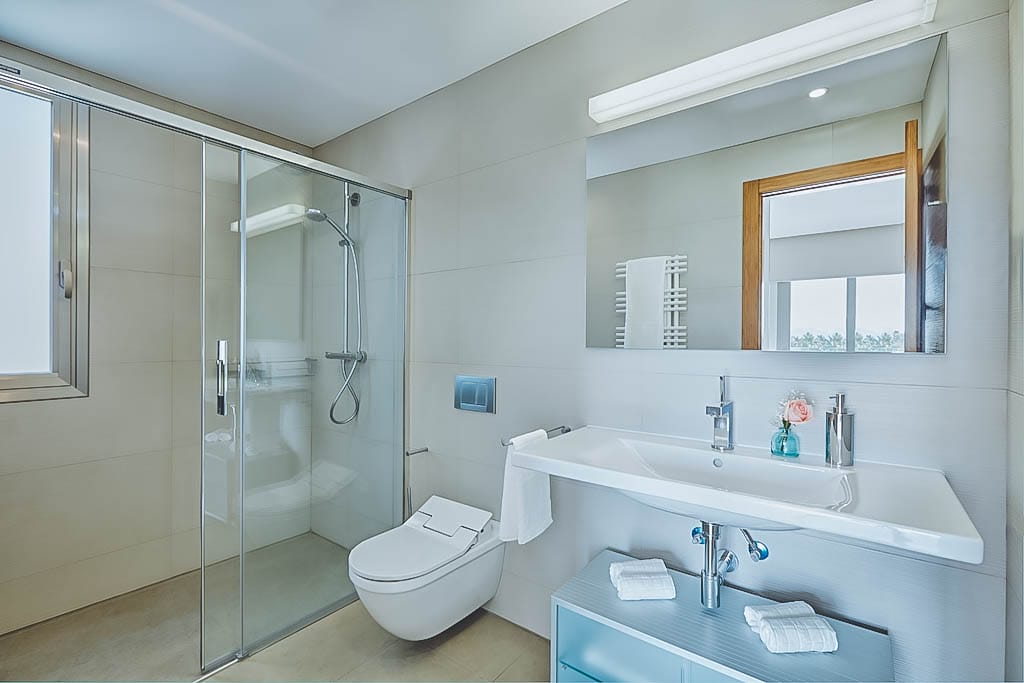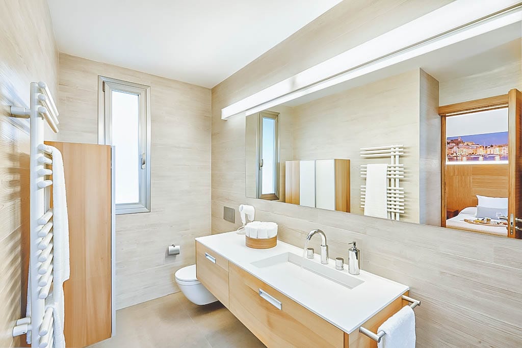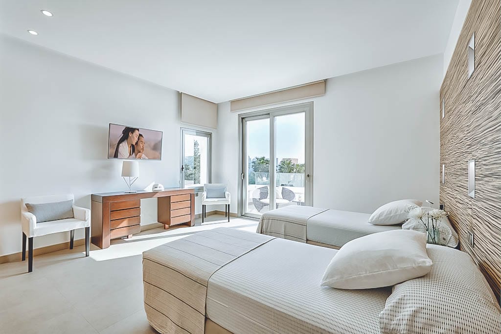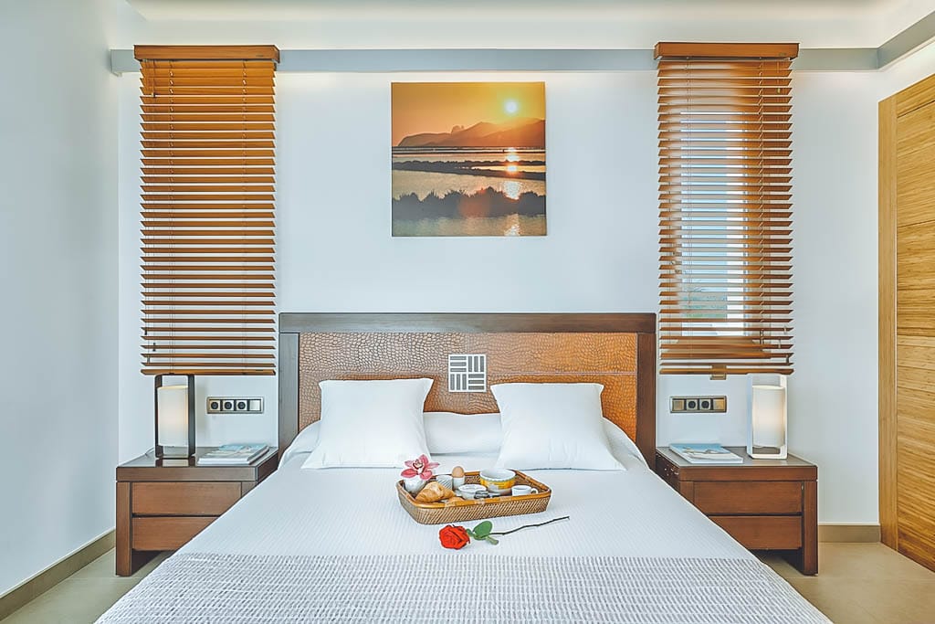 - 5 bedrooms (3 doubles + 1 twin + 1 smaller double), all with en-suite bathrooms (one with jacuzzi bath). Some offer private or shared terraces.