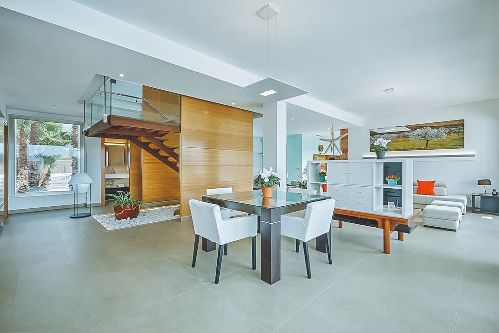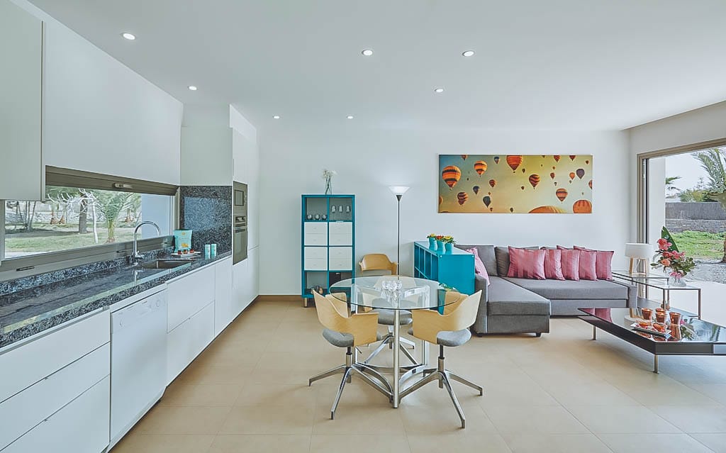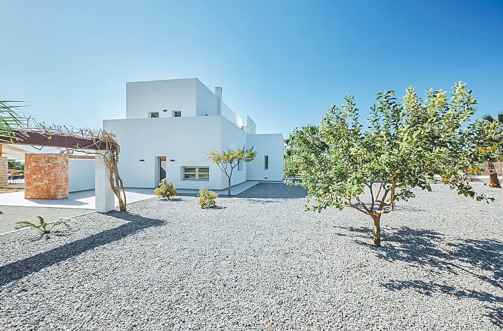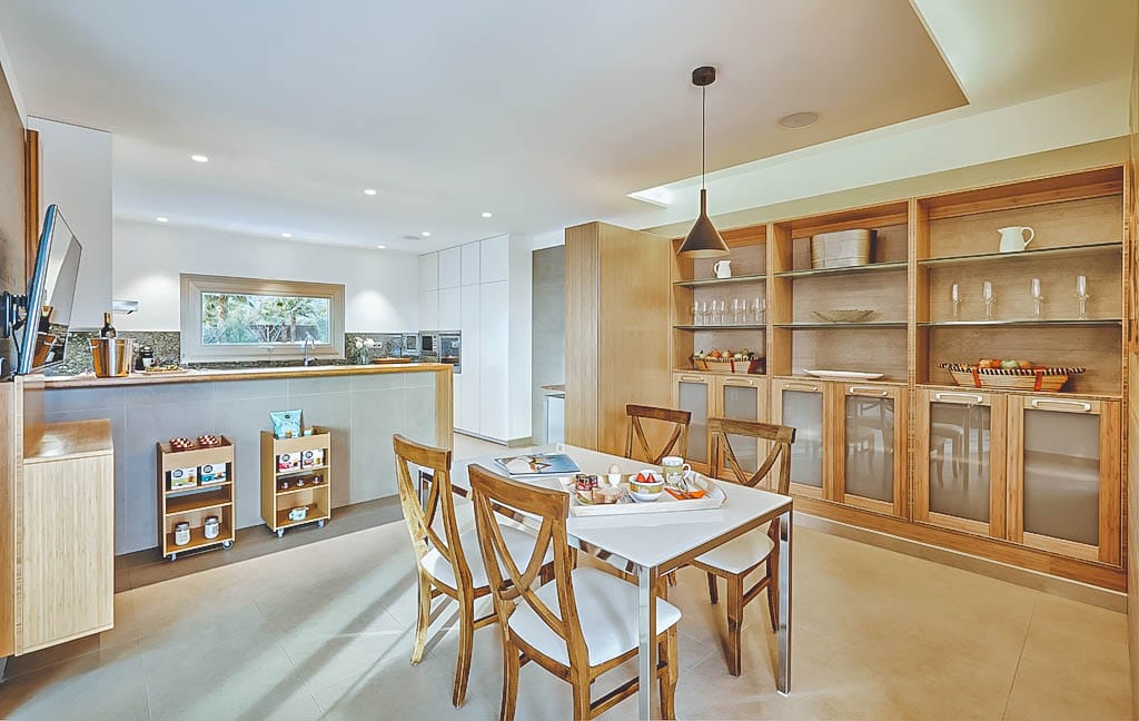 The immaculate interiors feature minimalist decor with neutral tones, a bright entrance hall, spacious lounge, fully equipped kitchen, and dining area with garden and pool views.