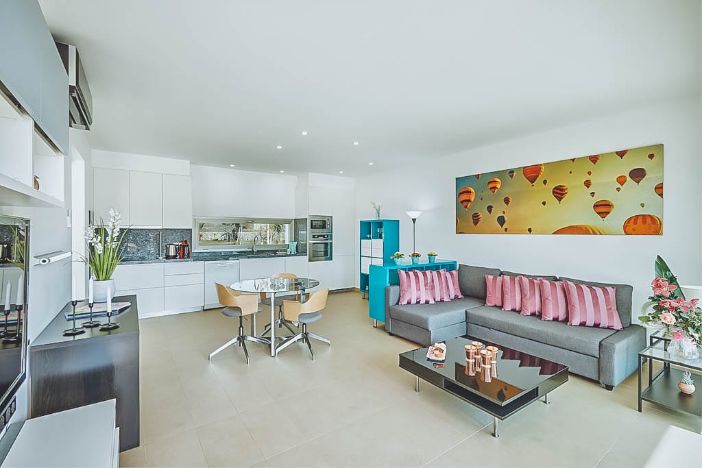 - Modern living room, kitchen, and 2 further en-suite bedrooms (1 double + 1 twin).