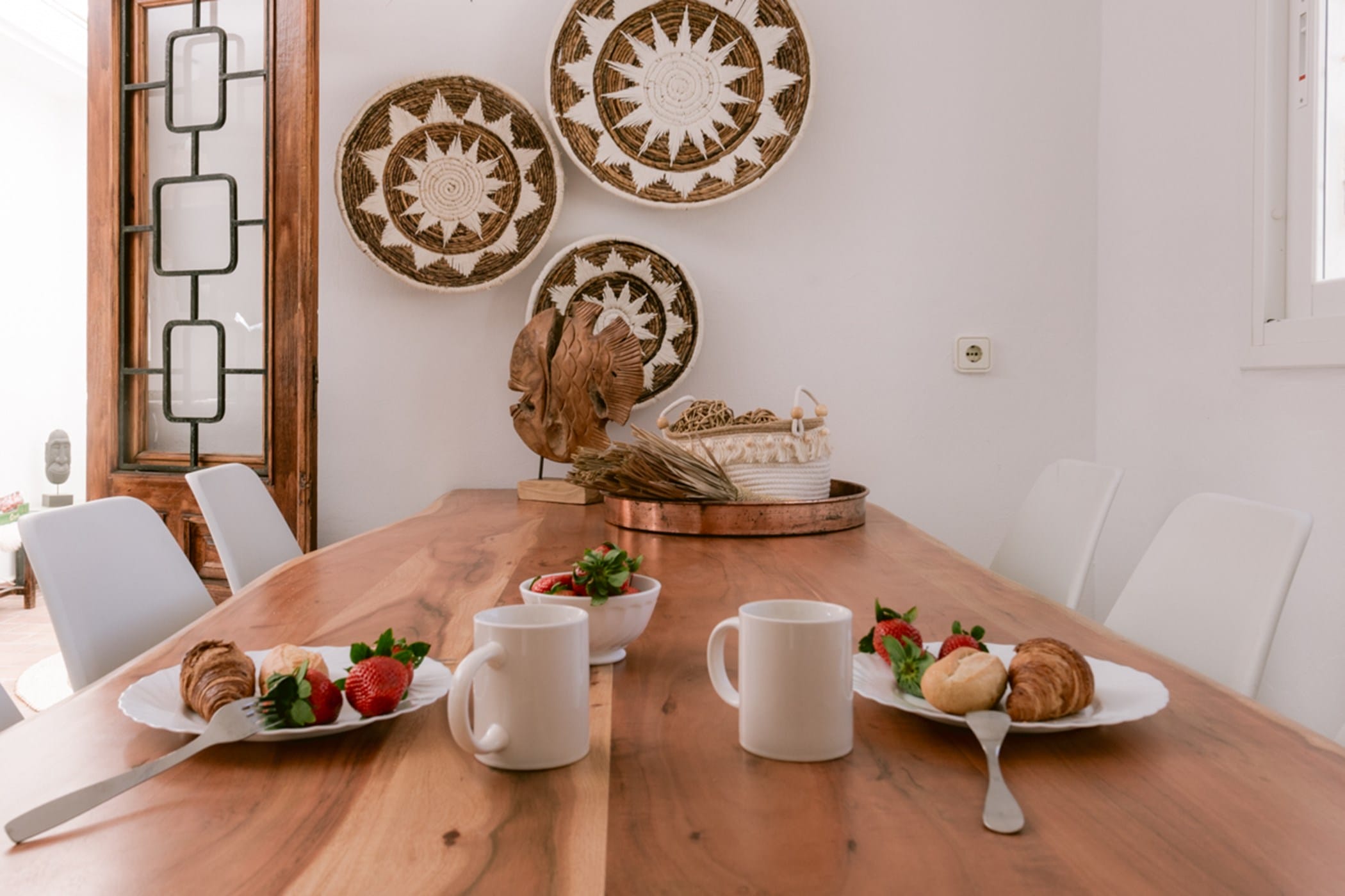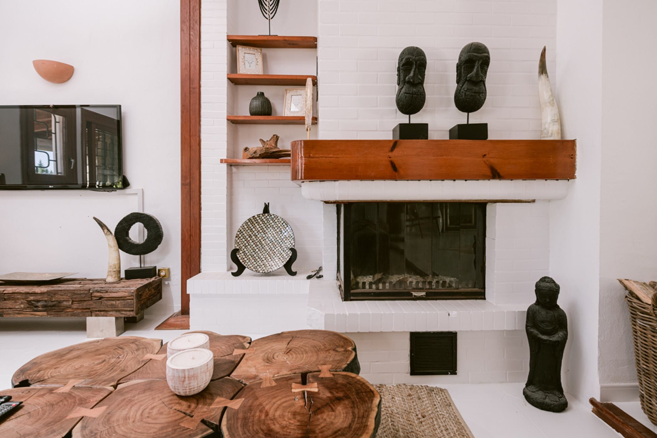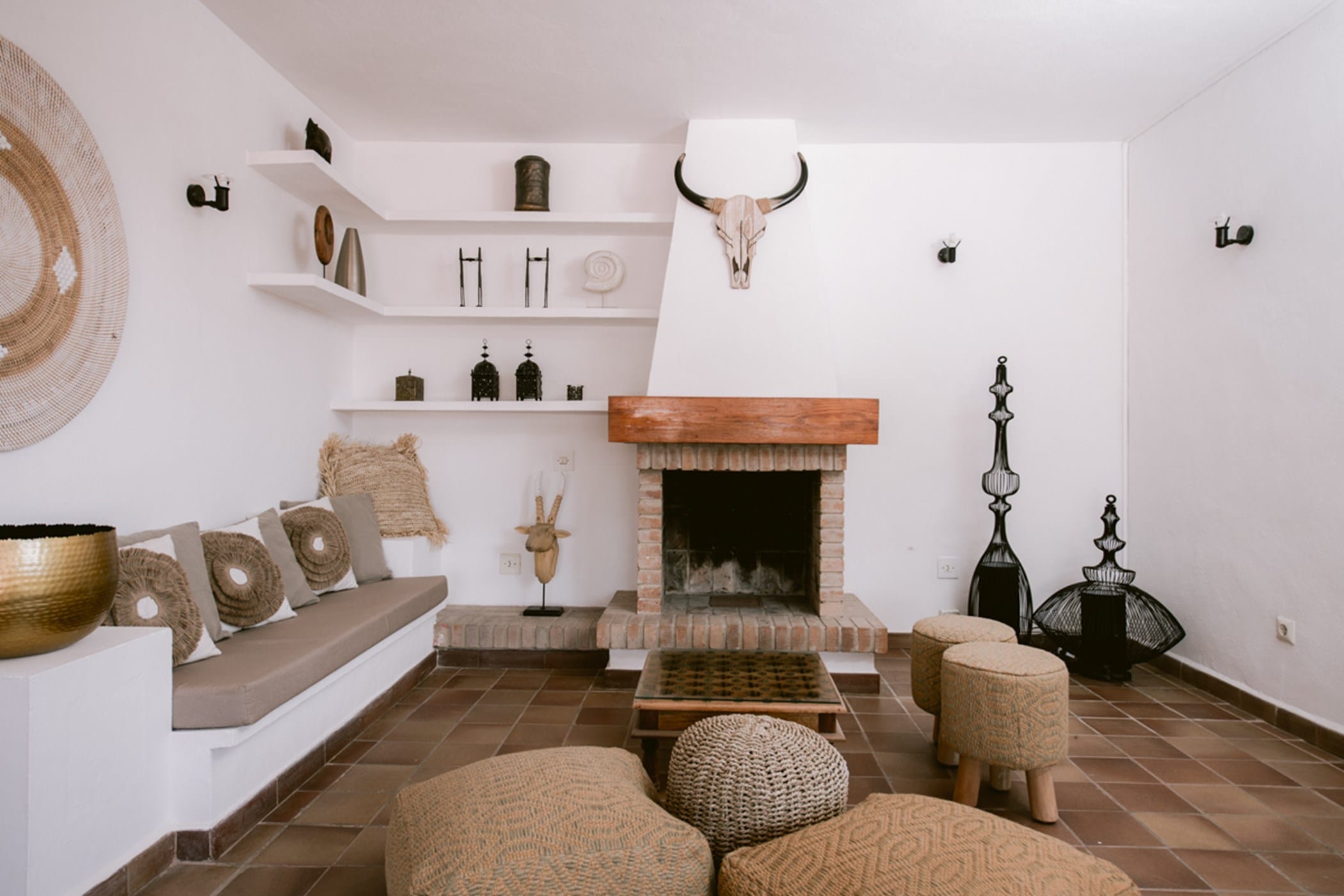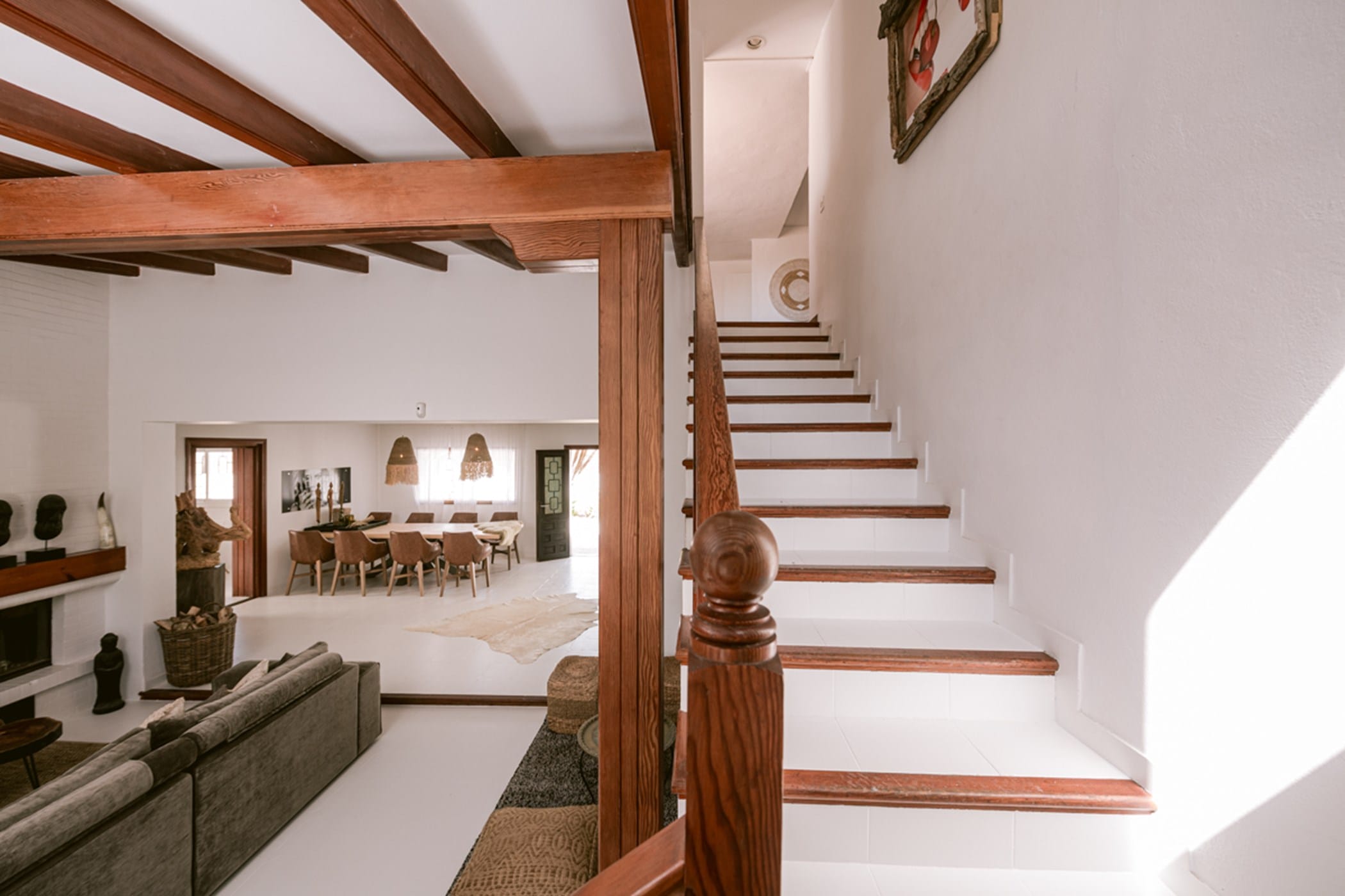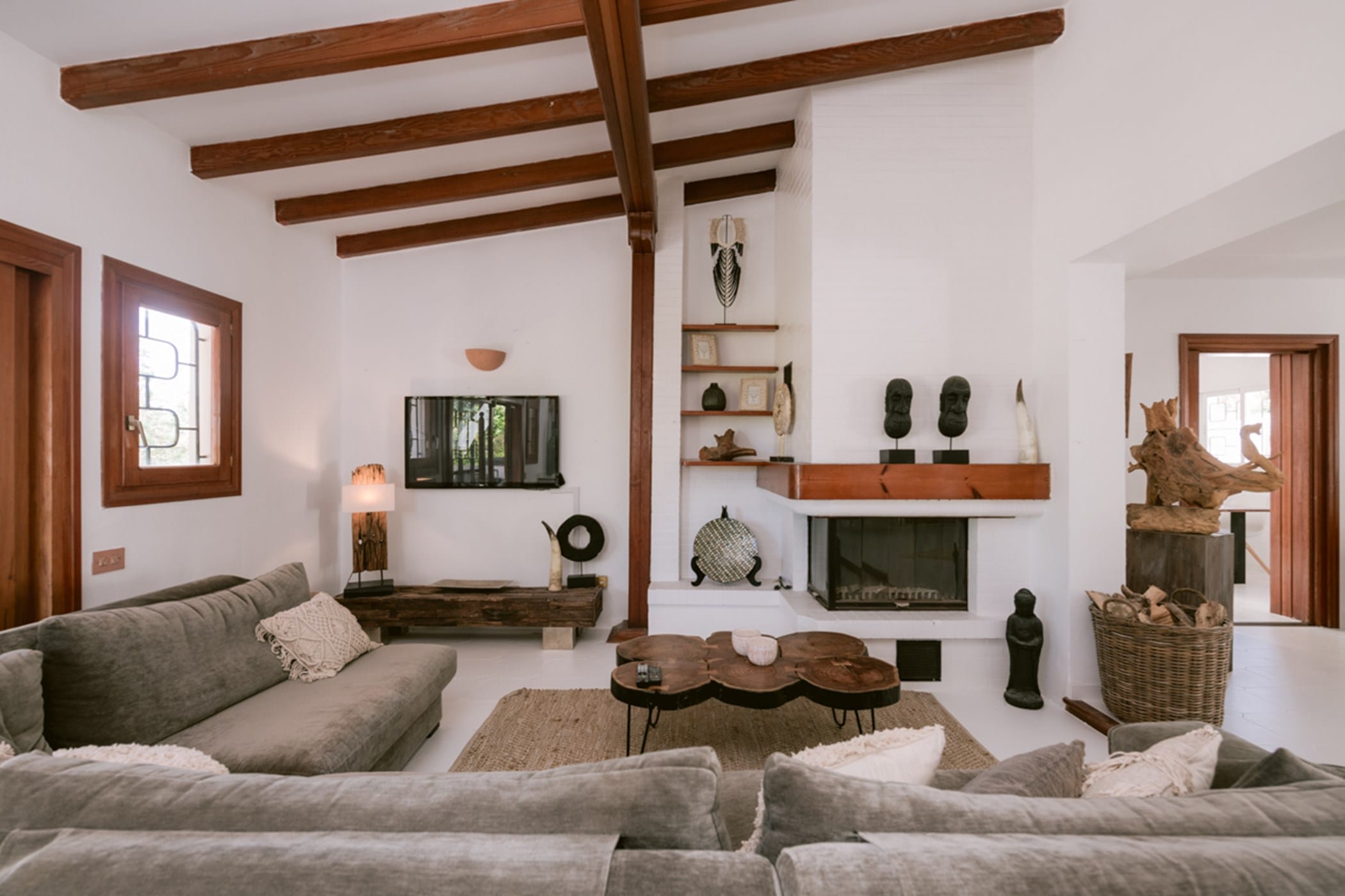 The bright, spacious interiors feature a welcoming living room with fireplace, a long dining table, and a fully equipped kitchen. All seven bedrooms are uniquely decorated and air-conditioned, with generous wardrobes. The master suite includes a private en-suite, while additional bathrooms serve the remaining rooms. A second relaxation space with fireplace and large terrace sits on the top floor.