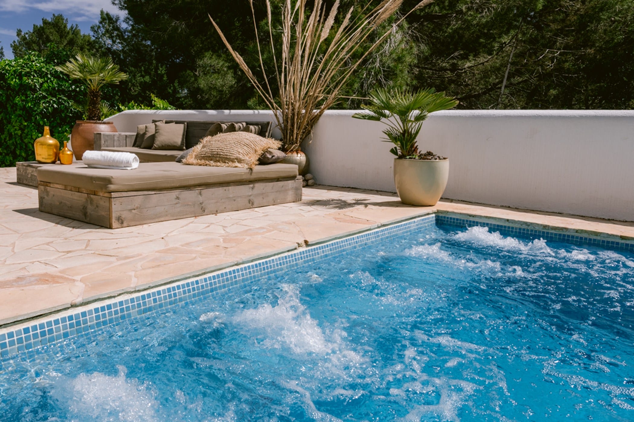 This stylish 7-bedroom villa masterfully blends modern Ibiza living with warm Tulum-inspired design. Set in San Rafael, it offers a peaceful yet central location — just 8 minutes from Ibiza Town and 10 minutes from the airport, with easy access to both west and southeast beaches.