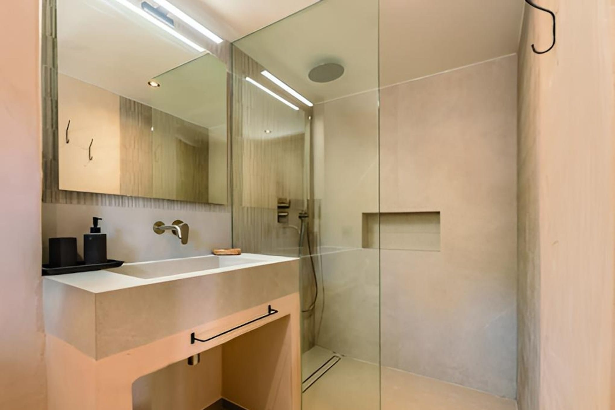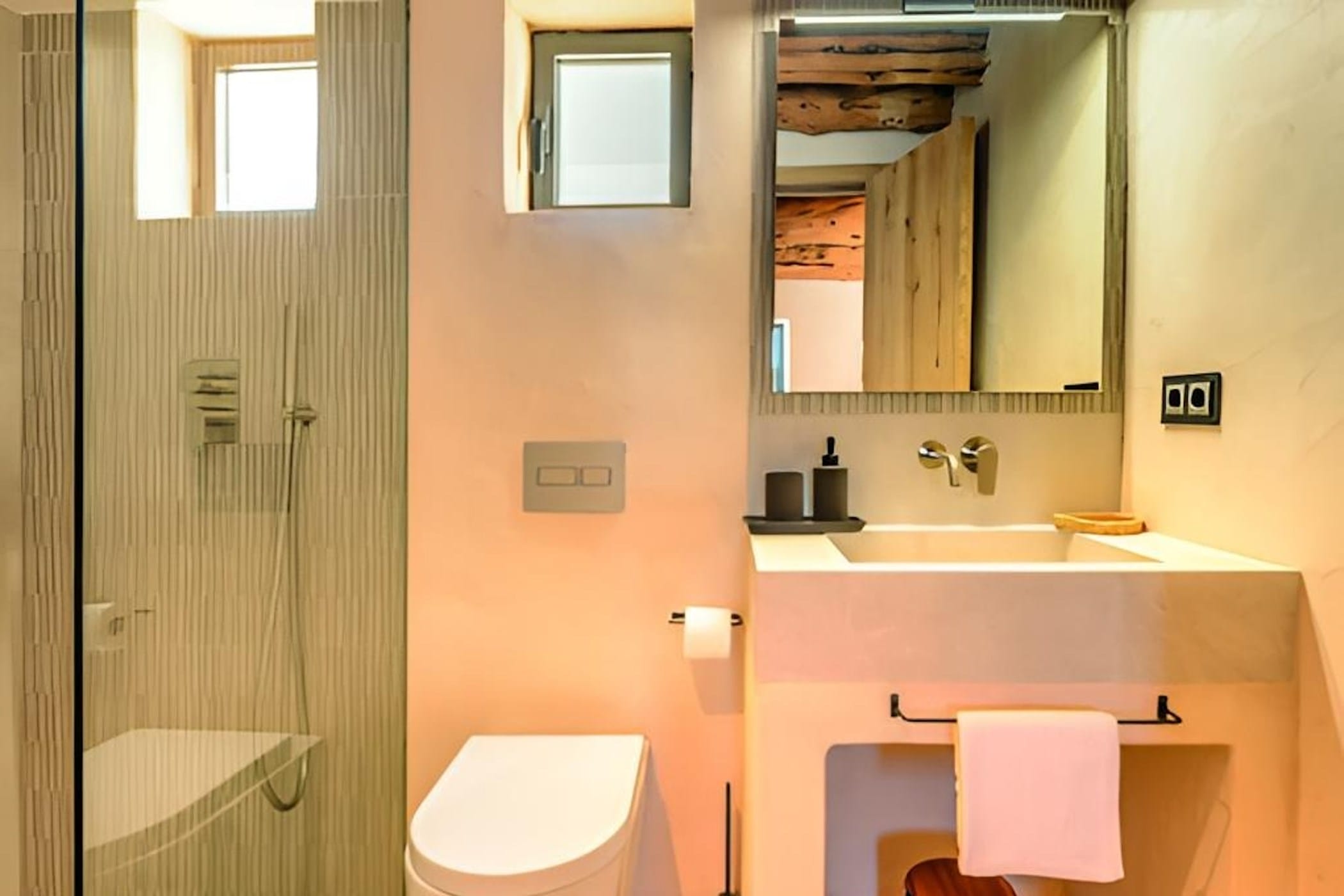 The bright, well-designed interiors feature a spacious living area, a fully equipped kitchen, and high-speed Wi-Fi. All seven bedrooms are located on the lower floor, each with a double bed and en-suite bathroom. One bedroom enjoys direct access to a private terrace with jacuzzi.