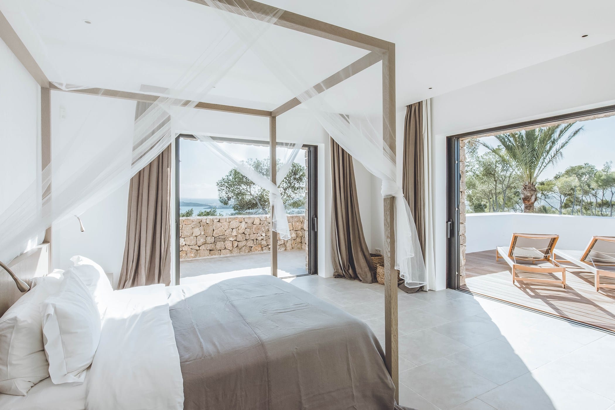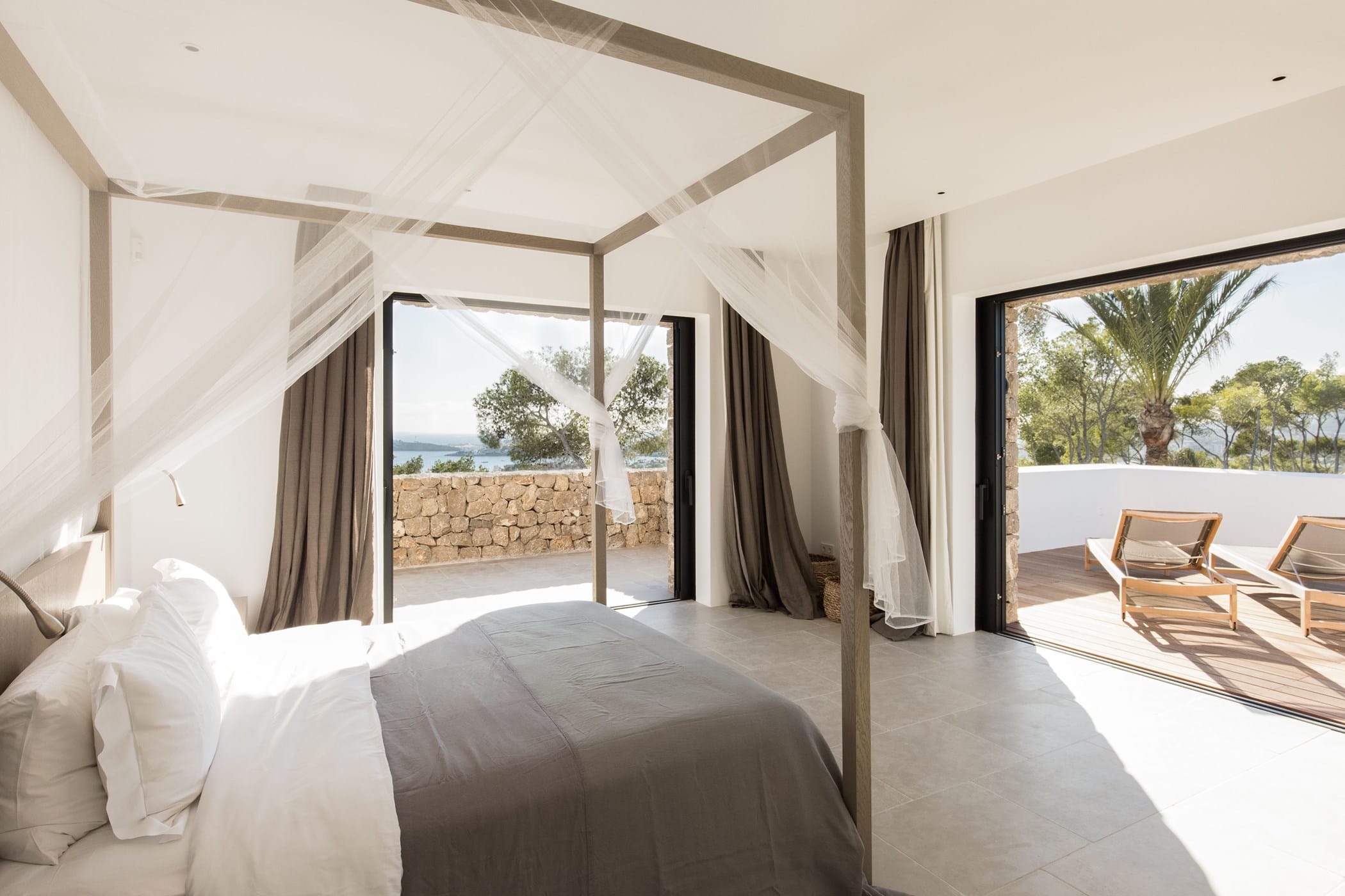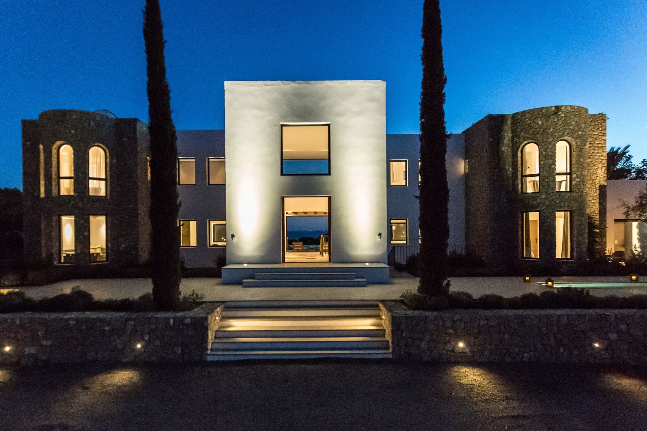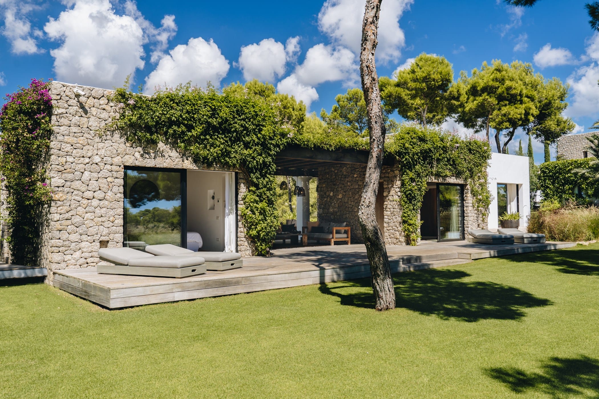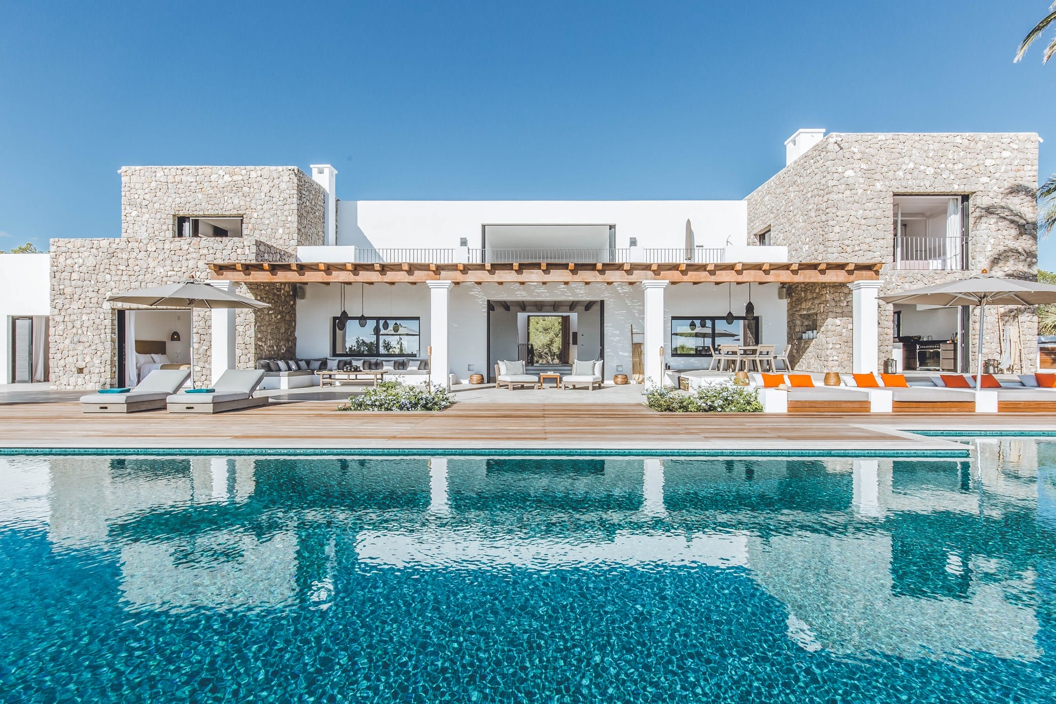 The interiors masterfully blend contemporary elegance with traditional Ibizan touches, featuring spacious lounges, a fully equipped open-plan kitchen with breakfast bar, and exceptional furnishings throughout. The two master suites include king-size beds and private terraces, while the remaining bedrooms offer double beds with private or adjoining bathrooms. Three separate guest houses provide additional privacy and sea views.