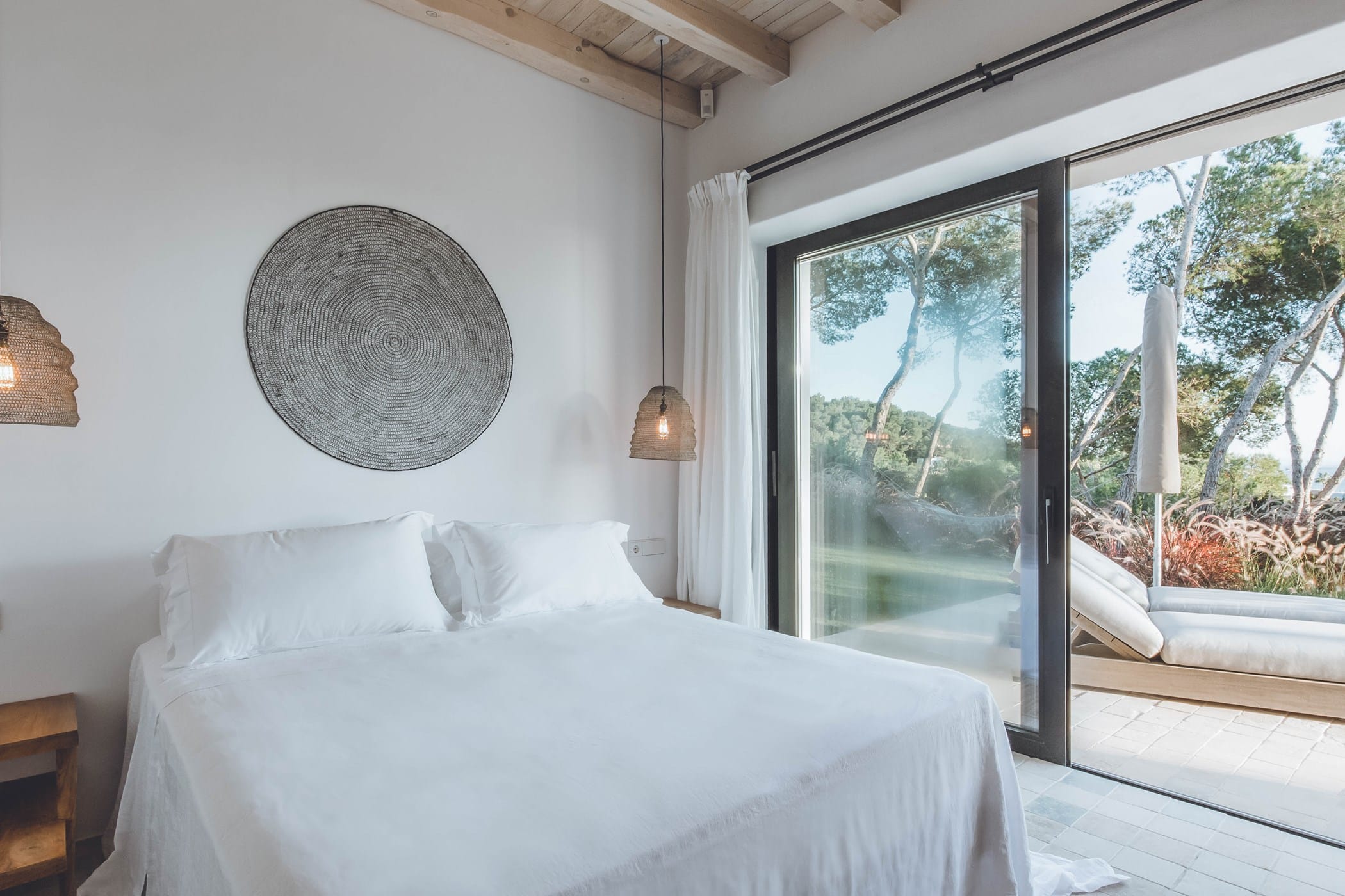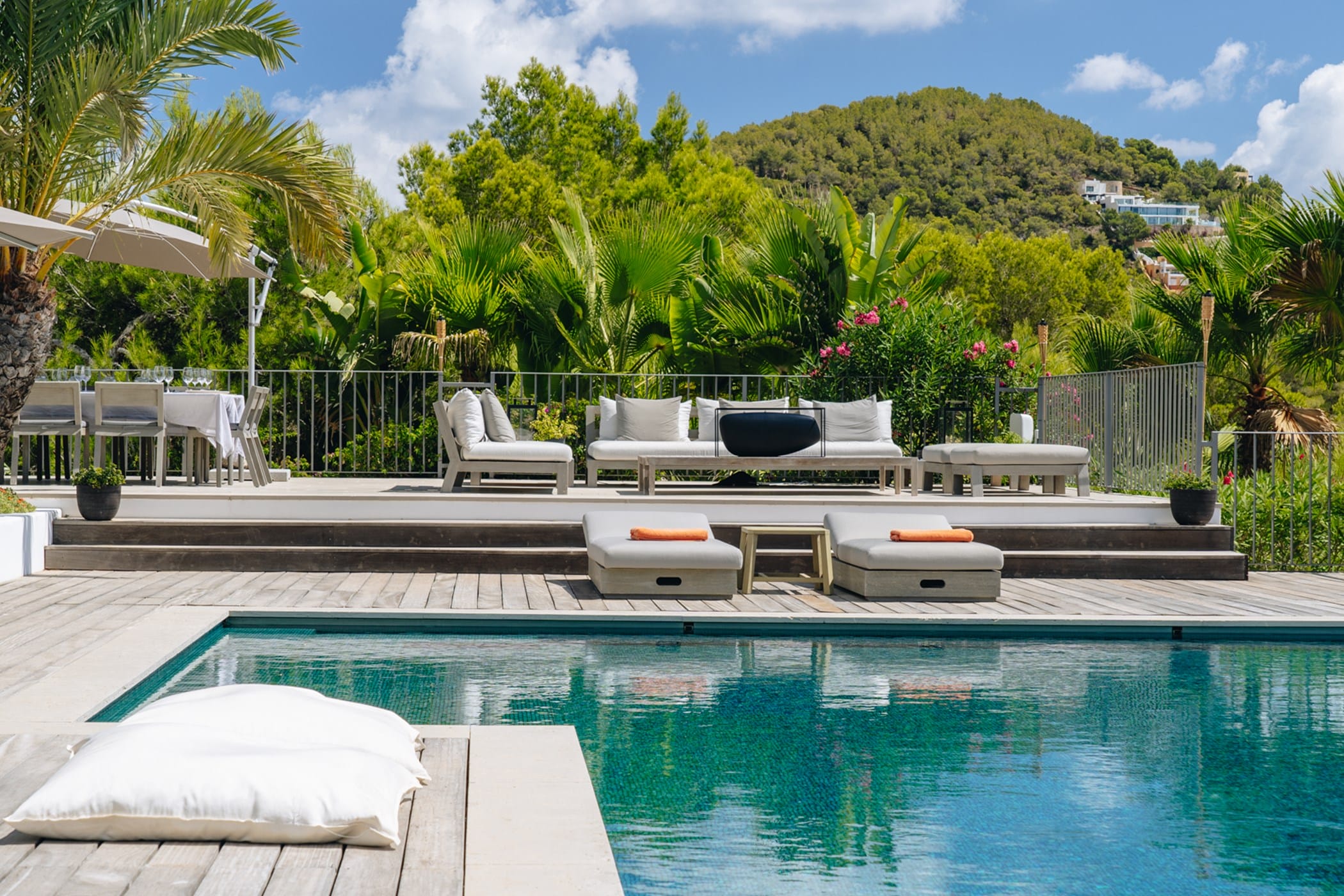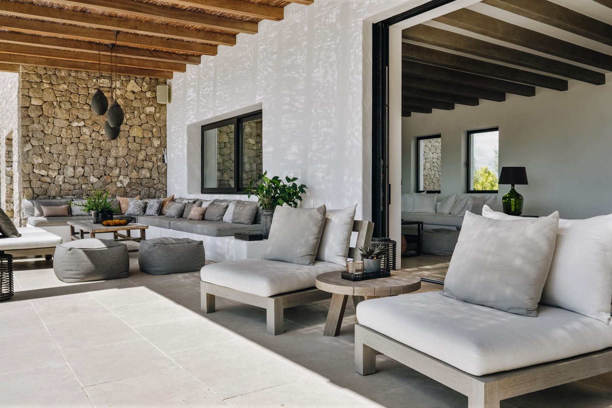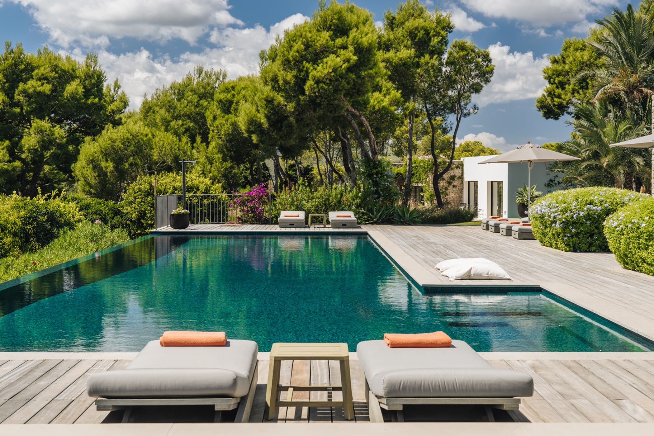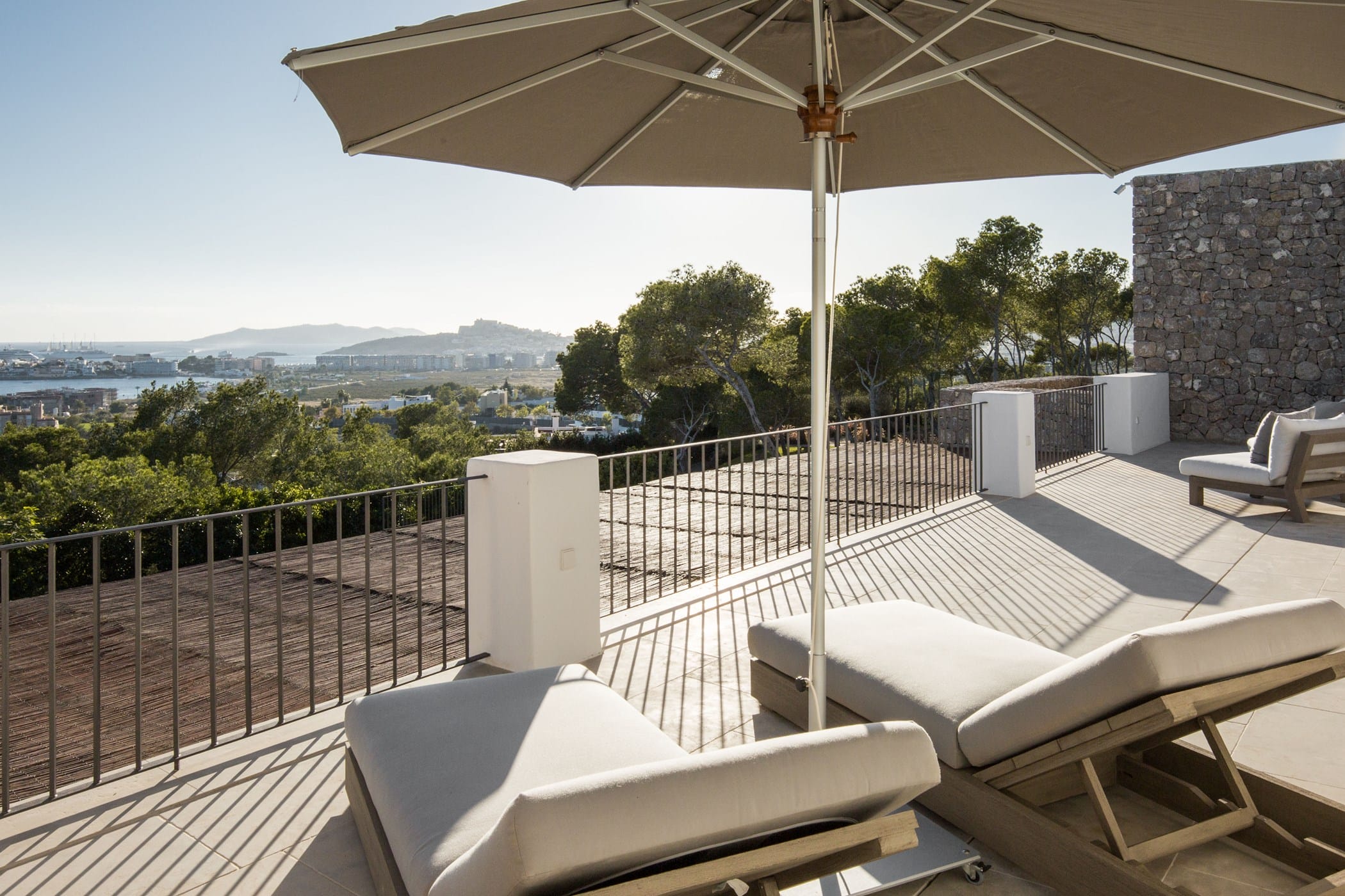The interiors masterfully blend contemporary elegance with traditional Ibizan touches, featuring spacious lounges, a fully equipped open-plan kitchen with breakfast bar, and exceptional furnishings throughout. The two master suites include king-size beds and private terraces, while the remaining bedrooms offer double beds with private or adjoining bathrooms. Three separate guest houses provide additional privacy and sea views.