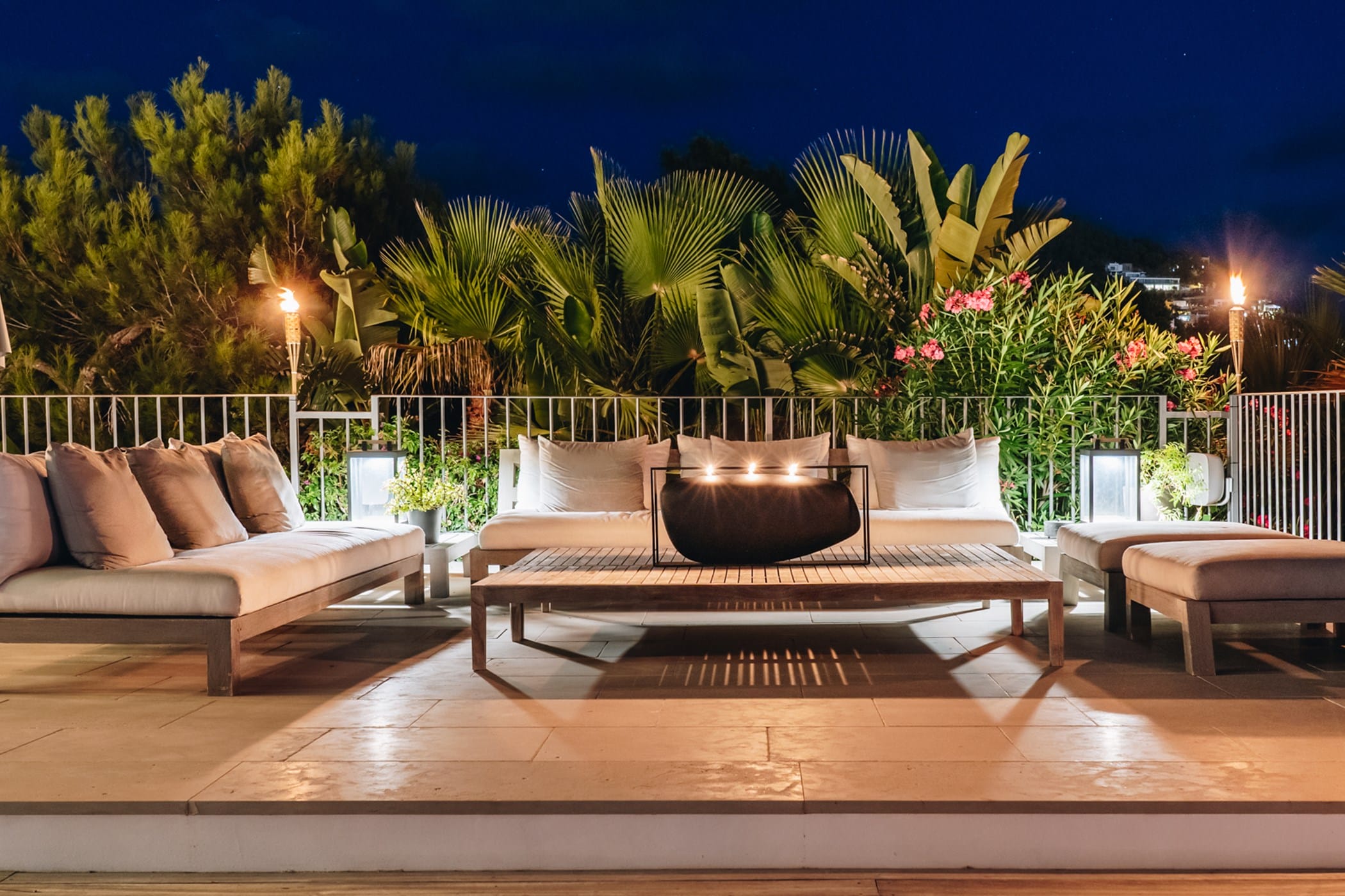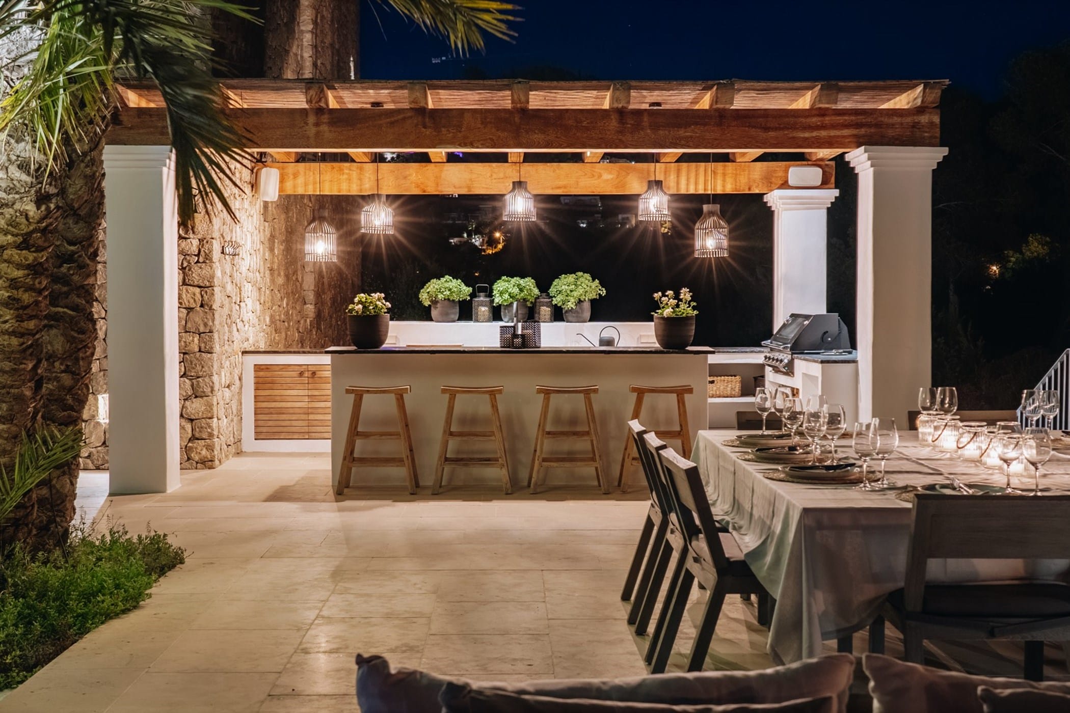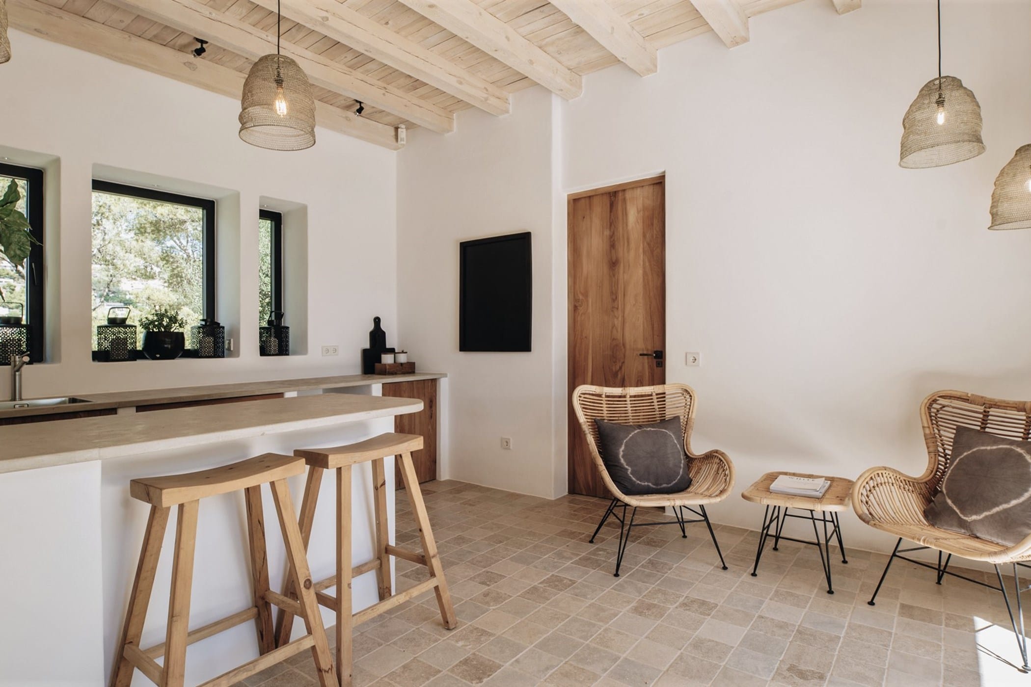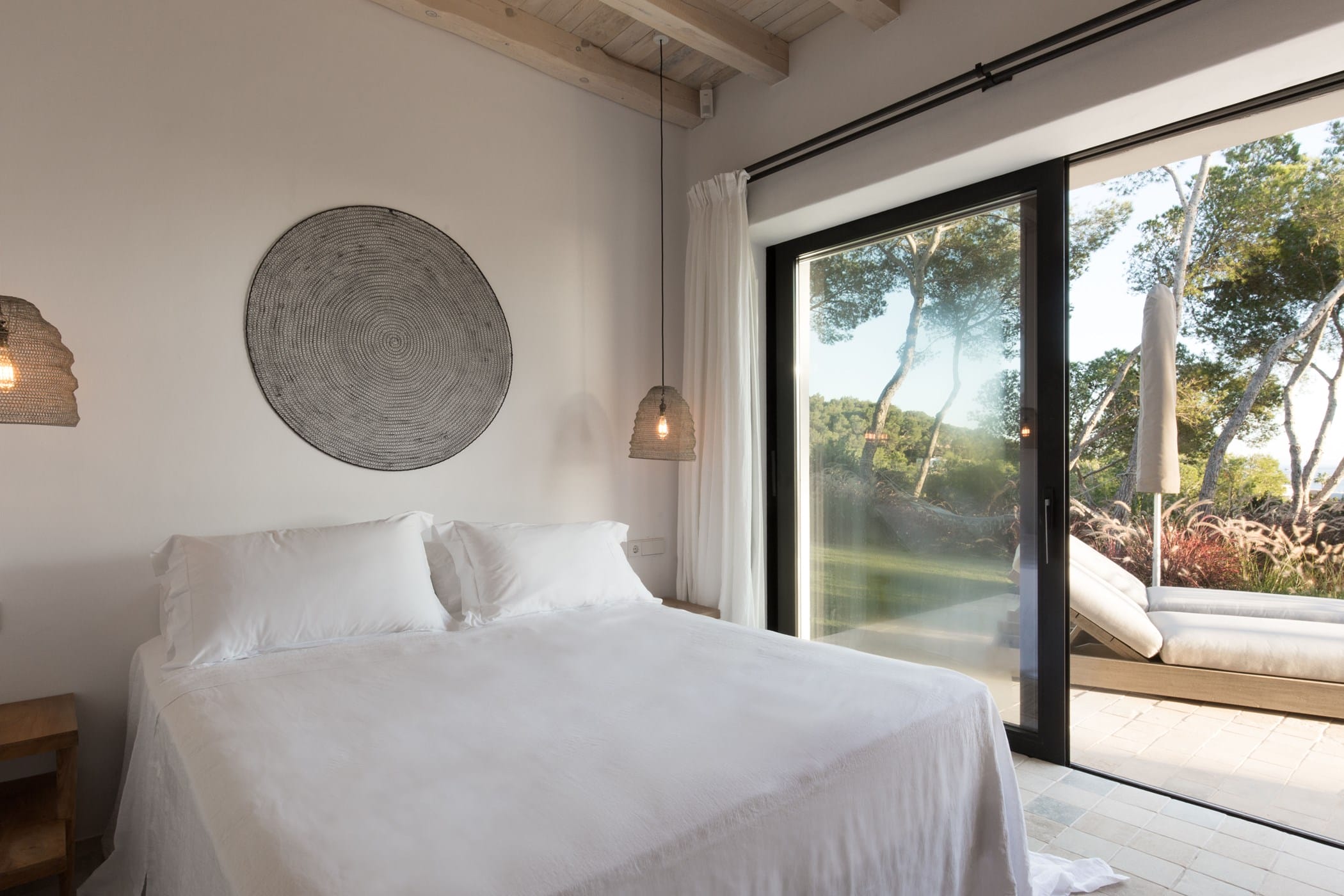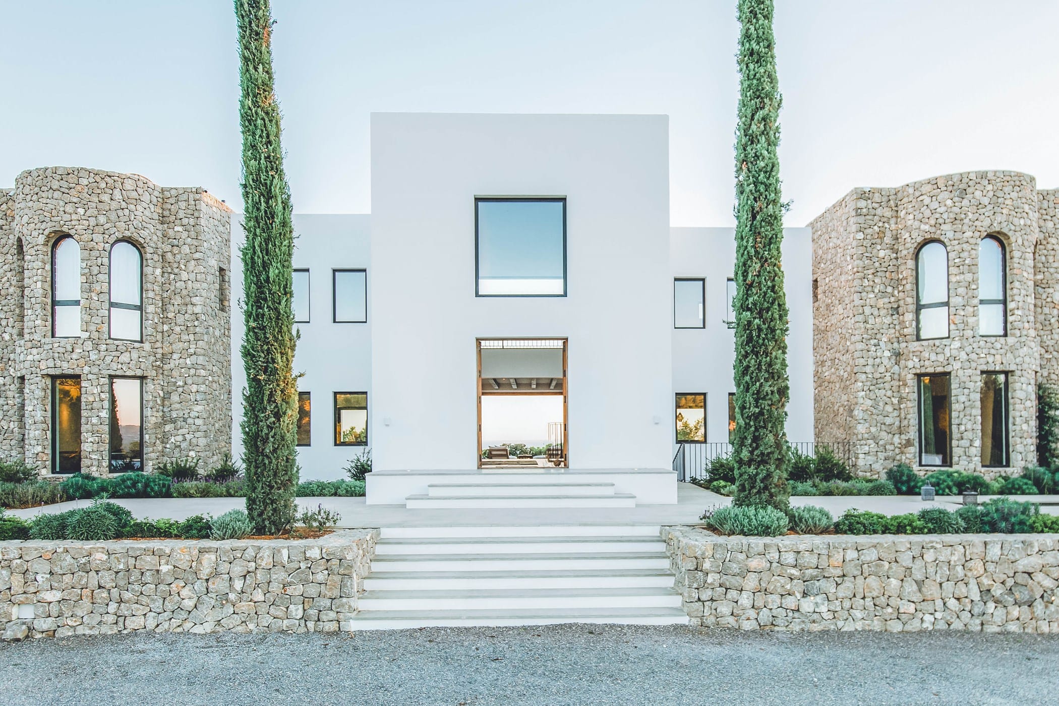 The interiors masterfully blend contemporary elegance with traditional Ibizan touches, featuring spacious lounges, a fully equipped open-plan kitchen with breakfast bar, and exceptional furnishings throughout. The two master suites include king-size beds and private terraces, while the remaining bedrooms offer double beds with private or adjoining bathrooms. Three separate guest houses provide additional privacy and sea views.