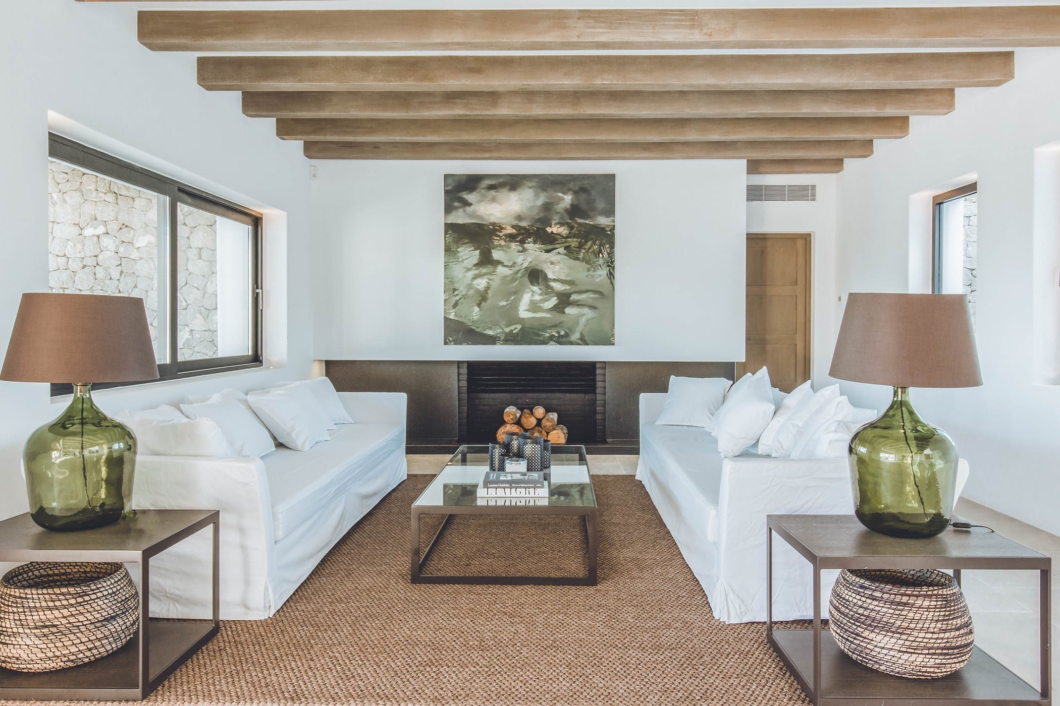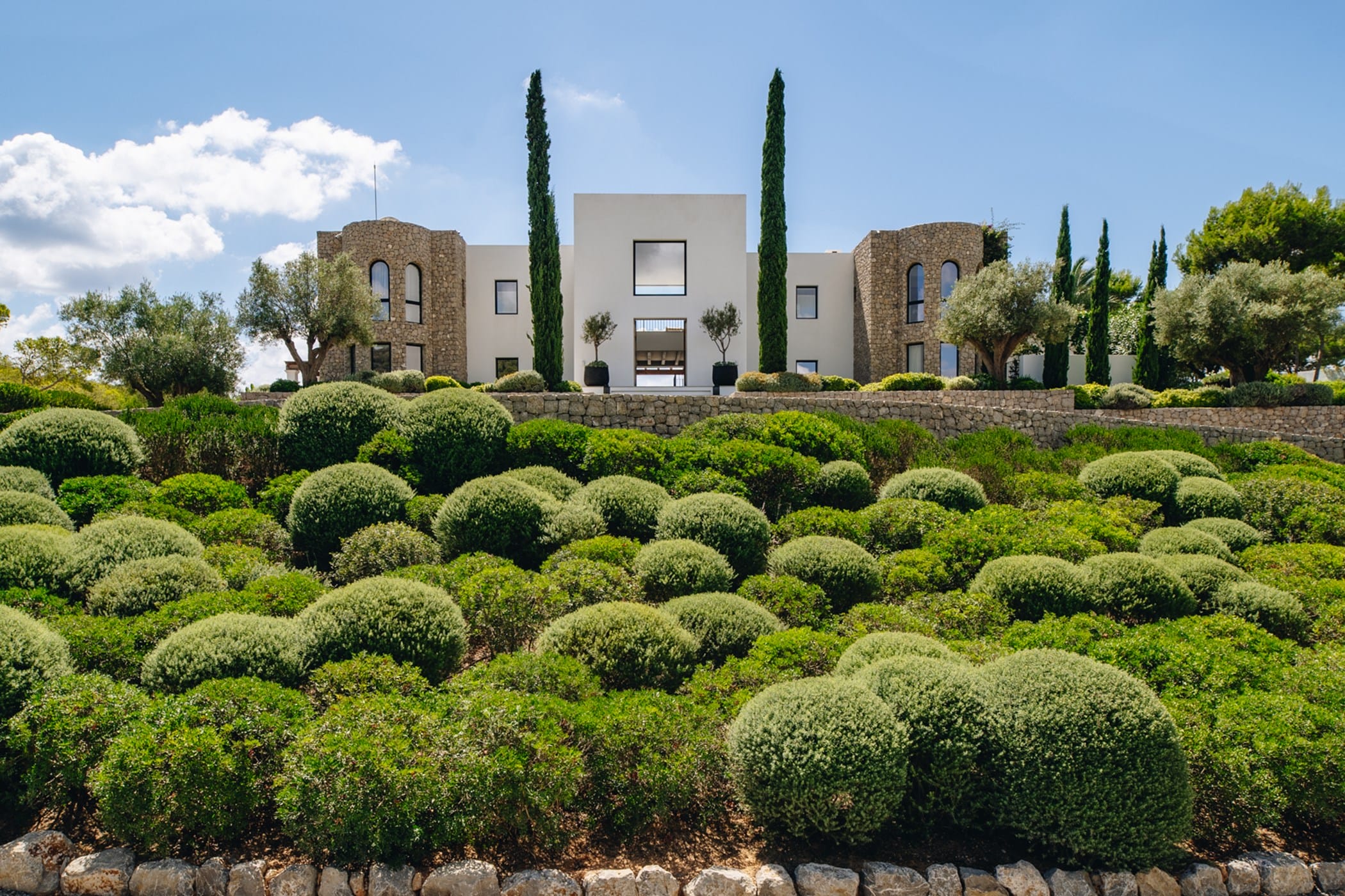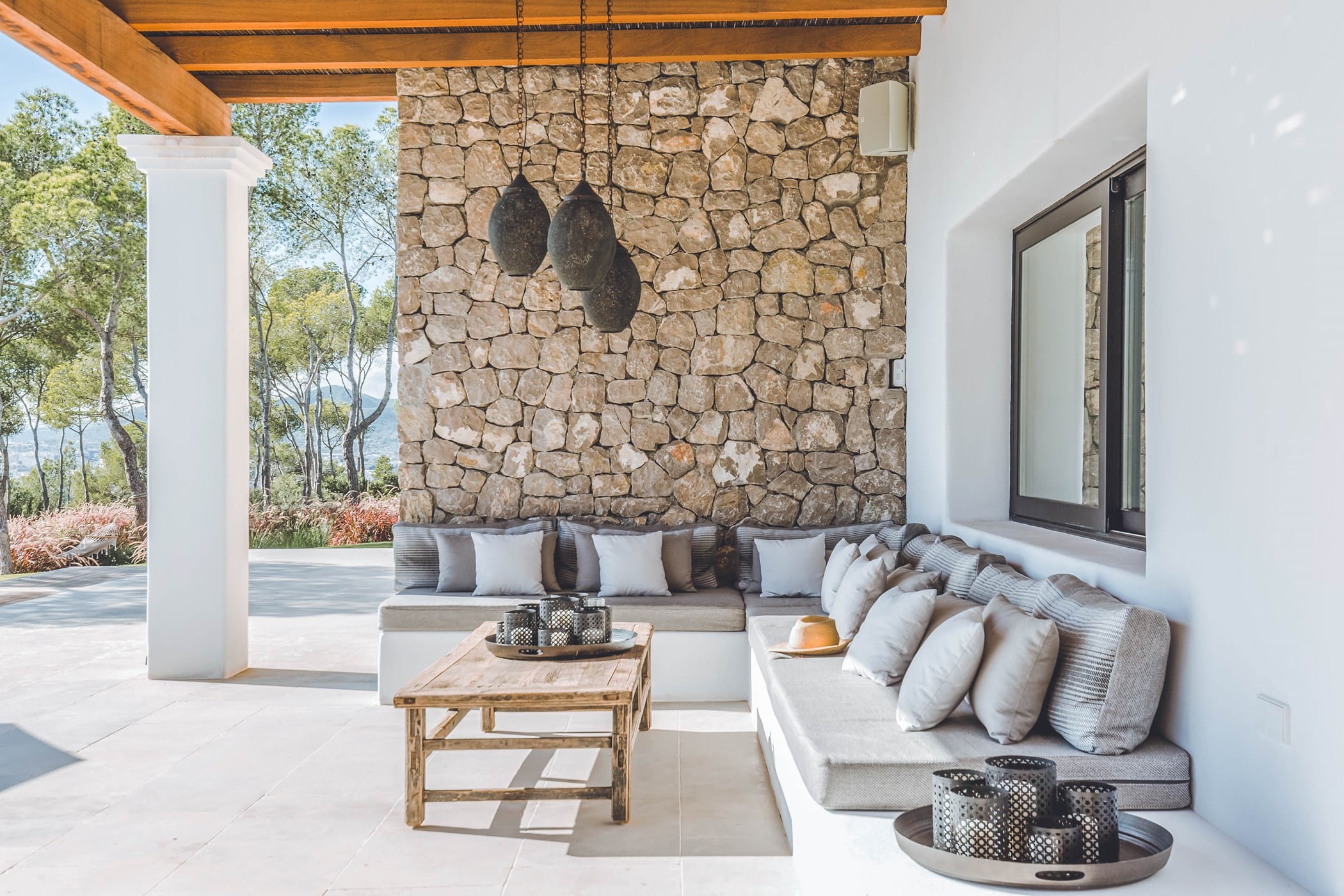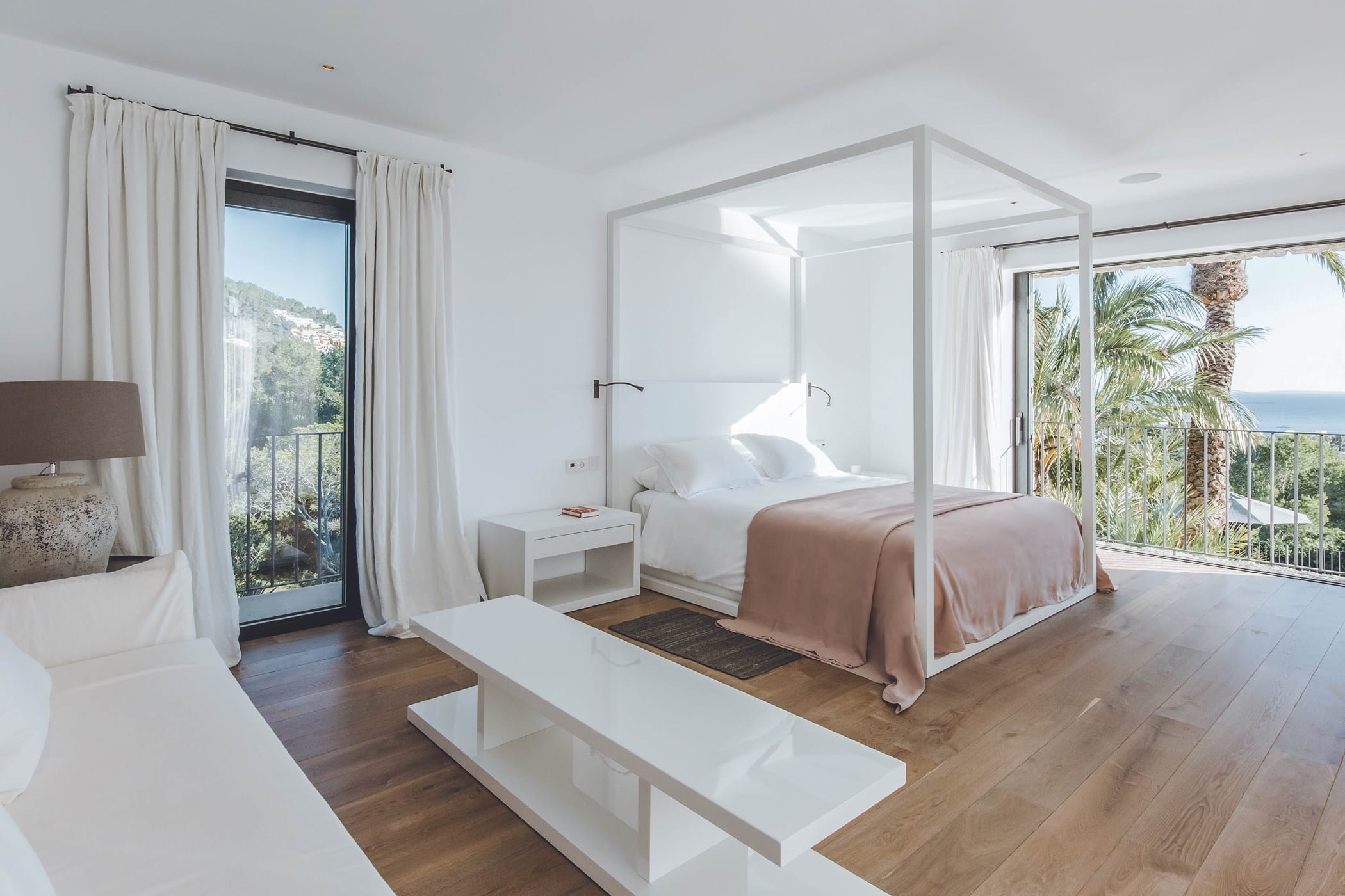 The interiors masterfully blend contemporary elegance with traditional Ibizan touches, featuring spacious lounges, a fully equipped open-plan kitchen with breakfast bar, and exceptional furnishings throughout. The two master suites include king-size beds and private terraces, while the remaining bedrooms offer double beds with private or adjoining bathrooms. Three separate guest houses provide additional privacy and sea views.