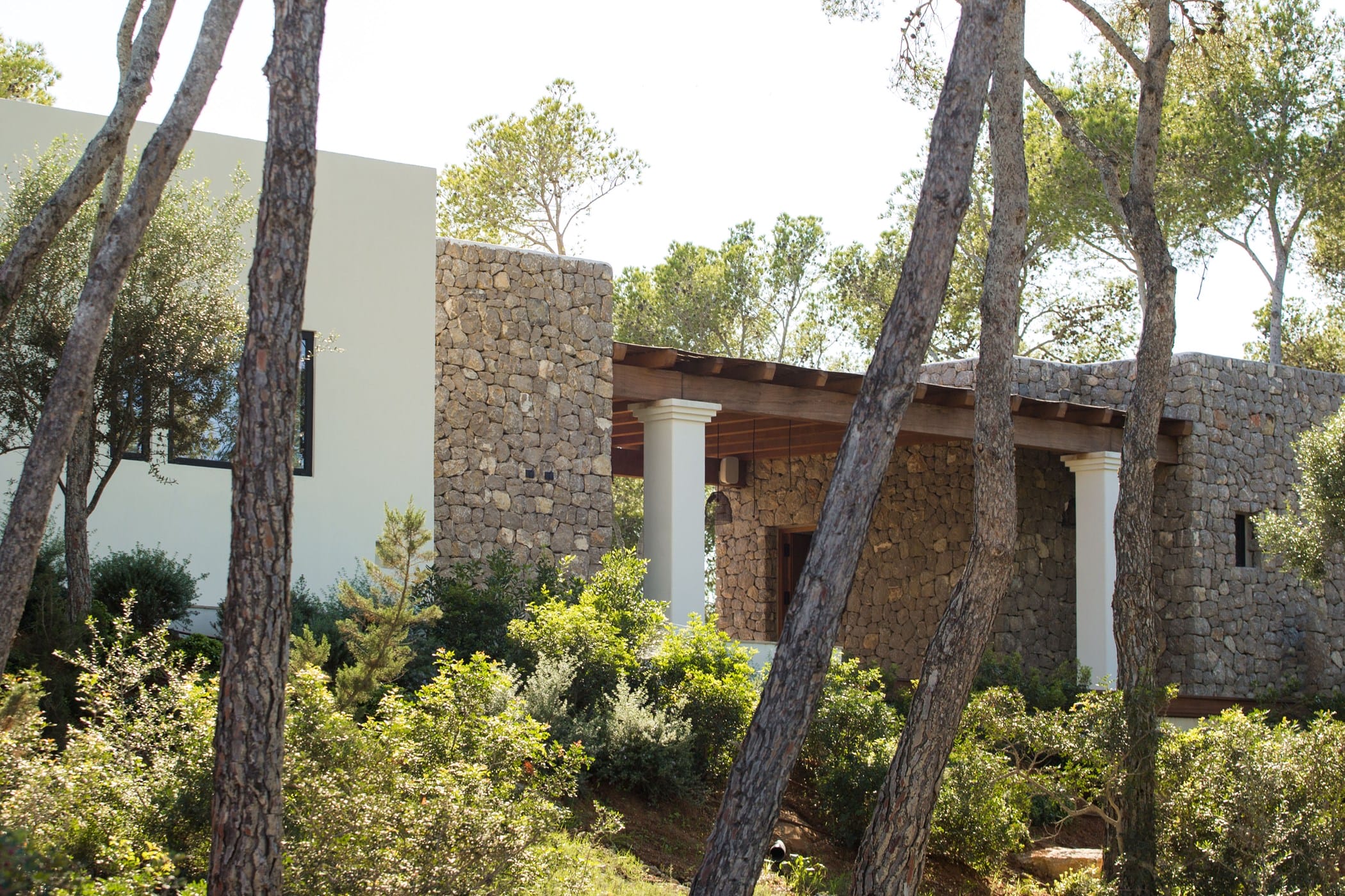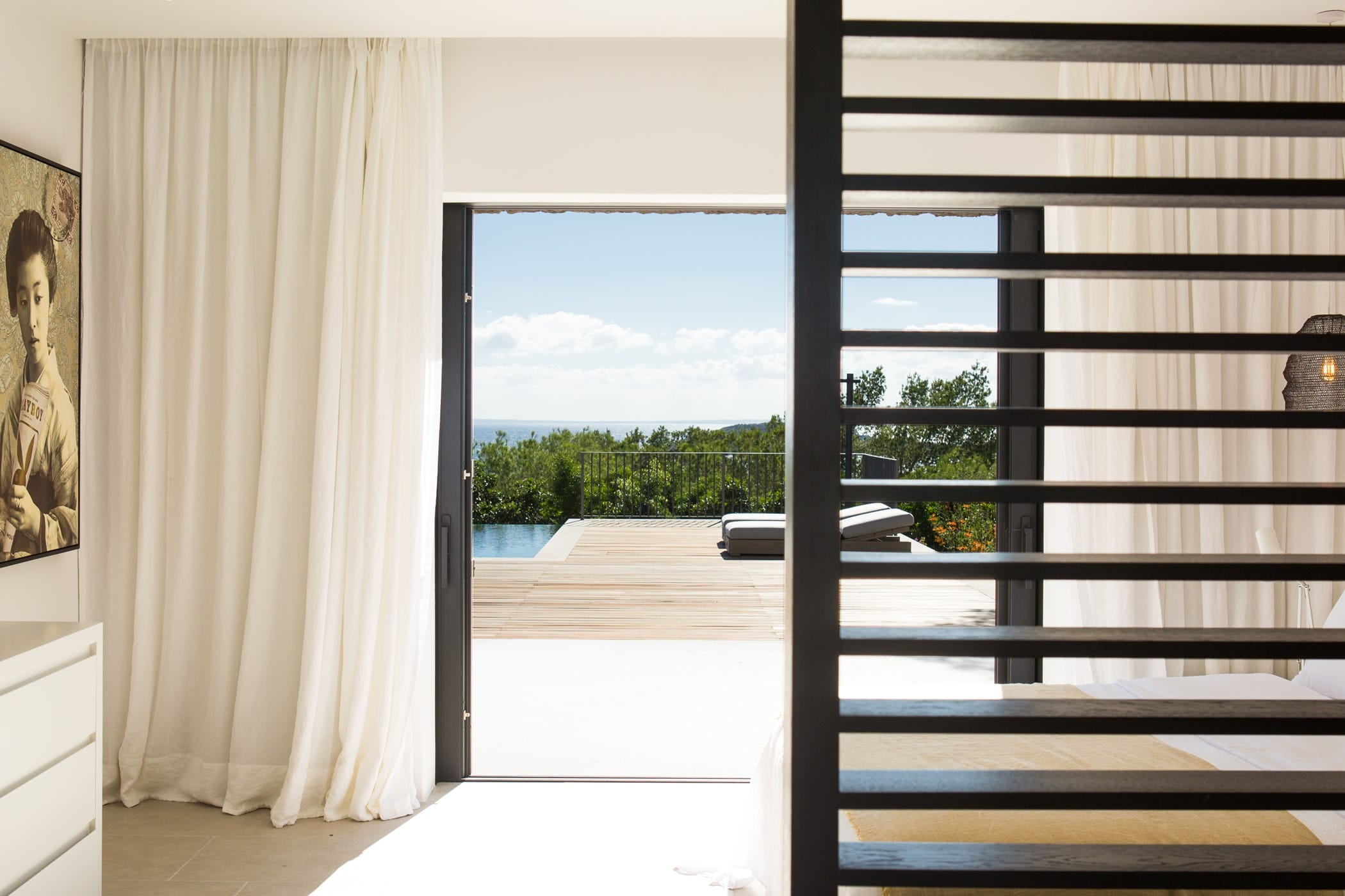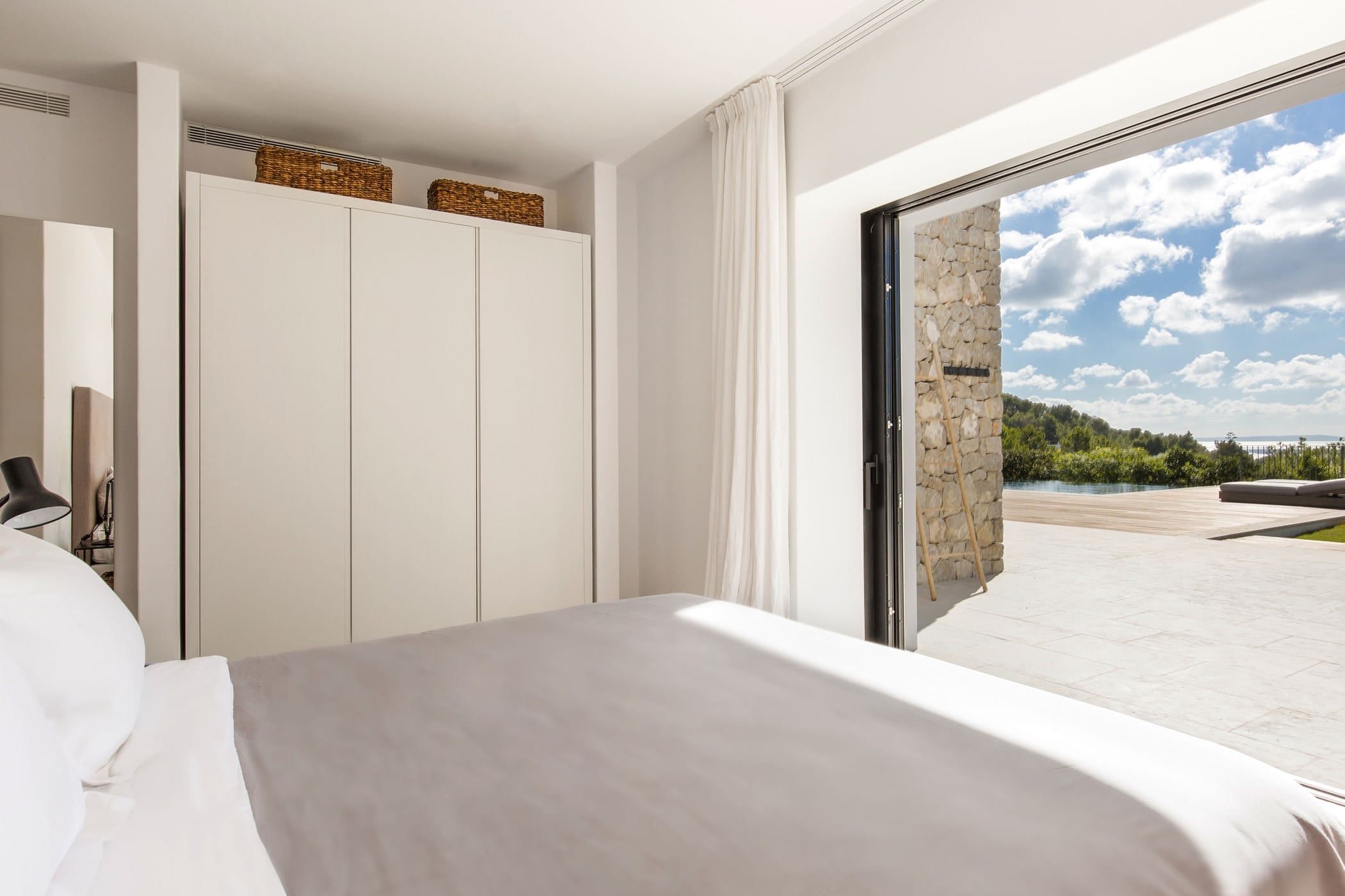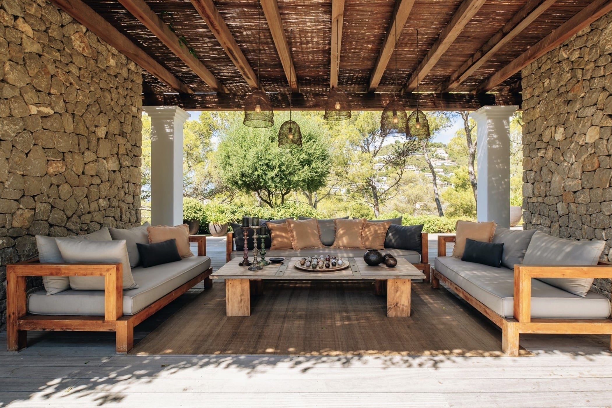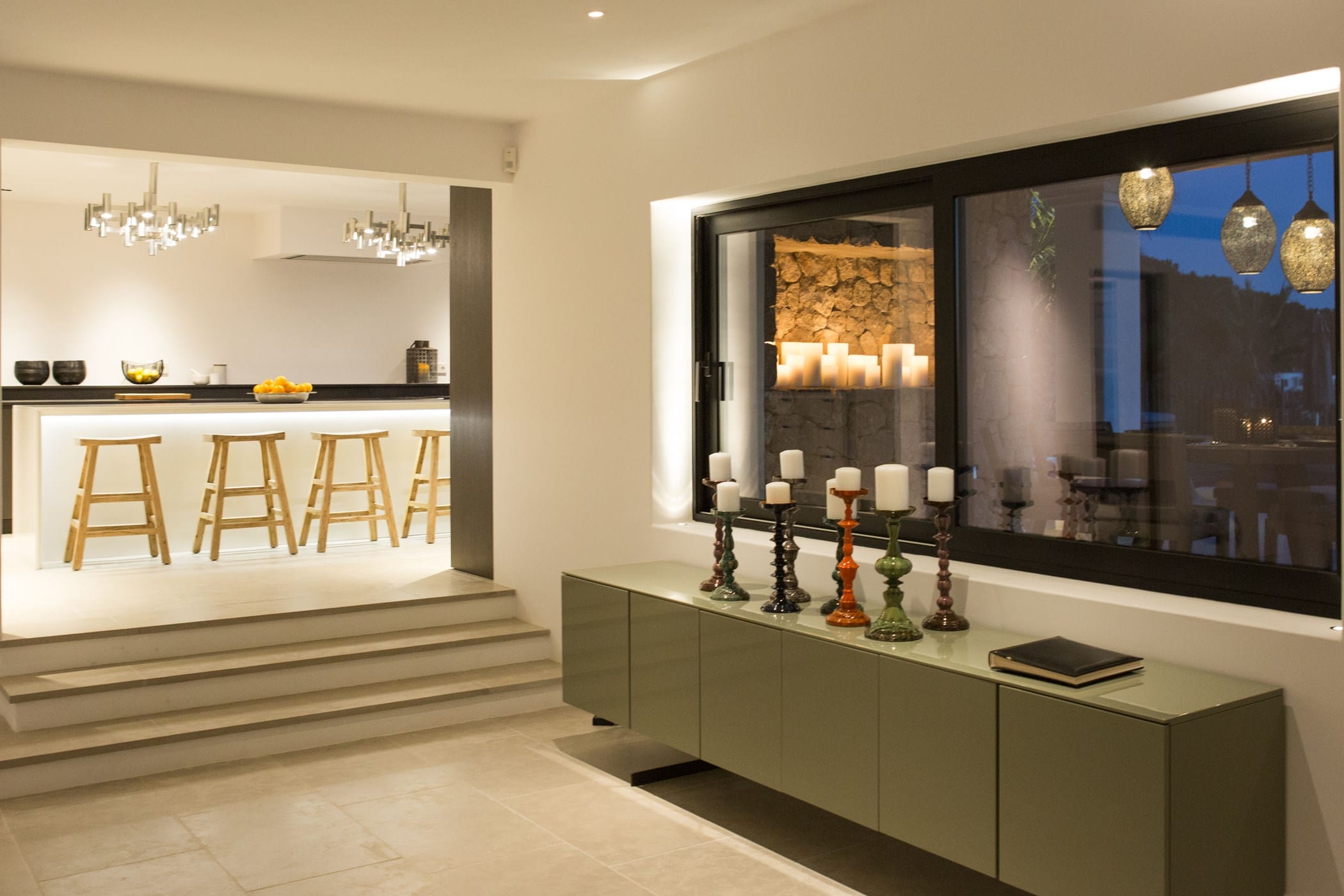 The interiors masterfully blend contemporary elegance with traditional Ibizan touches, featuring spacious lounges, a fully equipped open-plan kitchen with breakfast bar, and exceptional furnishings throughout. The two master suites include king-size beds and private terraces, while the remaining bedrooms offer double beds with private or adjoining bathrooms. Three separate guest houses provide additional privacy and sea views.
