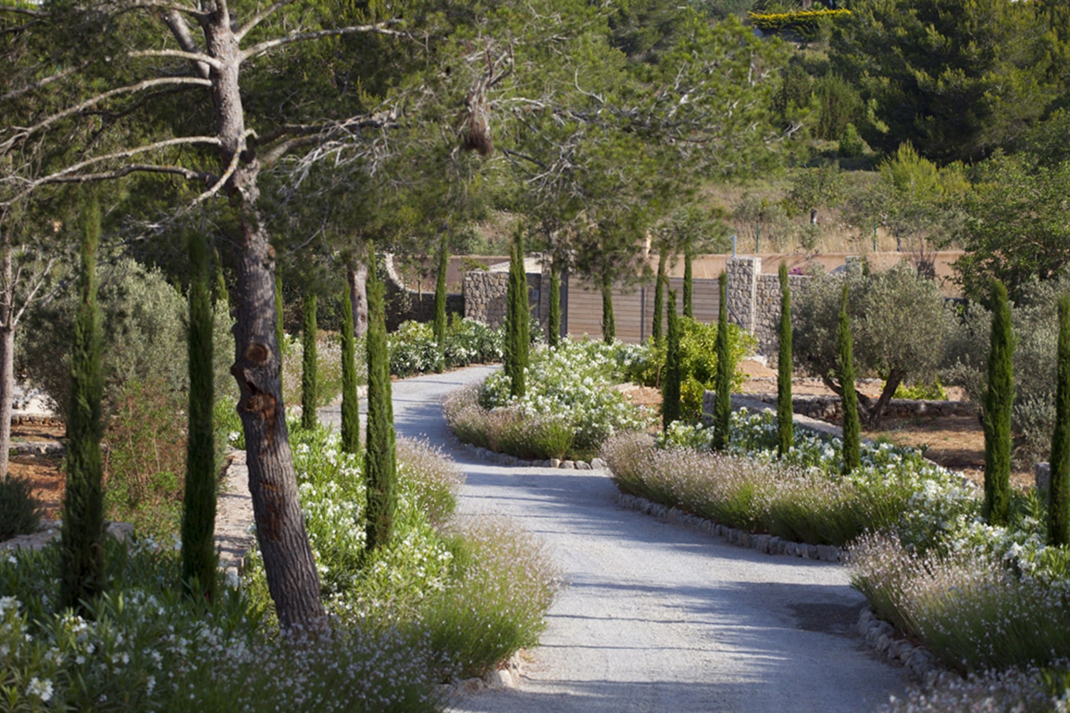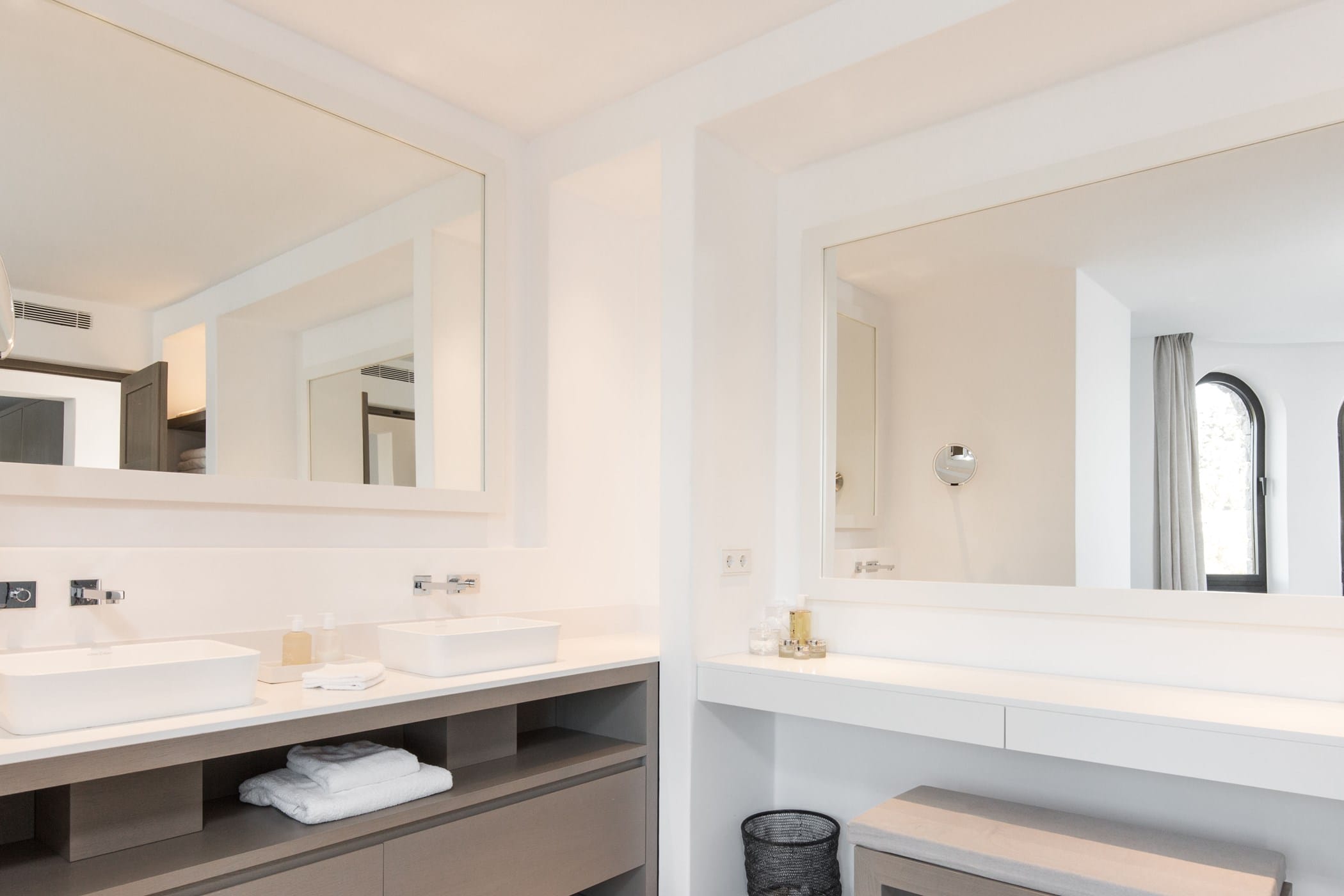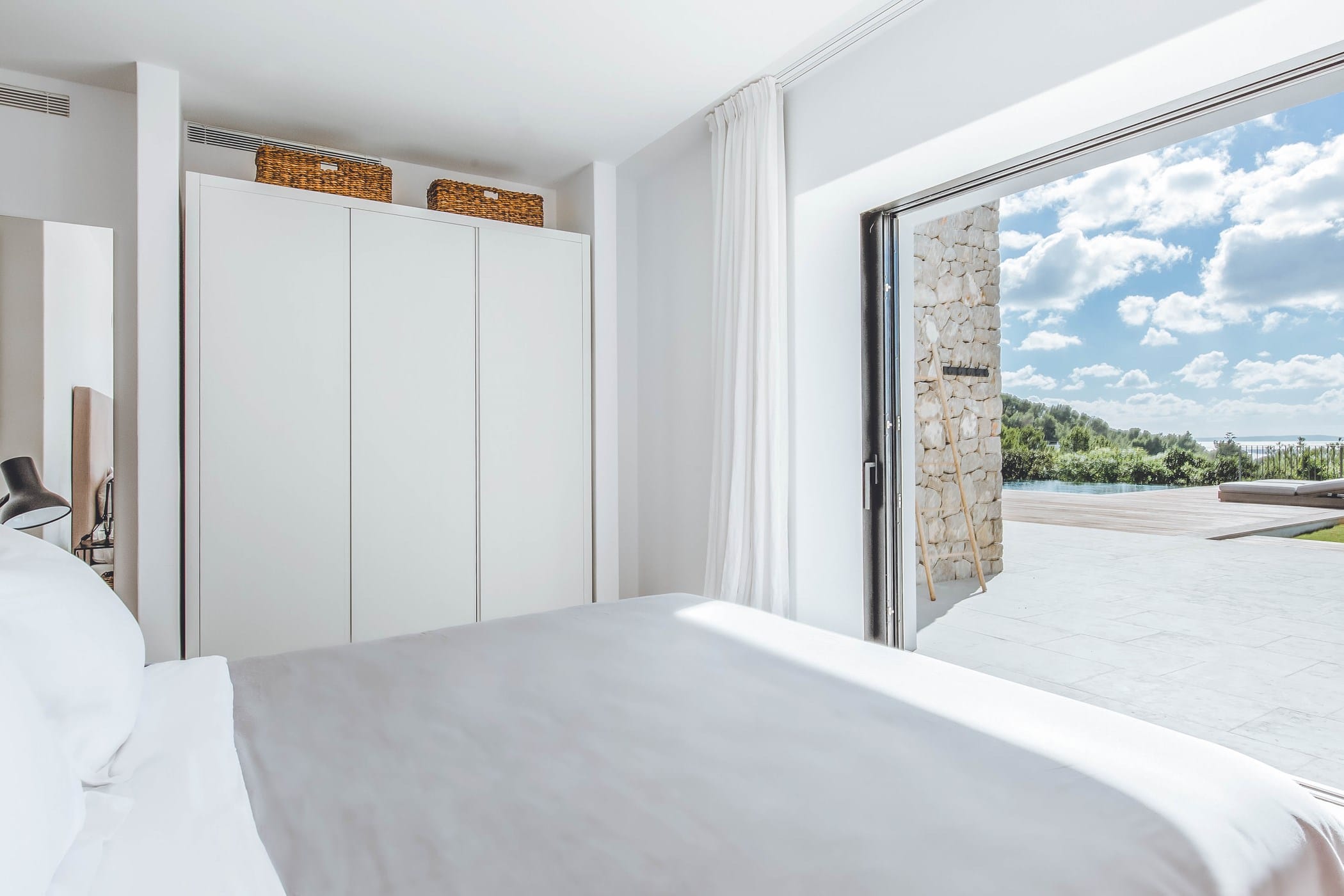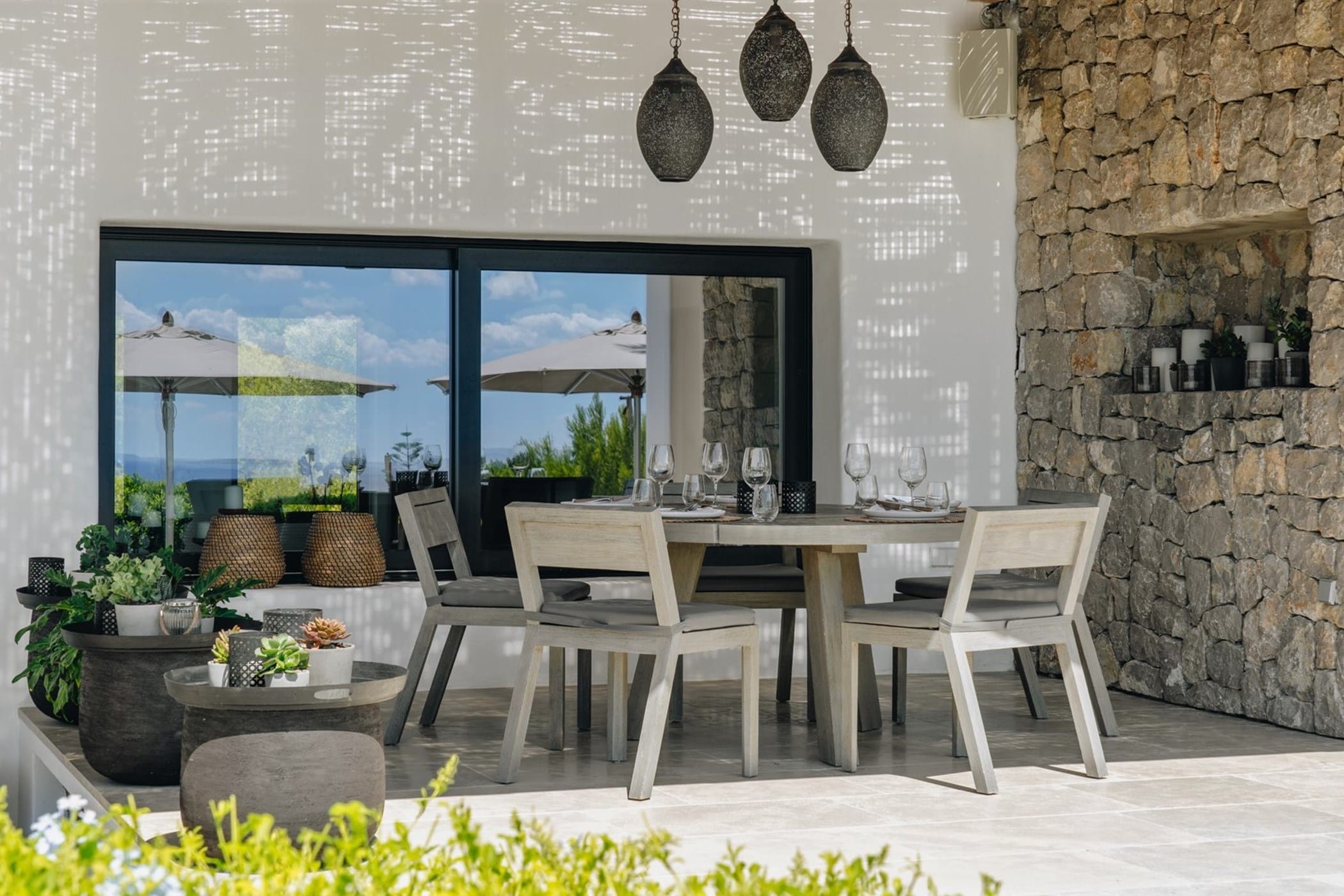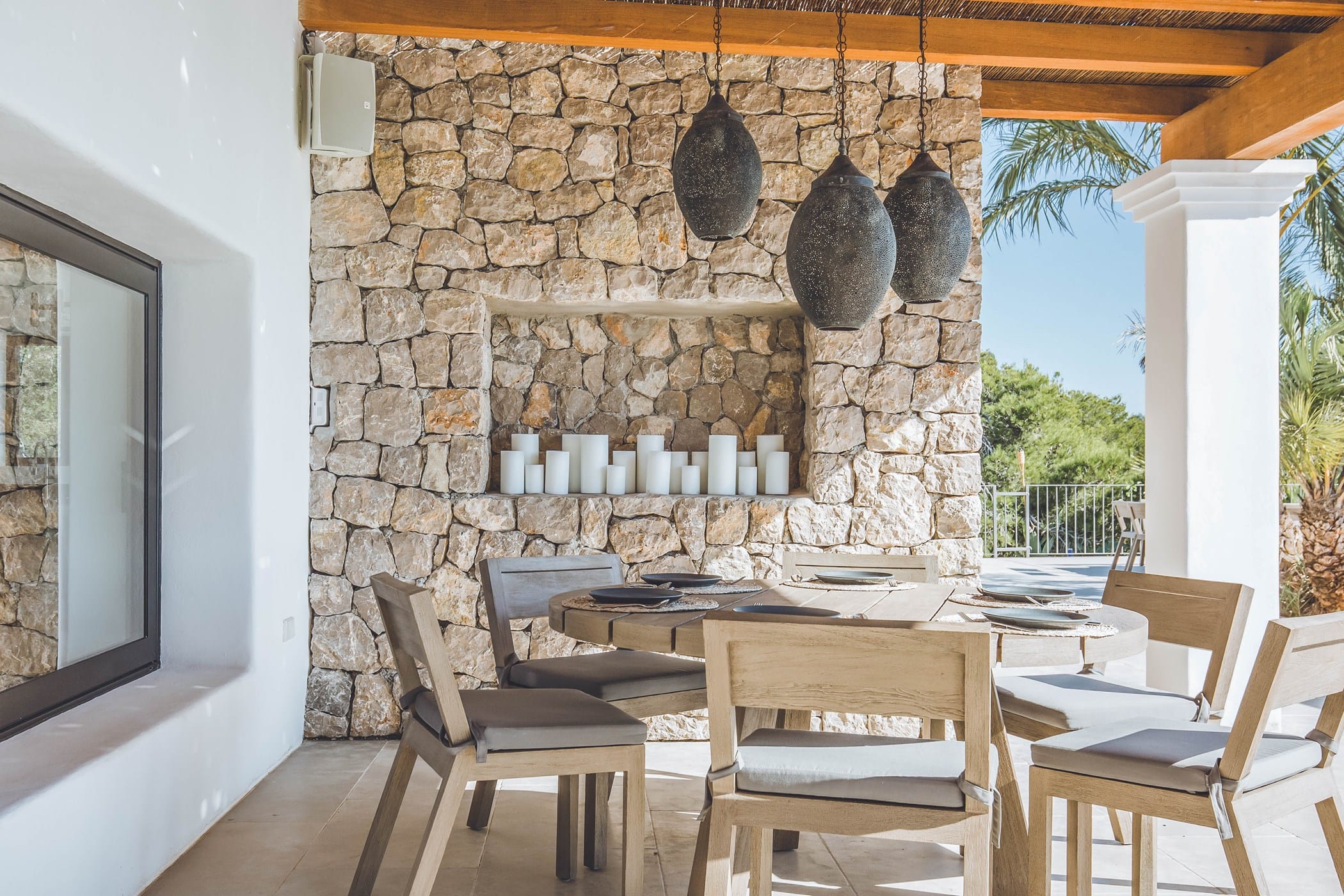 The interiors masterfully blend contemporary elegance with traditional Ibizan touches, featuring spacious lounges, a fully equipped open-plan kitchen with breakfast bar, and exceptional furnishings throughout. The two master suites include king-size beds and private terraces, while the remaining bedrooms offer double beds with private or adjoining bathrooms. Three separate guest houses provide additional privacy and sea views.