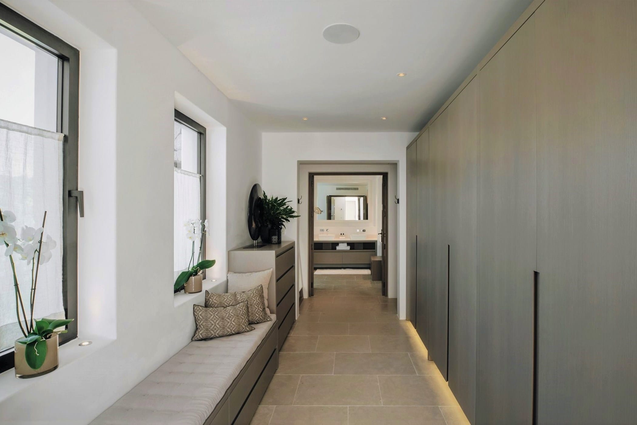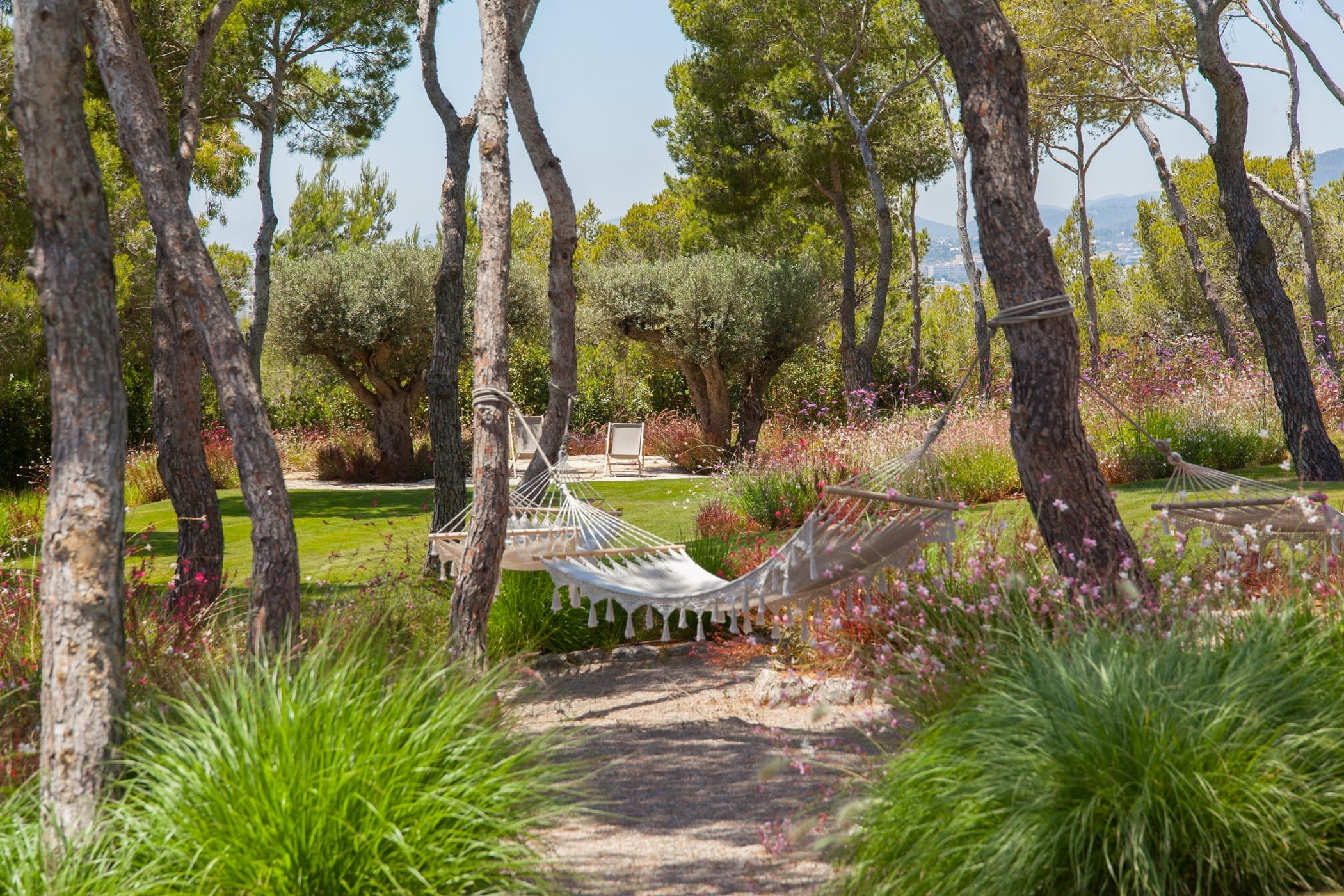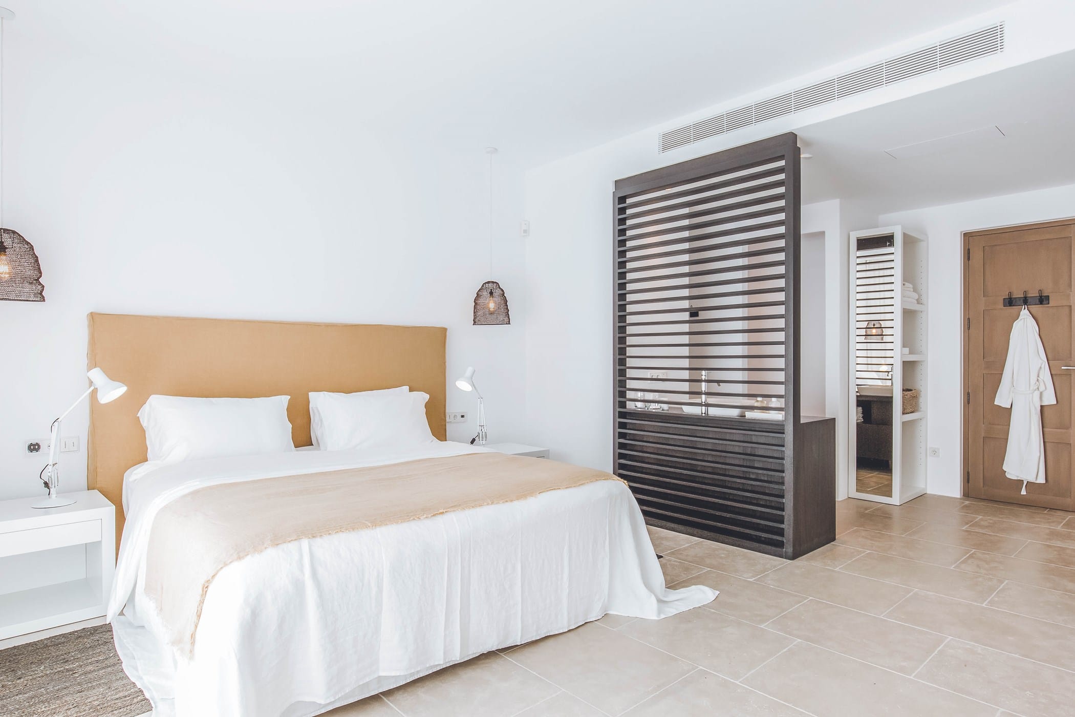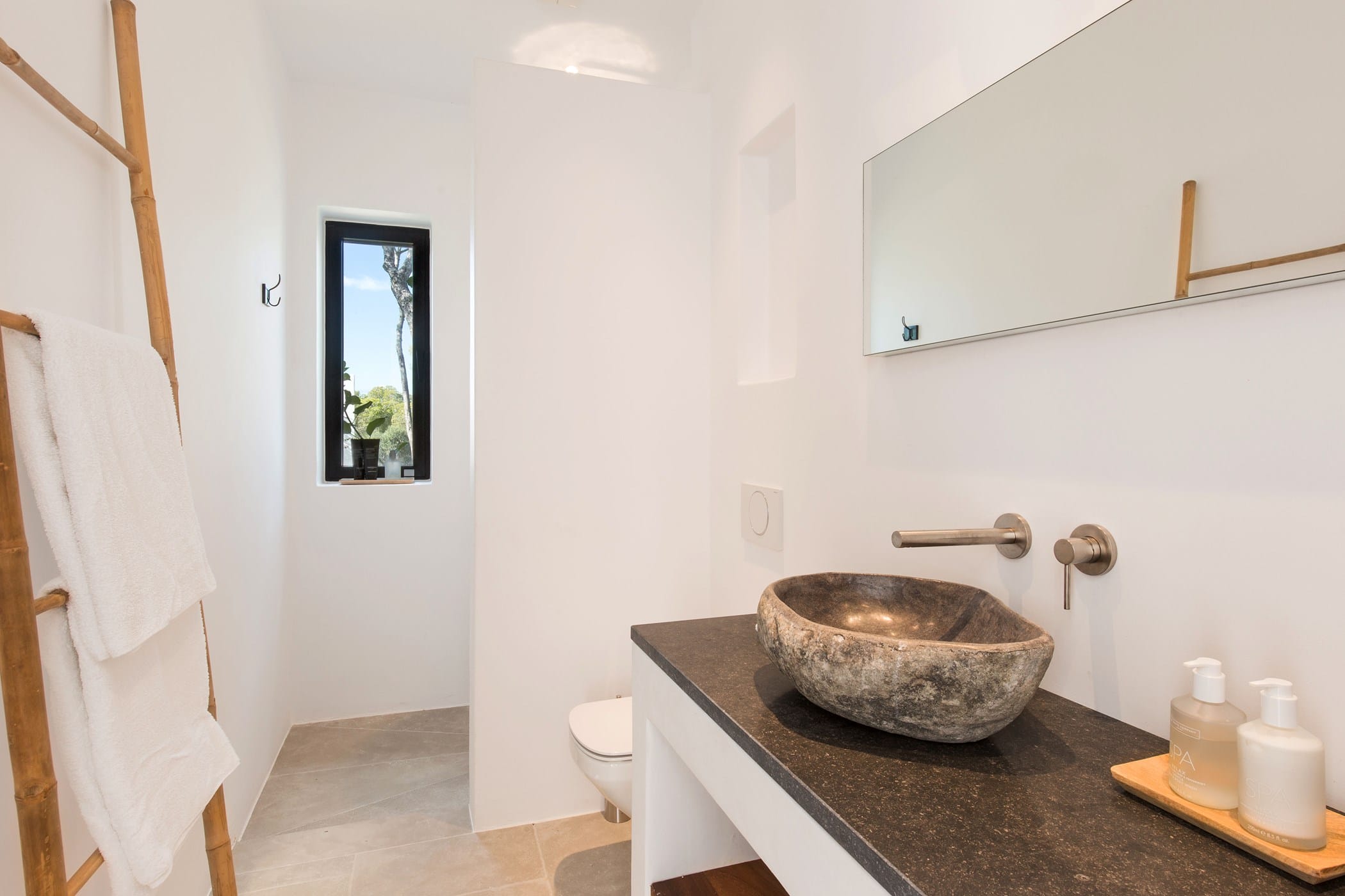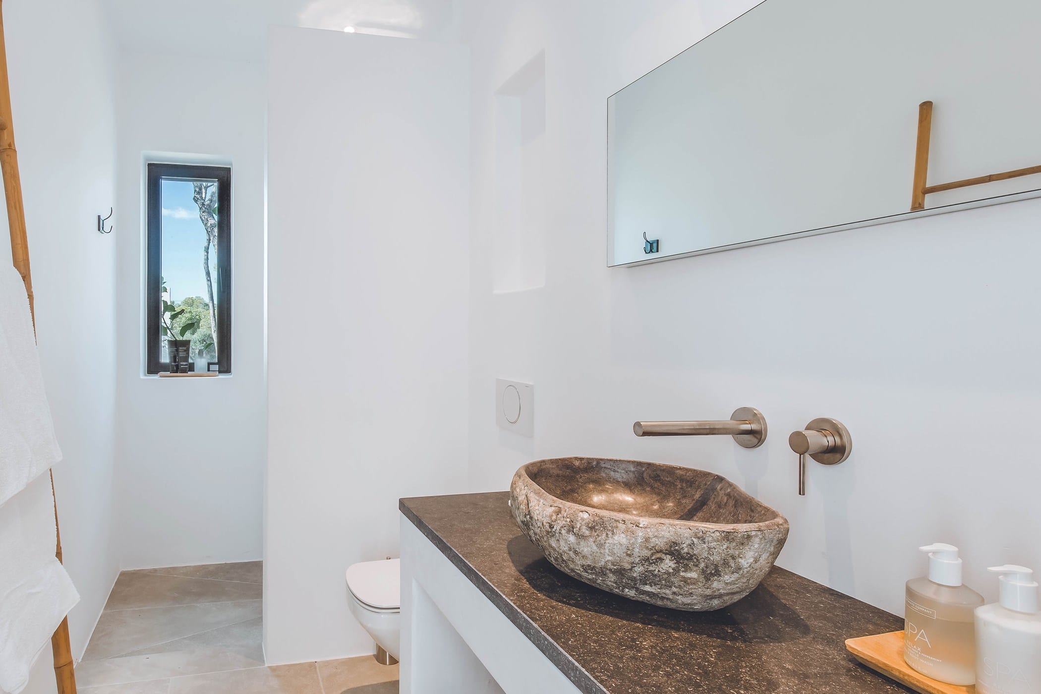 The interiors masterfully blend contemporary elegance with traditional Ibizan touches, featuring spacious lounges, a fully equipped open-plan kitchen with breakfast bar, and exceptional furnishings throughout. The two master suites include king-size beds and private terraces, while the remaining bedrooms offer double beds with private or adjoining bathrooms. Three separate guest houses provide additional privacy and sea views.