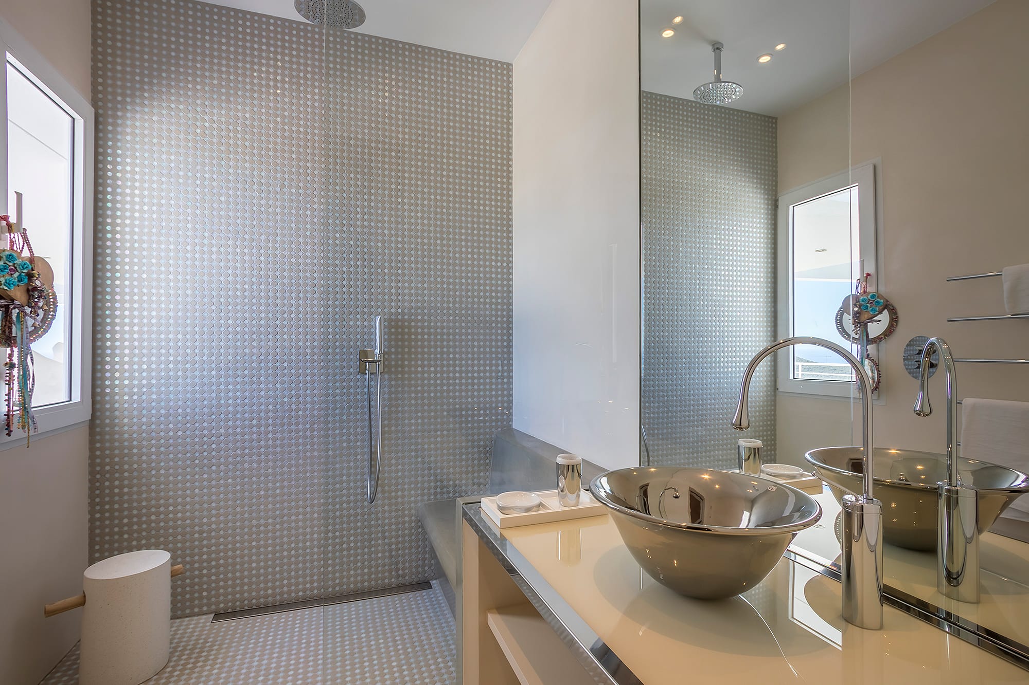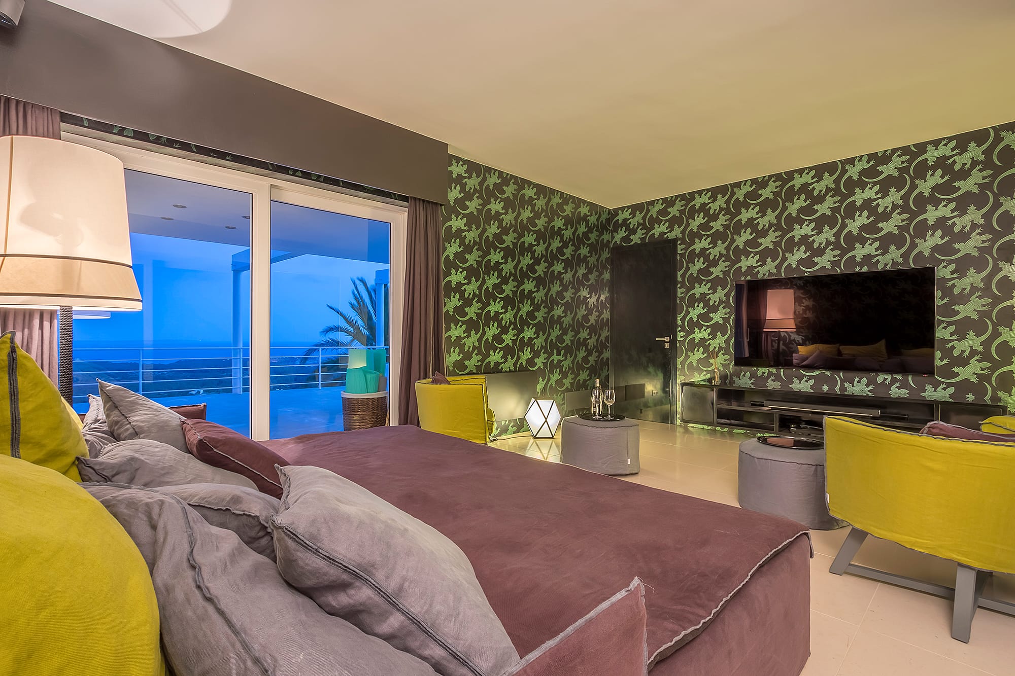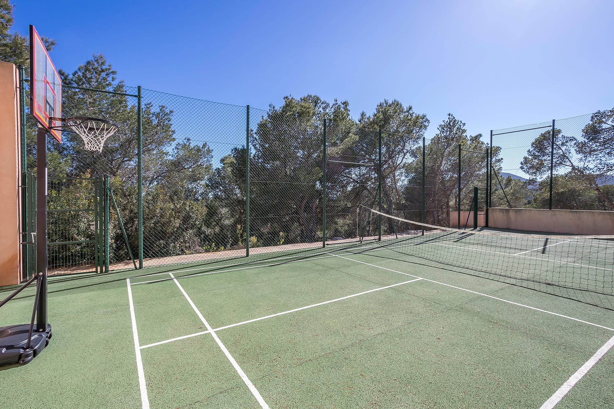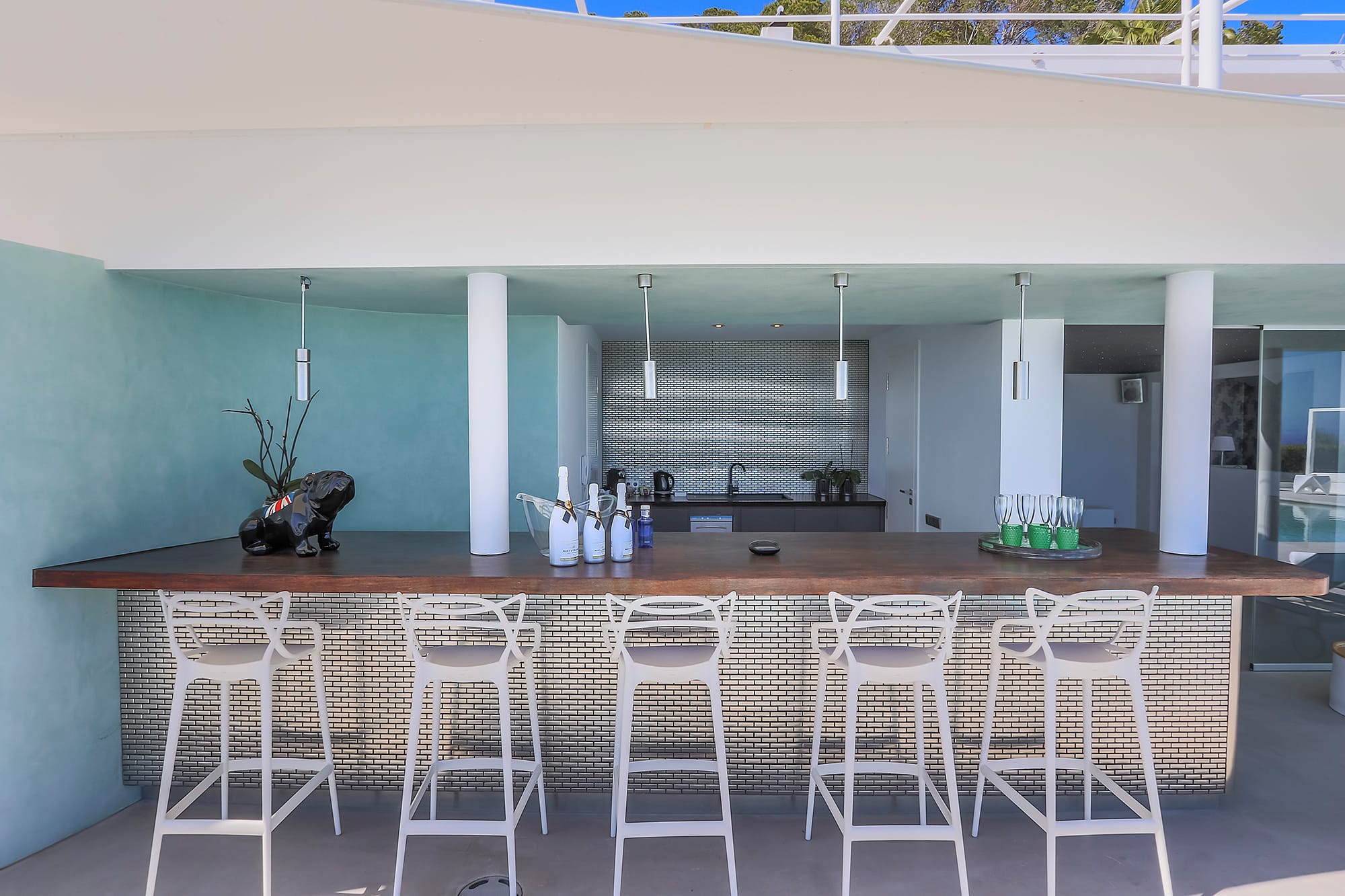 Outdoor living is central to the experience, featuring a large infinity pool with a pool bar, lounge areas, and spaces designed for relaxation and socializing. Guests can also enjoy wellness and fitness amenities, including a fully equipped sea-view gym and a padel court. Combining contemporary design, high-end features, and a strong connection to nature, this property is ideal for both relaxation and an active lifestyle.