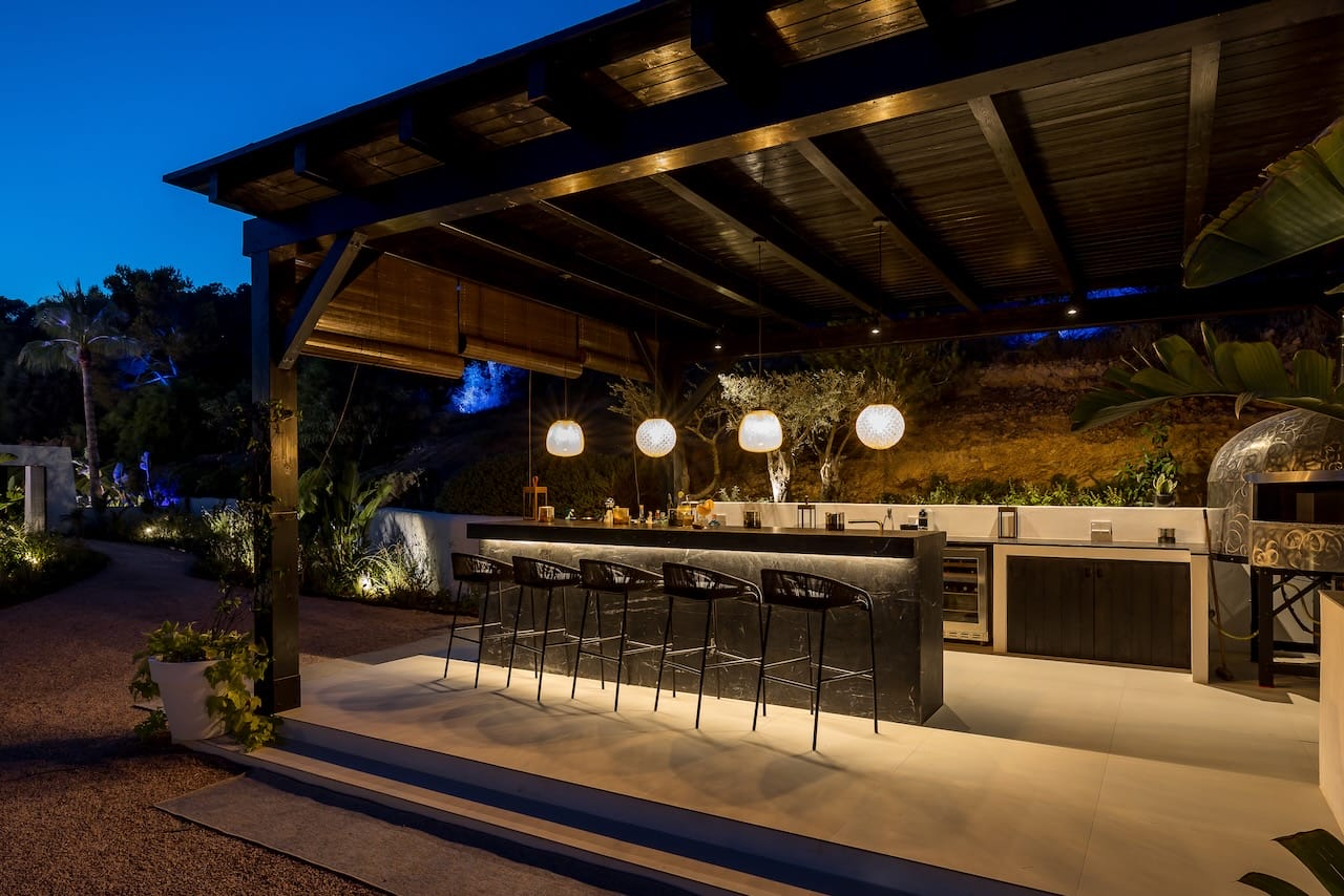Outdoor living is exceptional, with expansive terraces, manicured gardens, and a large swimming pool surrounded by sun loungers and chill-out areas. The property is perfectly equipped for entertaining, featuring spacious indoor and outdoor dining areas and bespoke bar spaces.