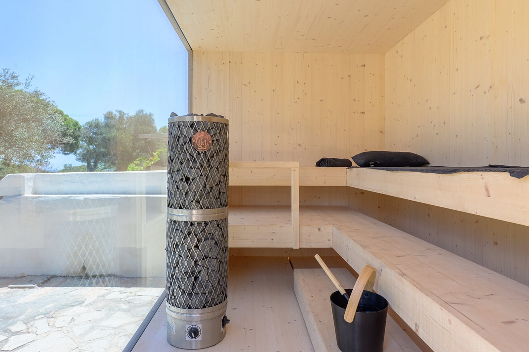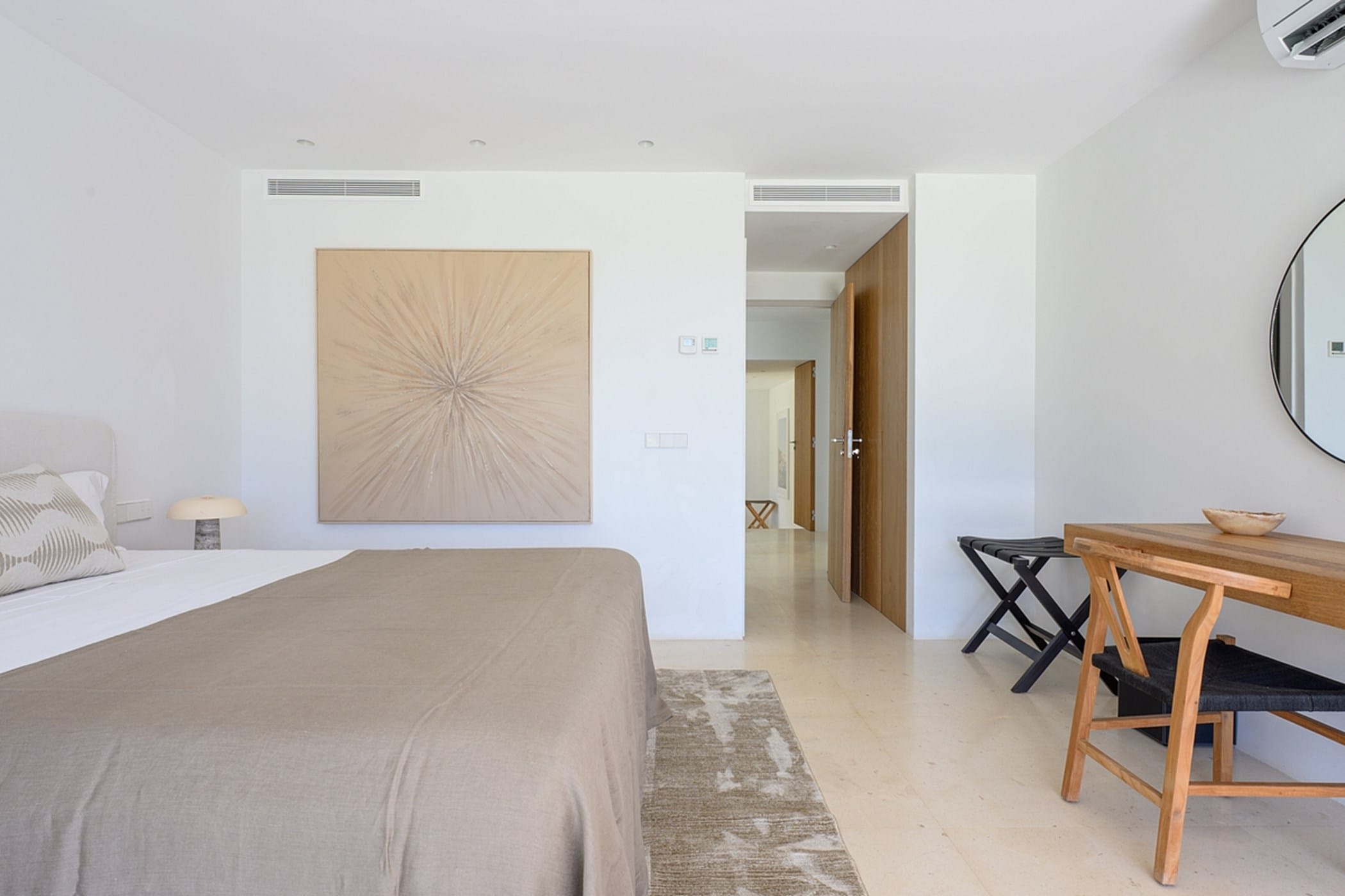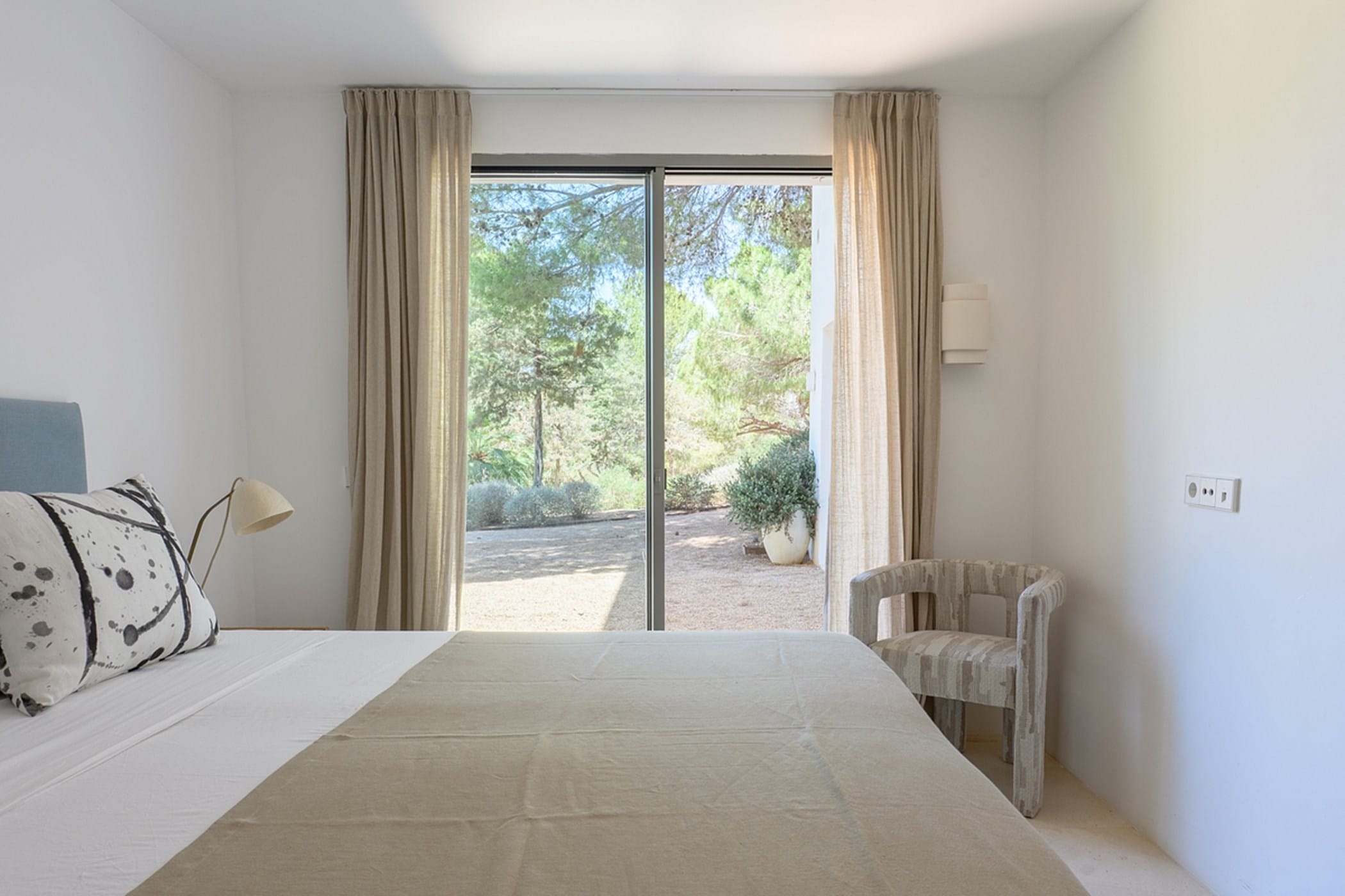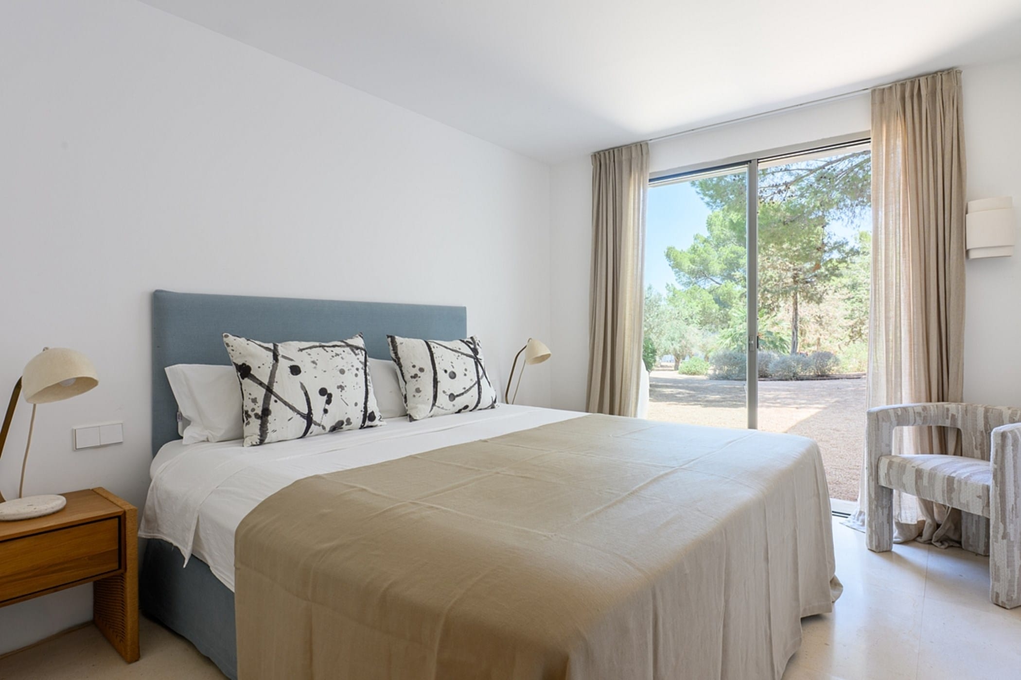 The villa features eight bedrooms: seven in the main house (including a spacious master suite) and one in a separate annex. All bedrooms have air conditioning and en-suite bathrooms. Additional amenities include a 40m² air-conditioned gym, private sauna, plunge pool, paddle court, pétanque area, and beautifully landscaped gardens.