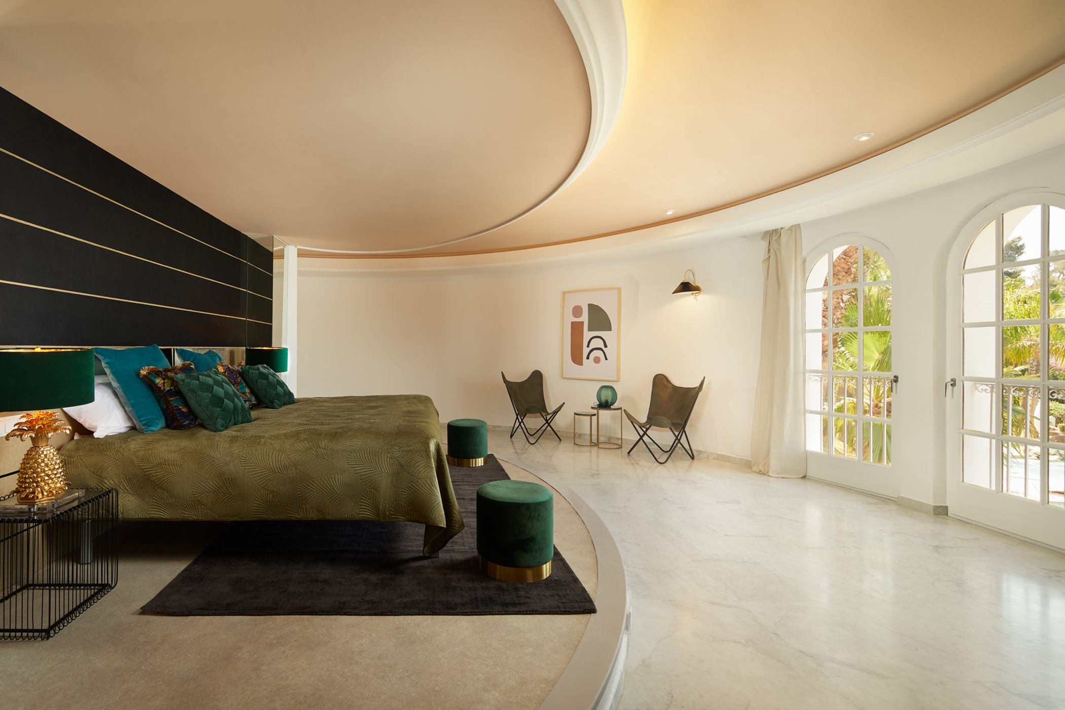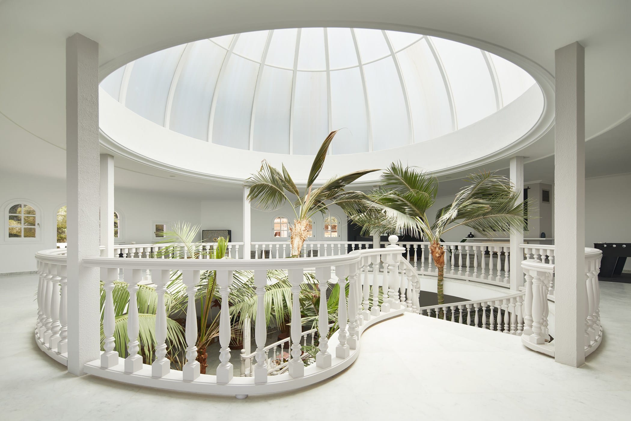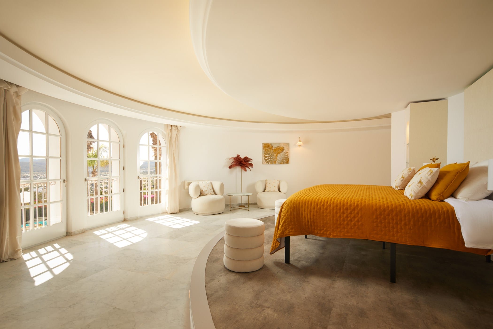 The villa is divided into two wings and features eight bedrooms, many with en-suite bathrooms, private terraces, and views over the pool and surrounding landscape. Bright interiors include spacious living areas, a grand entrance hall with a striking staircase, and comfortable spaces designed for both privacy and social gatherings.