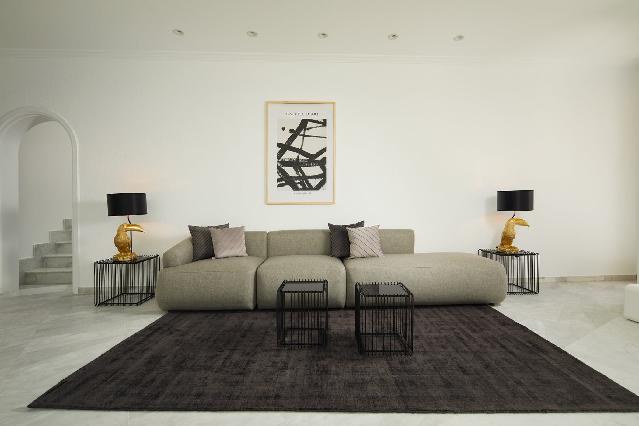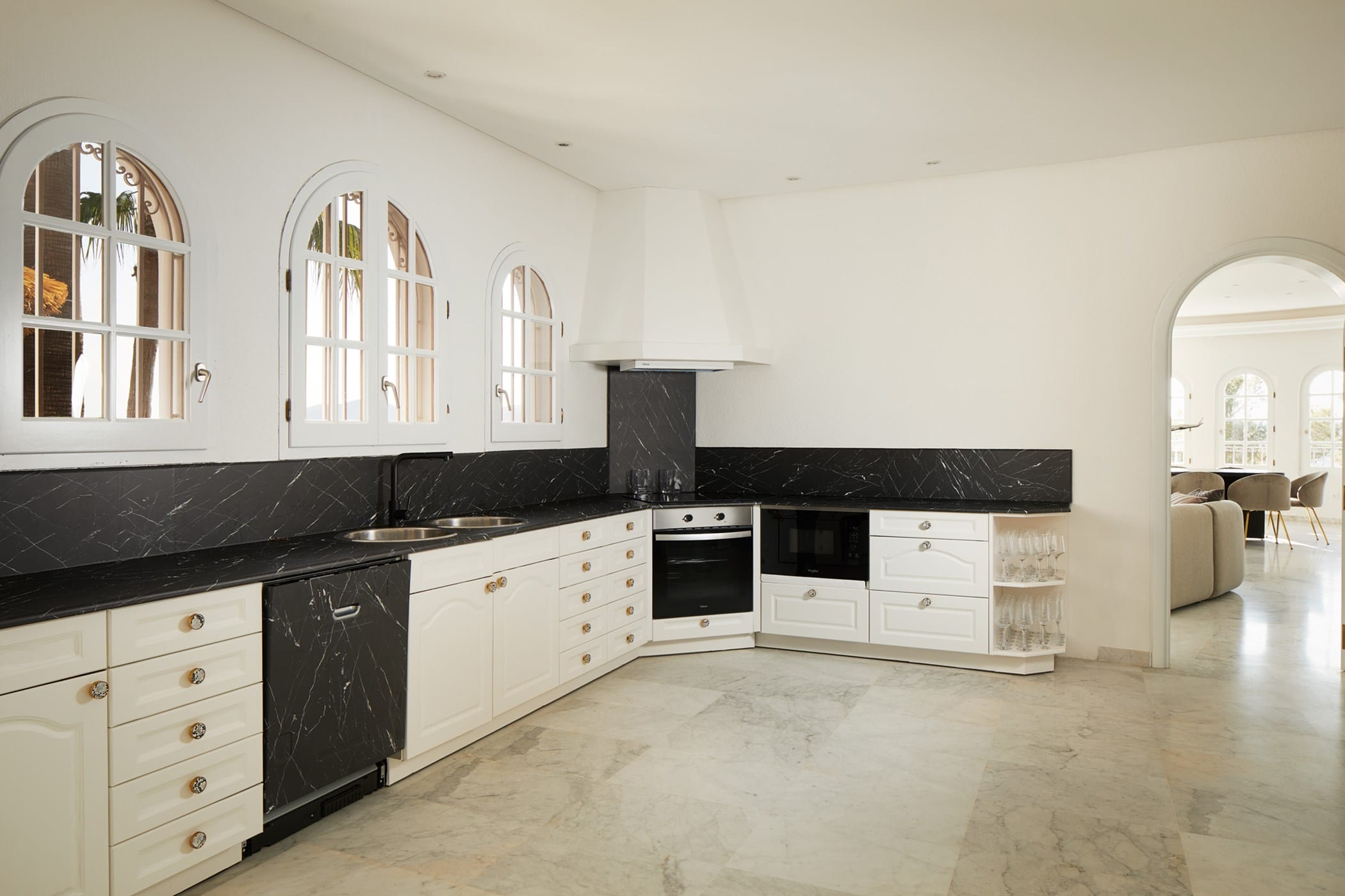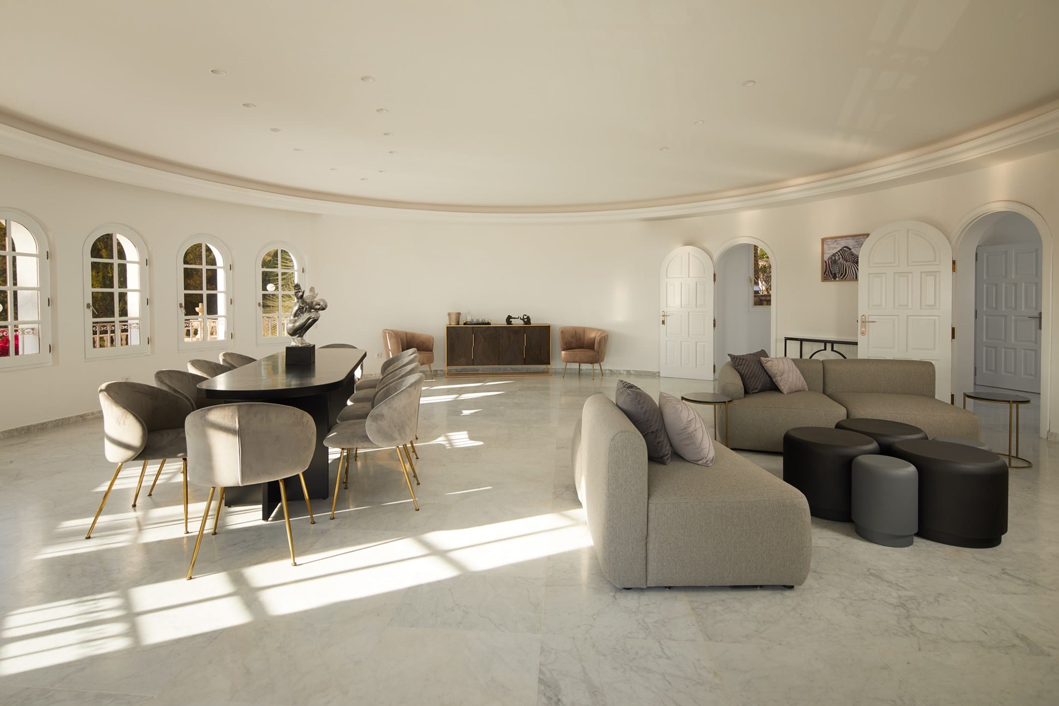 The villa is divided into two wings and features eight bedrooms, many with en-suite bathrooms, private terraces, and views over the pool and surrounding landscape. Bright interiors include spacious living areas, a grand entrance hall with a striking staircase, and comfortable spaces designed for both privacy and social gatherings.