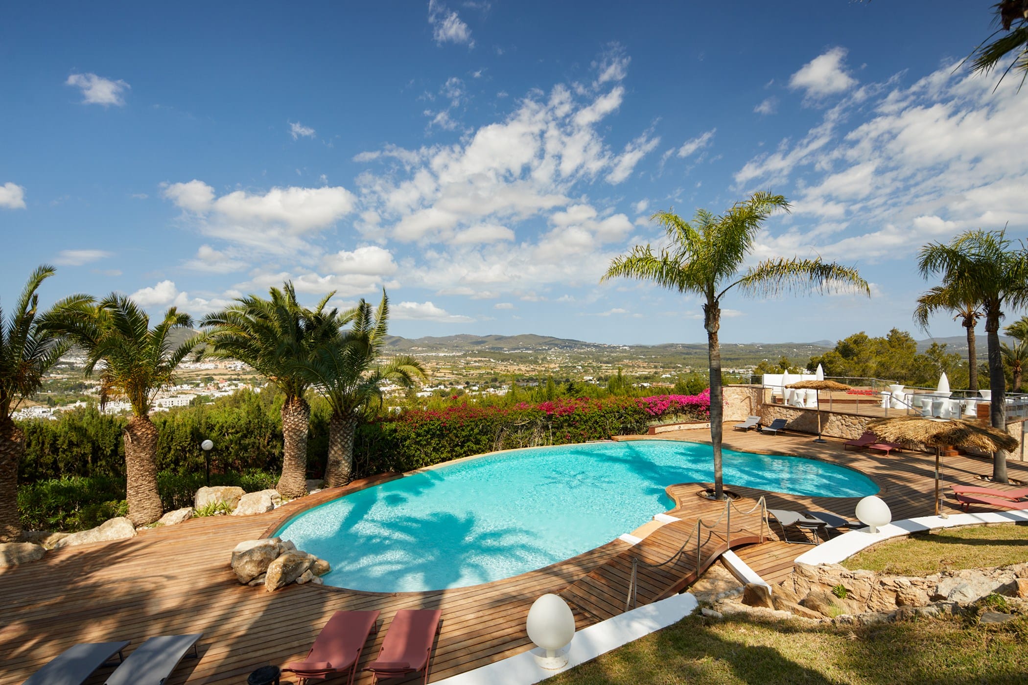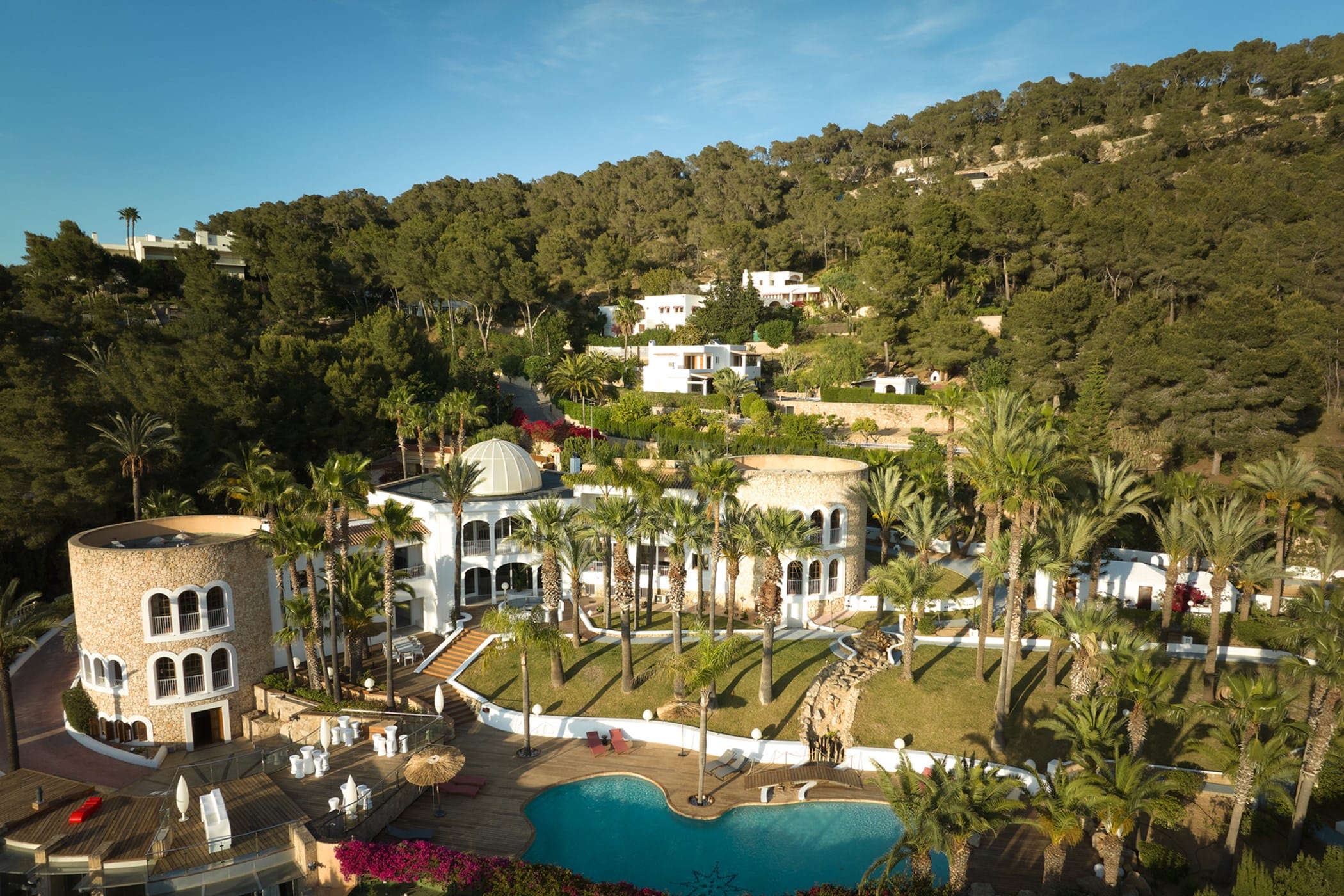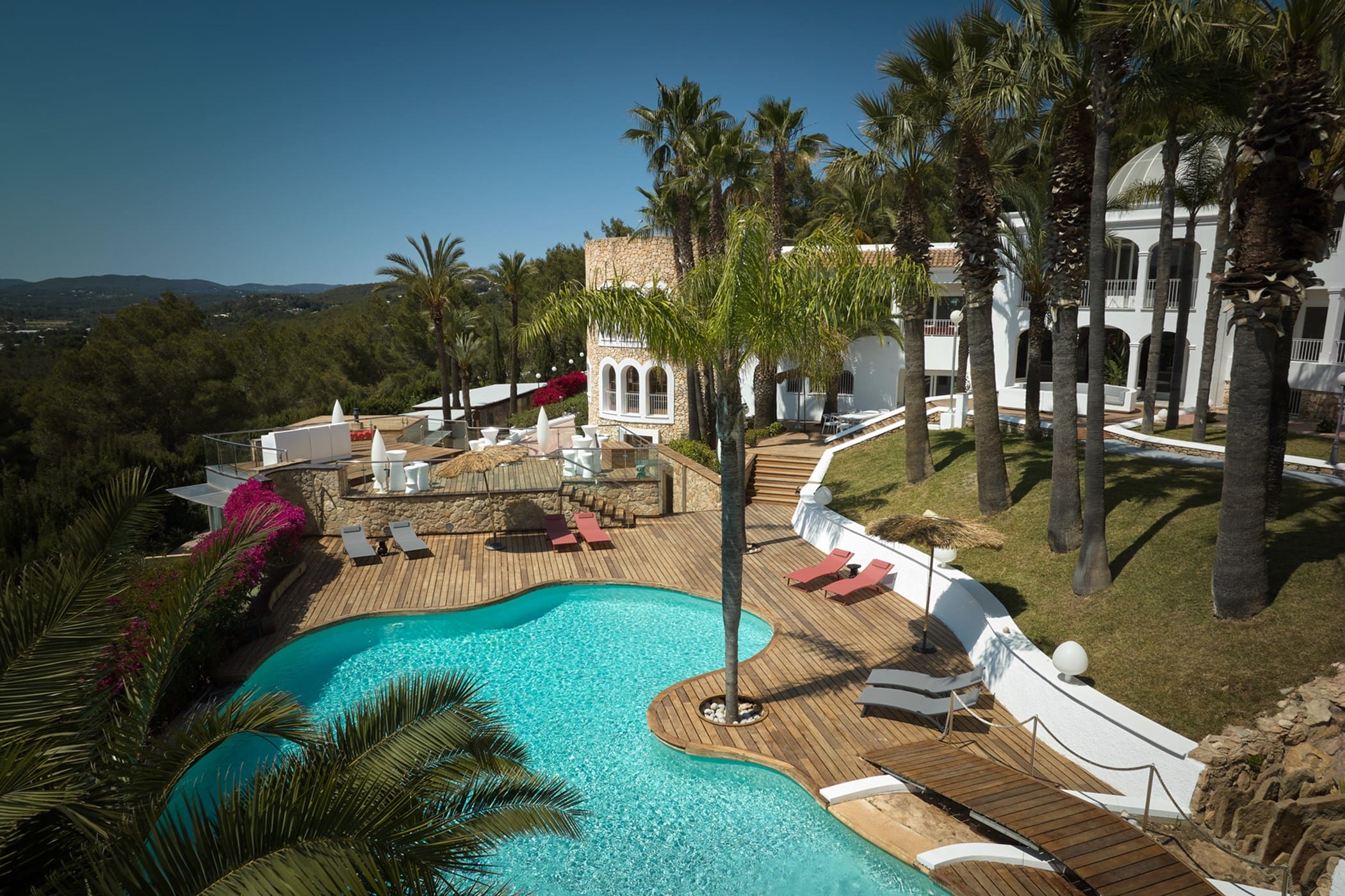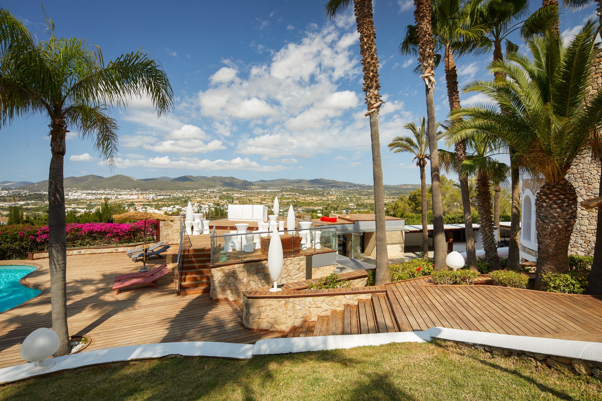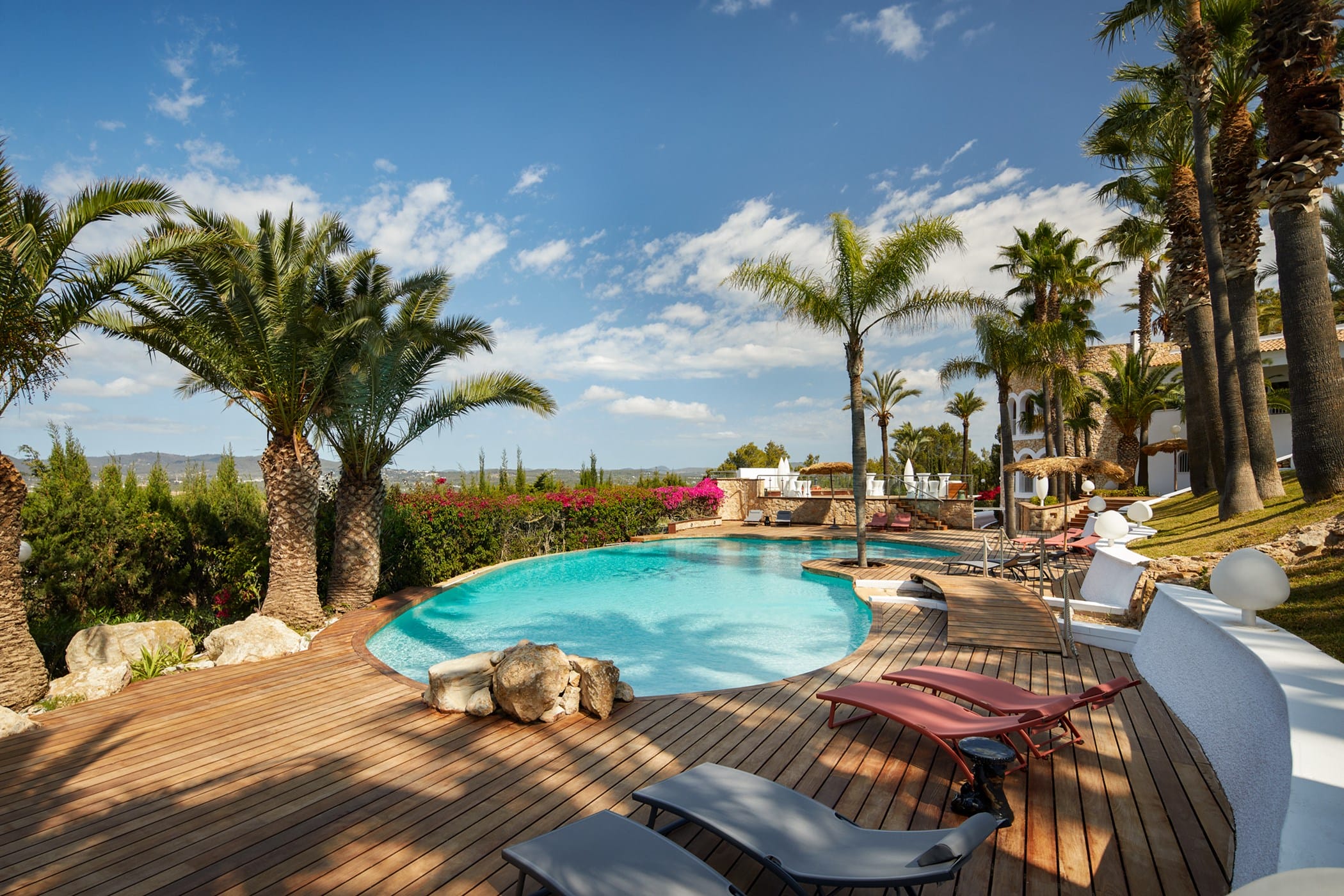 This tropical-style villa is set within expansive private grounds, surrounded by lush Mediterranean gardens and palm trees, offering a peaceful yet well-connected retreat just minutes from Ibiza Town. Its layout and location make it ideal for families or groups seeking both relaxation and easy access to the island’s vibrant south.