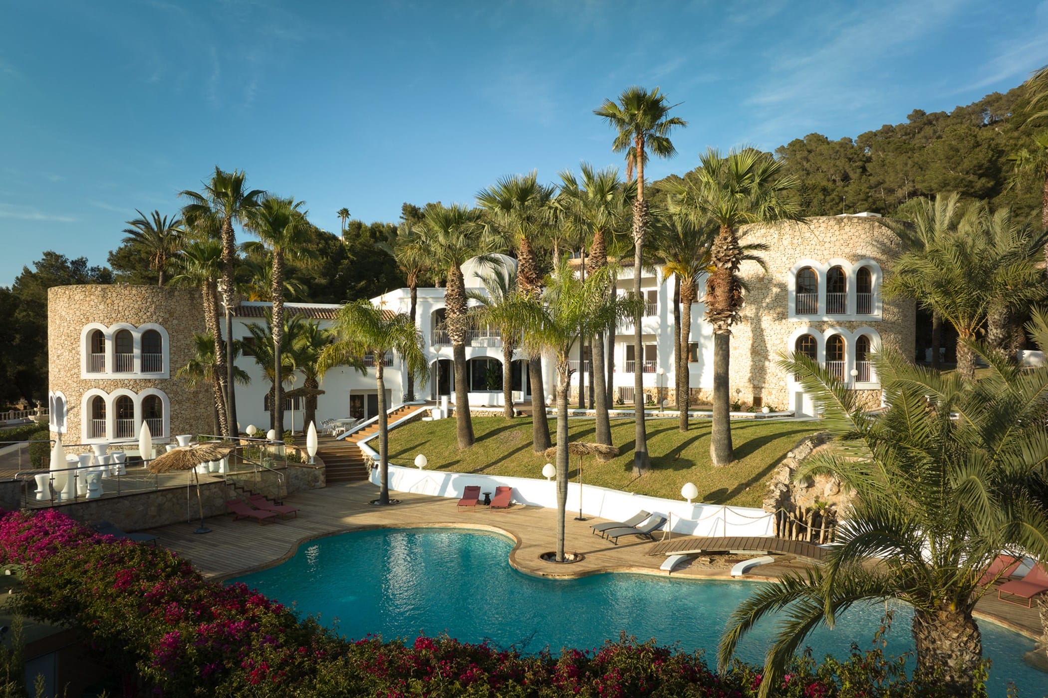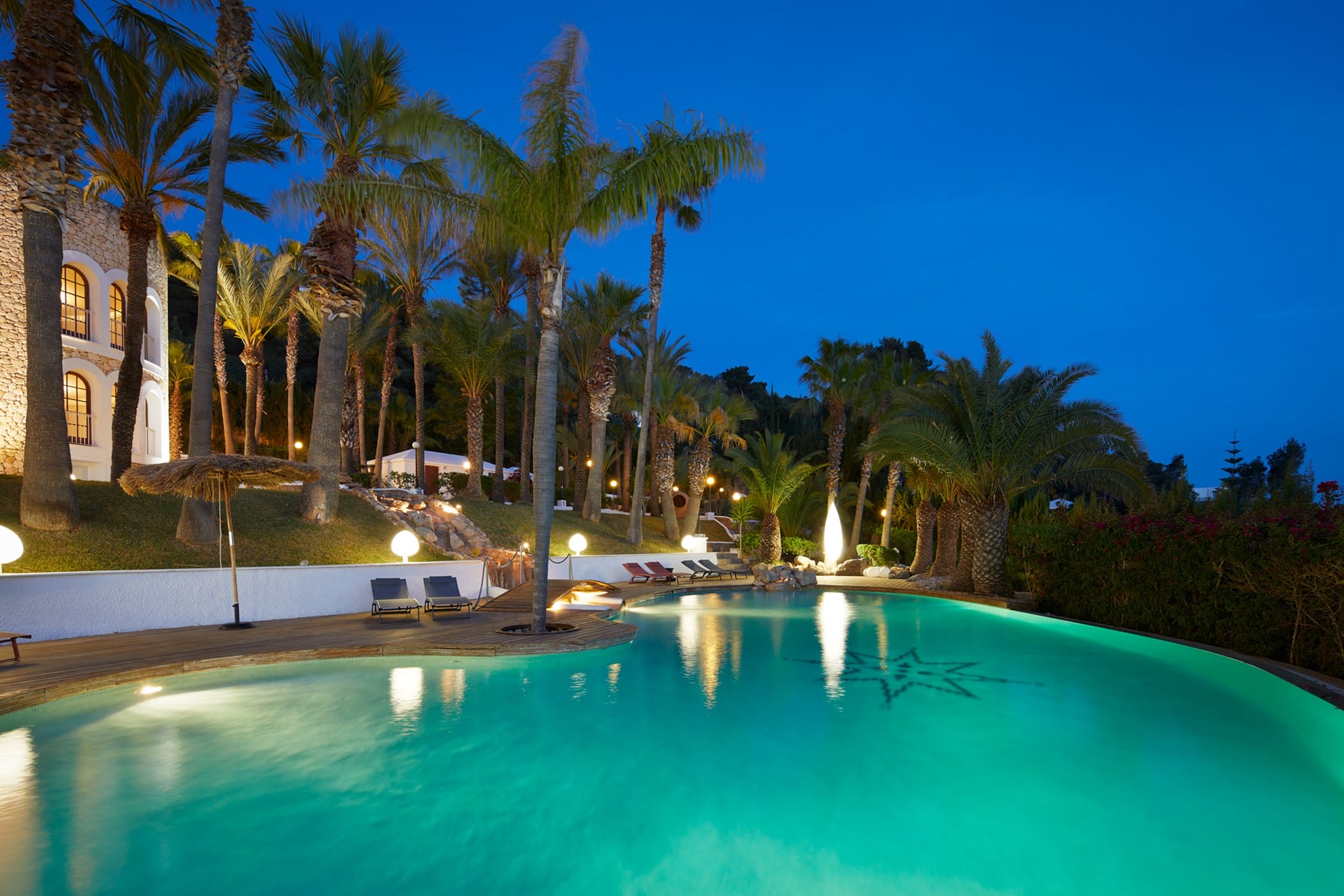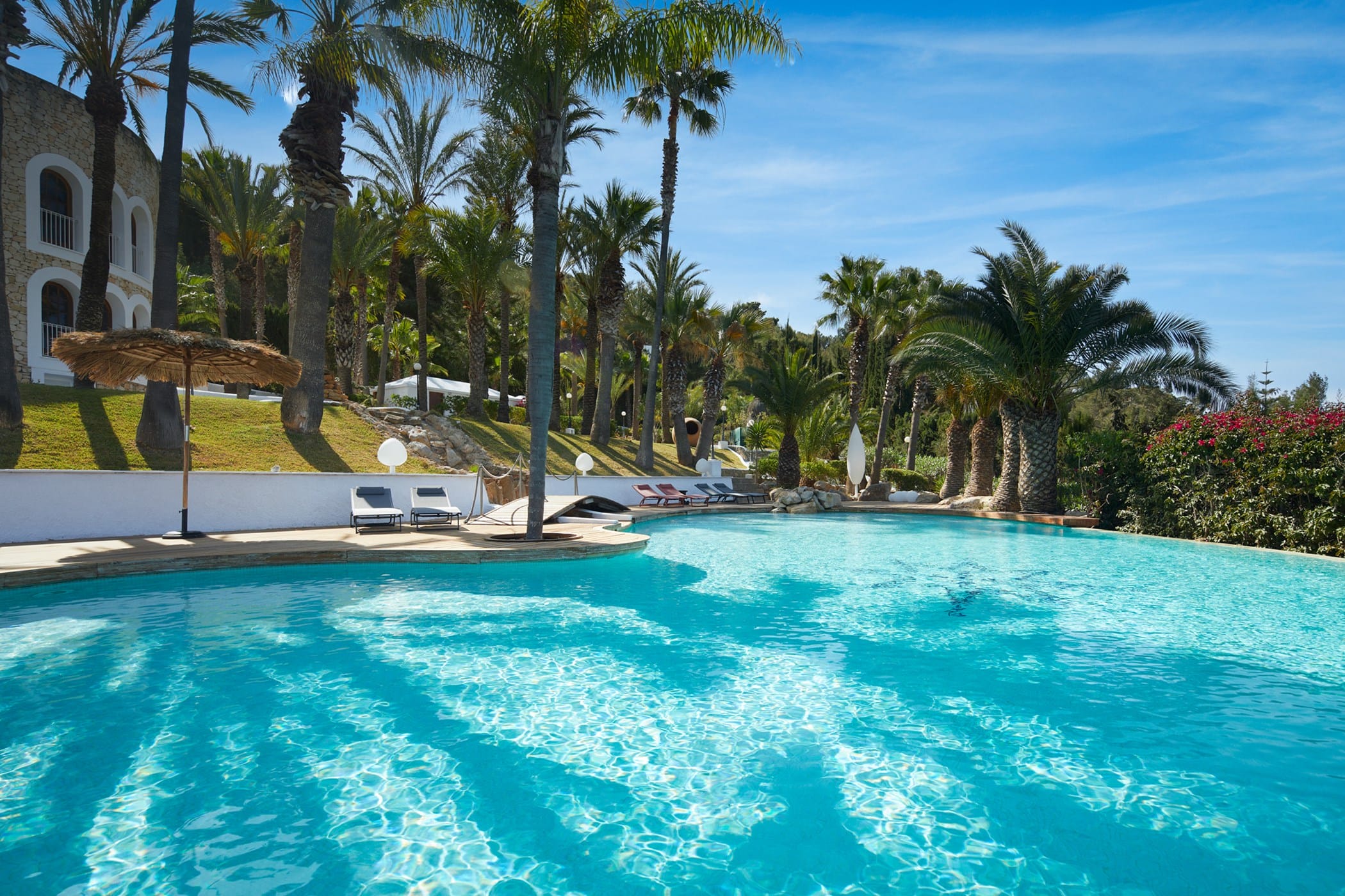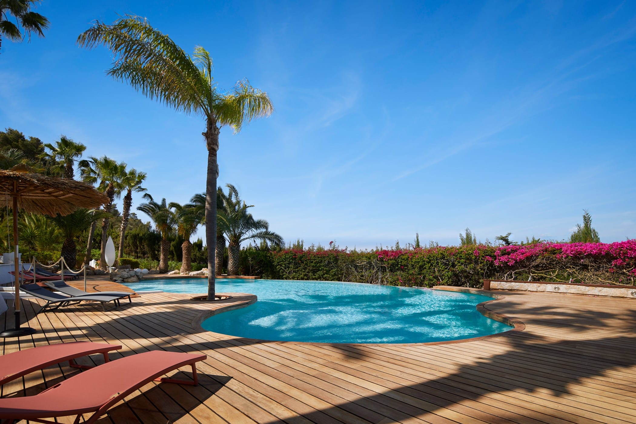 This tropical-style villa is set within expansive private grounds, surrounded by lush Mediterranean gardens and palm trees, offering a peaceful yet well-connected retreat just minutes from Ibiza Town. Its layout and location make it ideal for families or groups seeking both relaxation and easy access to the island’s vibrant south.