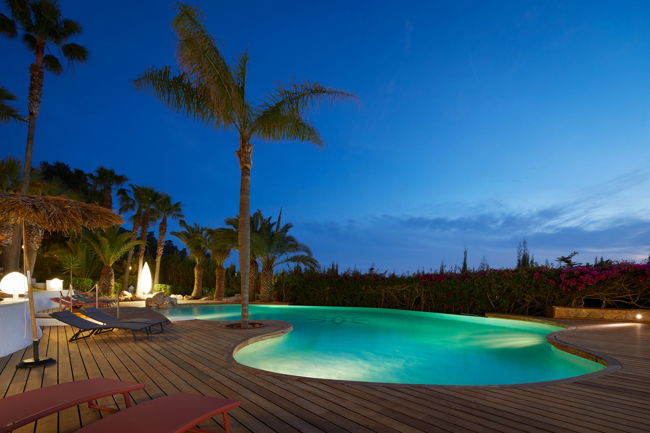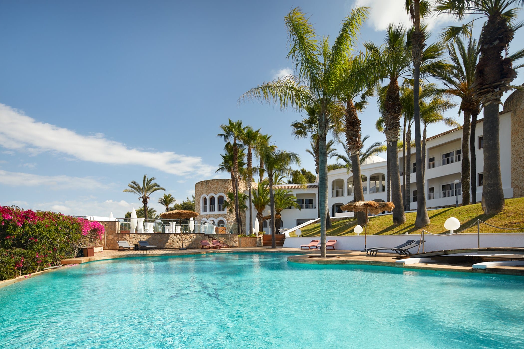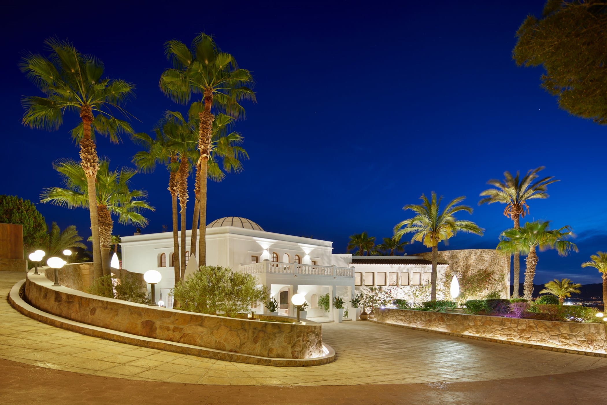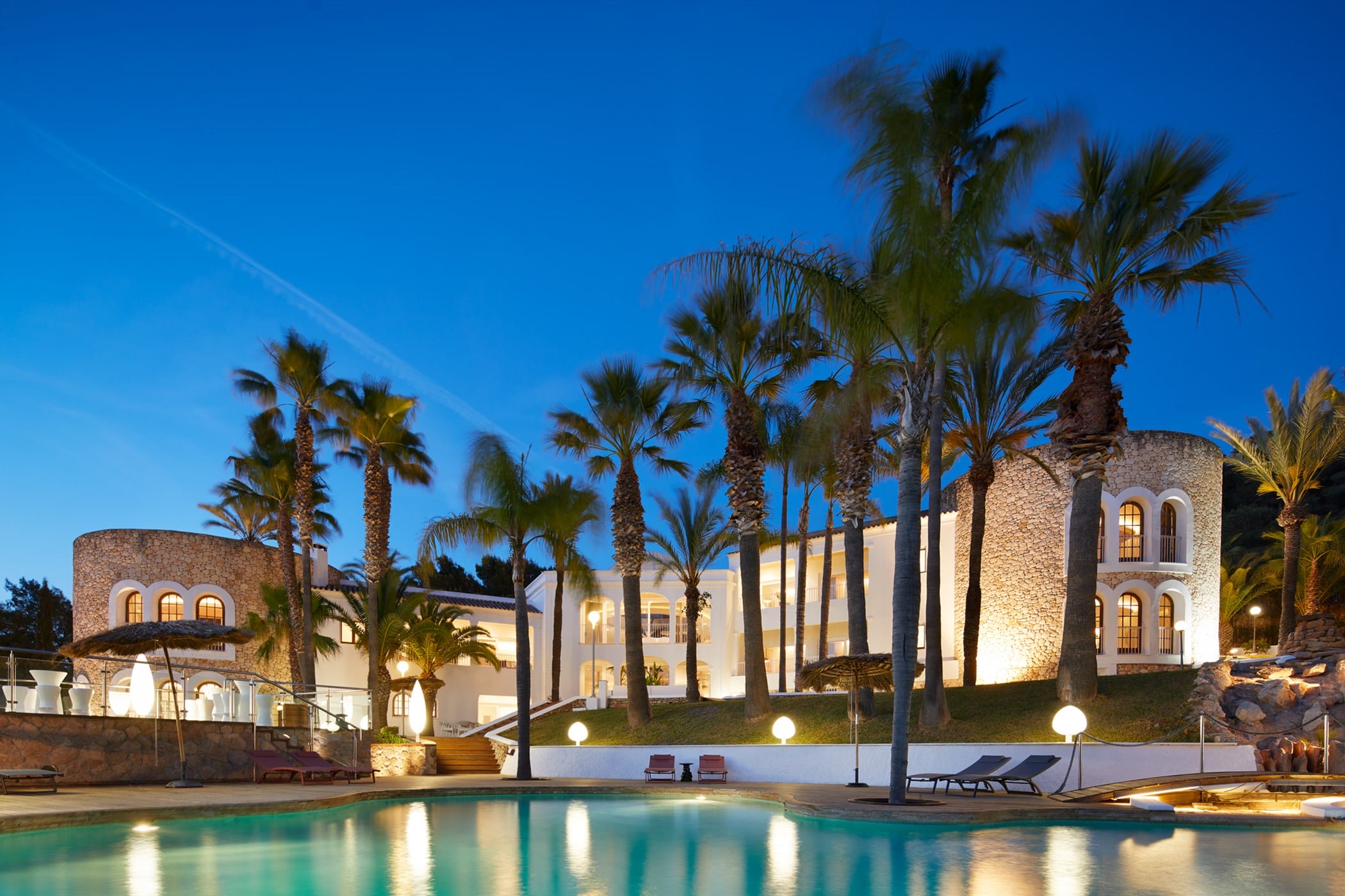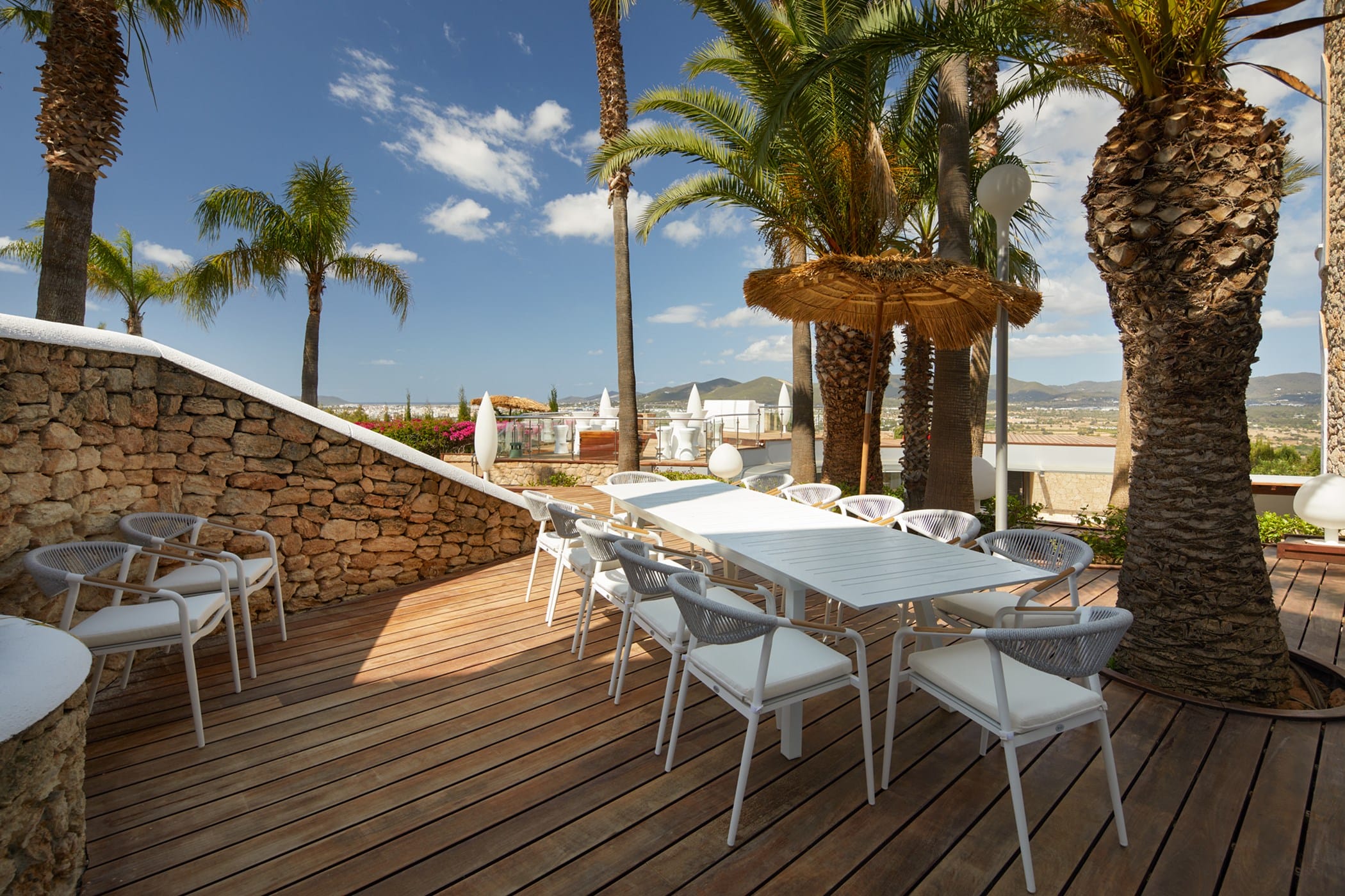 This tropical-style villa is set within expansive private grounds, surrounded by lush Mediterranean gardens and palm trees, offering a peaceful yet well-connected retreat just minutes from Ibiza Town. Its layout and location make it ideal for families or groups seeking both relaxation and easy access to the island’s vibrant south.
