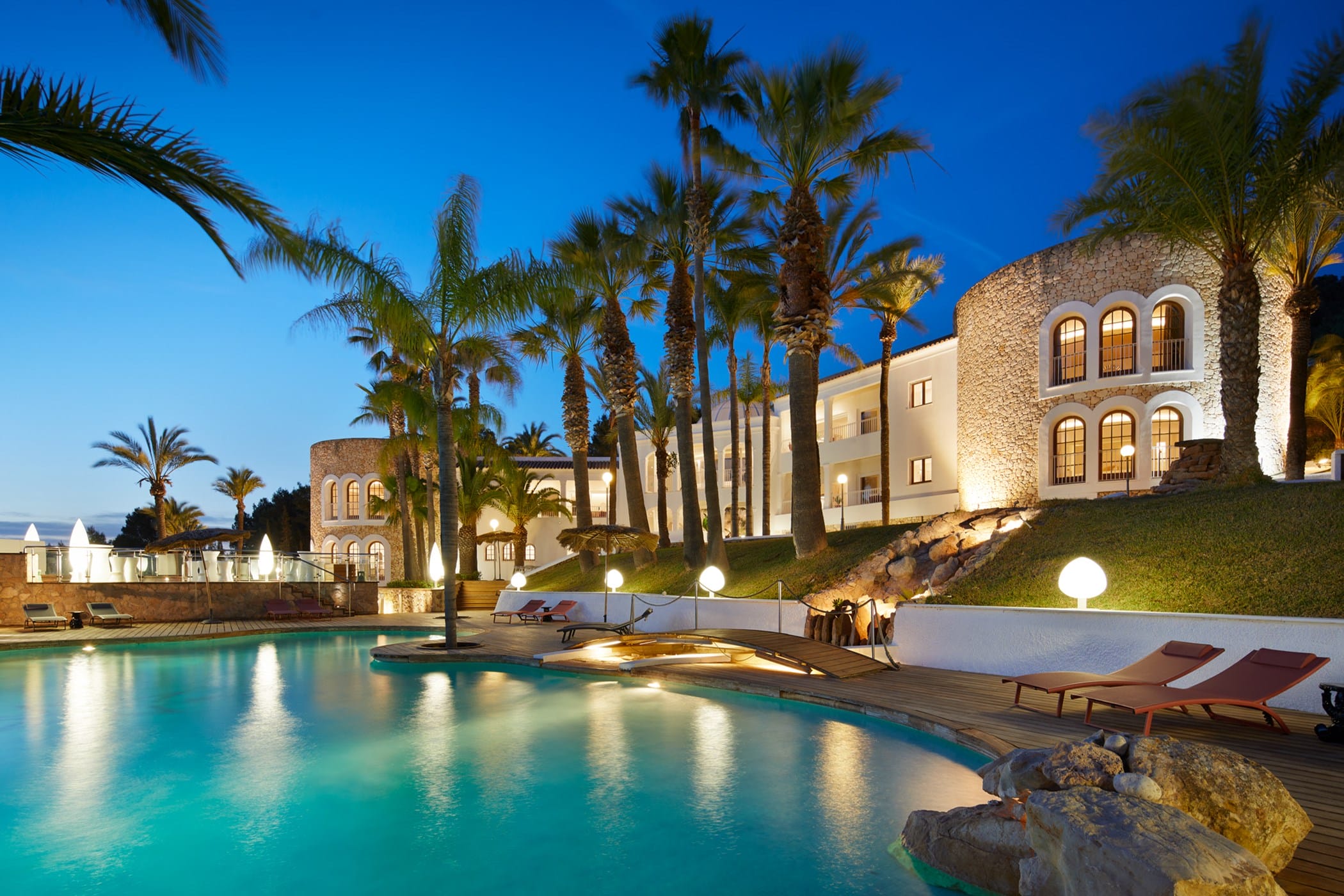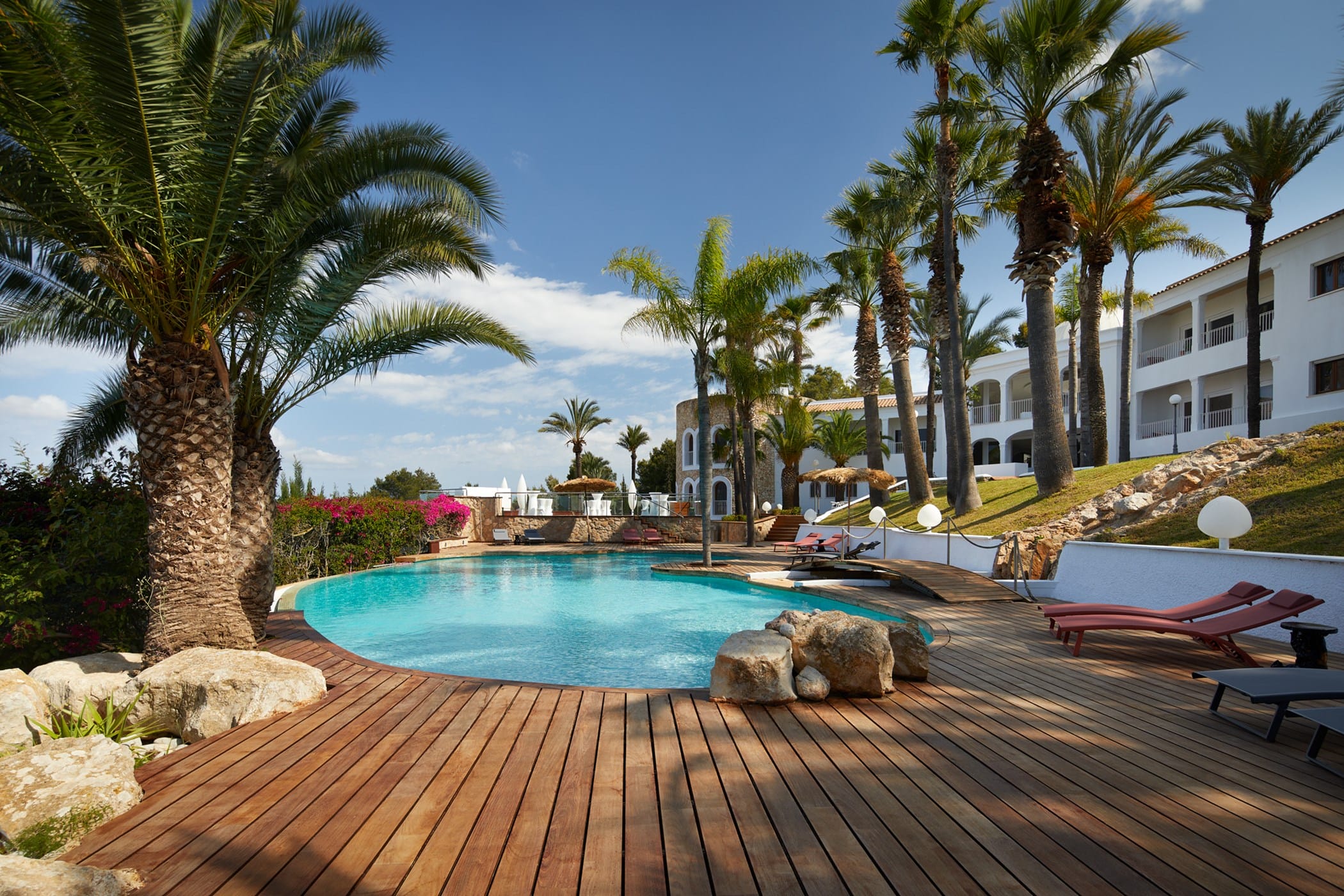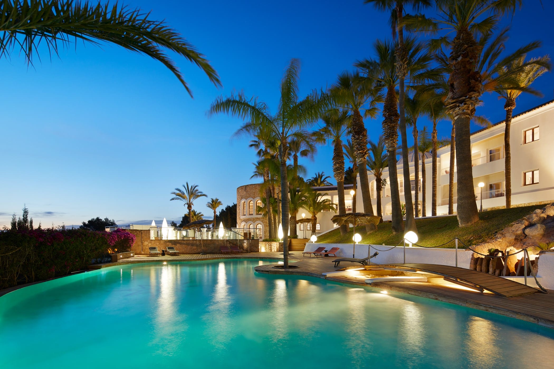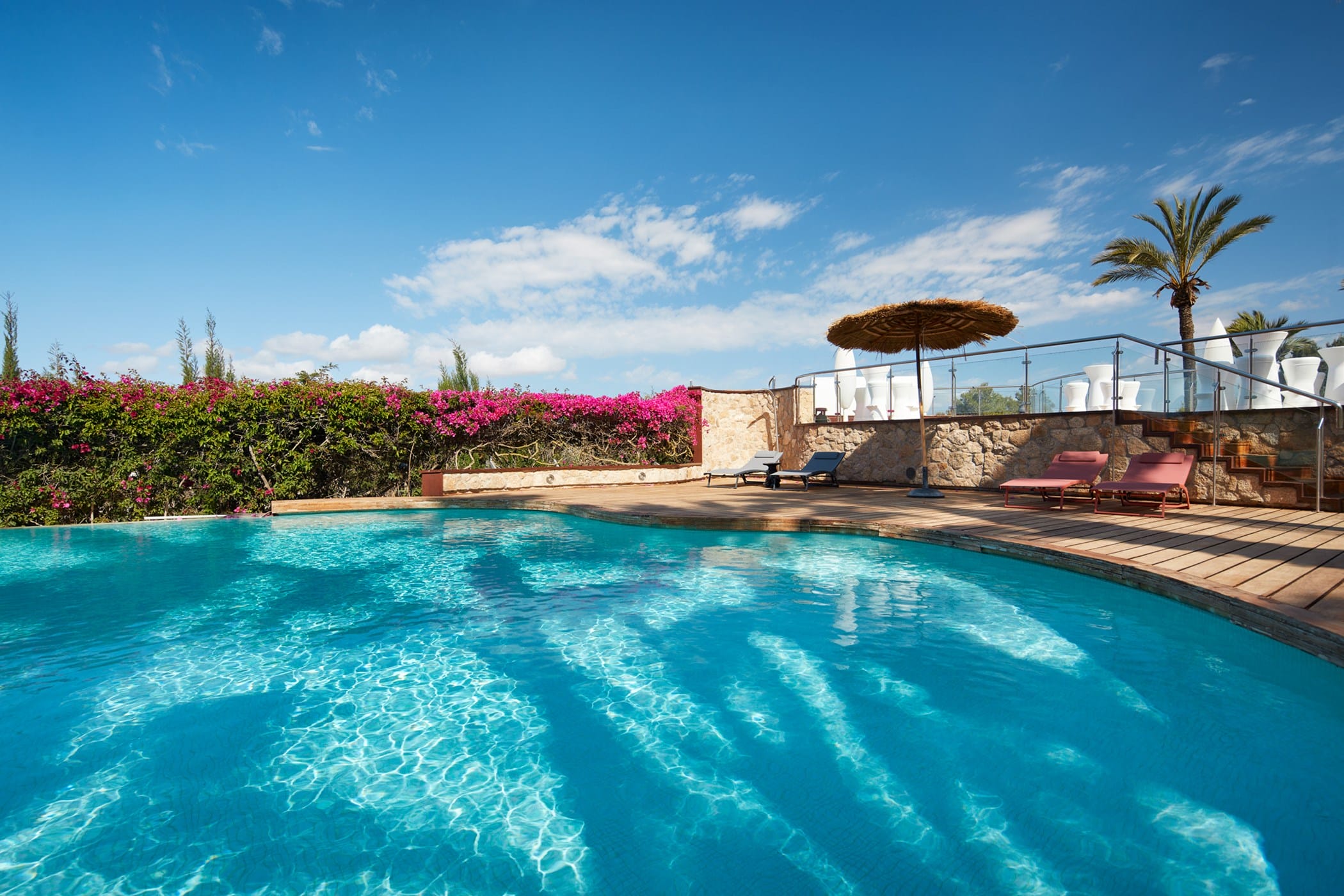 This tropical-style villa is set within expansive private grounds, surrounded by lush Mediterranean gardens and palm trees, offering a peaceful yet well-connected retreat just minutes from Ibiza Town. Its layout and location make it ideal for families or groups seeking both relaxation and easy access to the island’s vibrant south.
