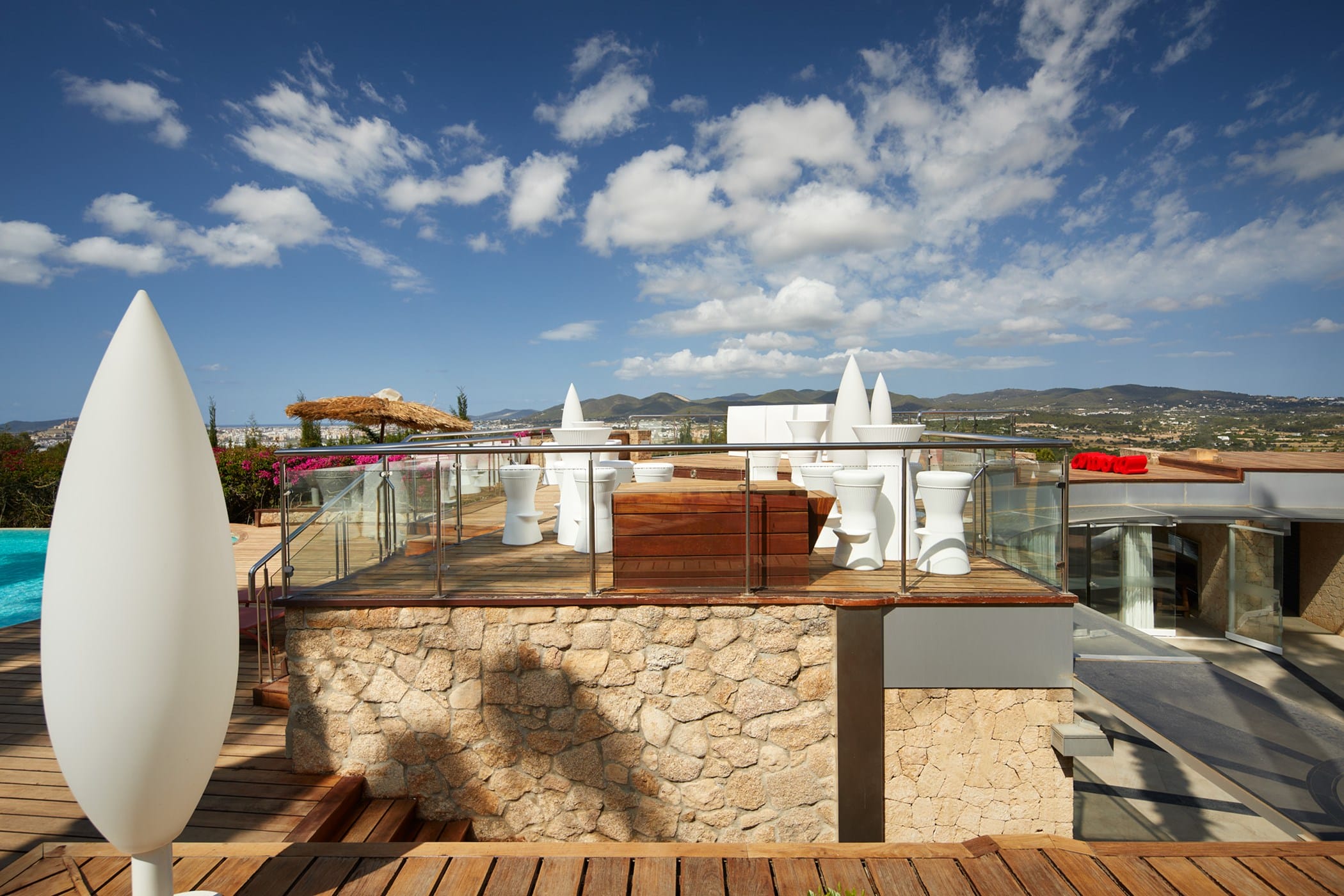 Outdoor living is a key highlight, with a large swimming pool, sun-drenched terraces, and beautifully landscaped gardens. A rooftop terrace with bar seating provides the perfect setting for enjoying panoramic views and unforgettable sunsets. Combining space, comfort, and scenic surroundings, it offers a relaxing and versatile setting for an exceptional Ibiza getaway.
