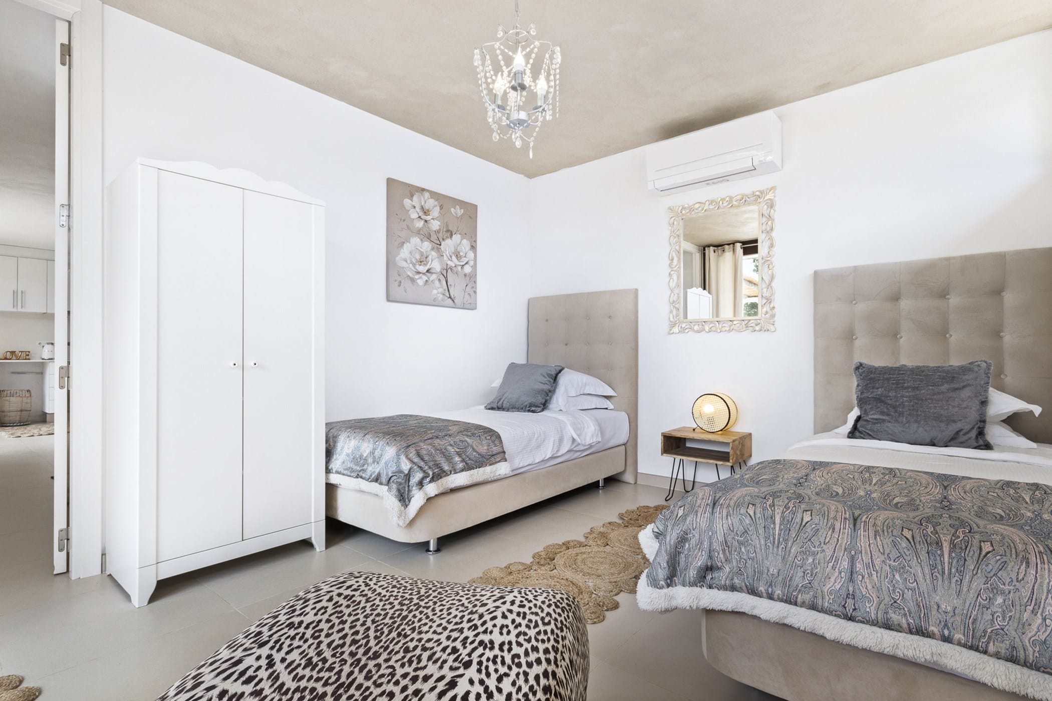 The main villa features 5 double bedrooms (3 with en-suite bathrooms and one family room with 2 bedrooms sharing a bathroom). There is also a separate annex with 2 bedrooms and 2 bathrooms with a private sunset terrace, plus an independent 80m² guest house with kitchen, living area, 2 bedrooms, and 1 bathroom.