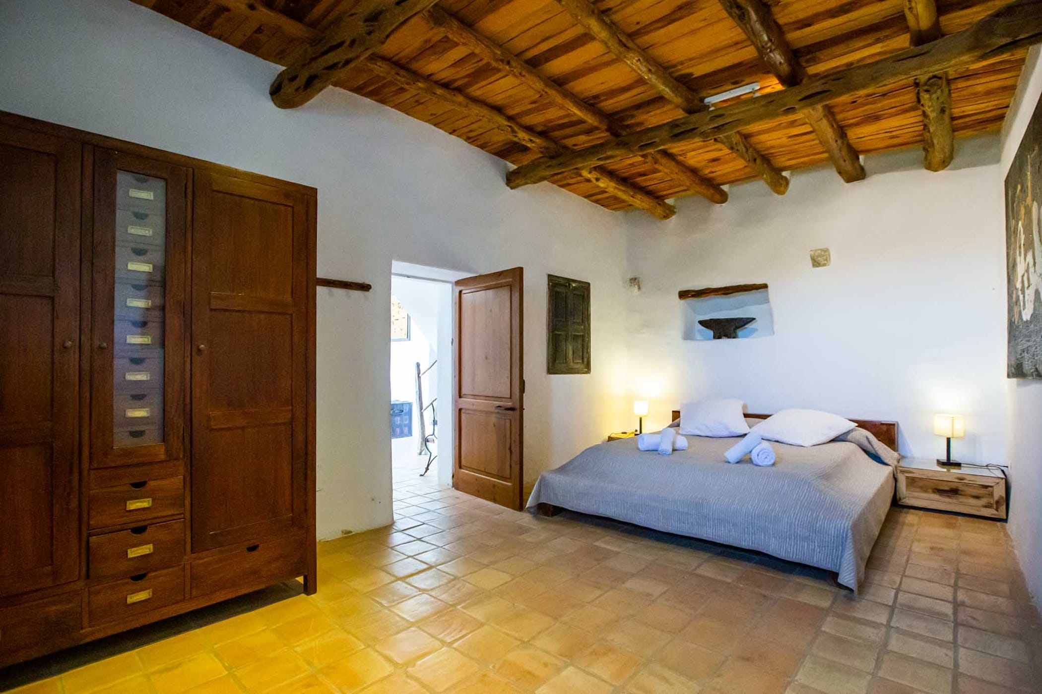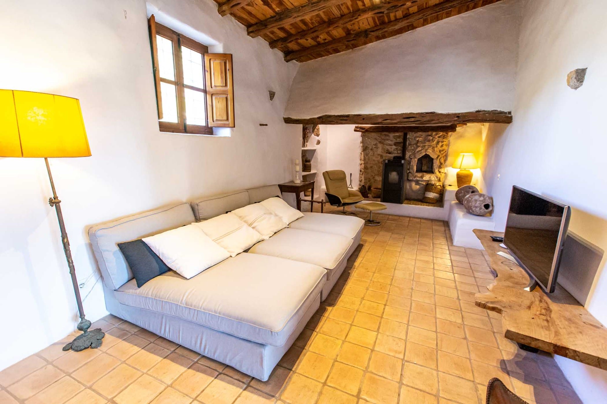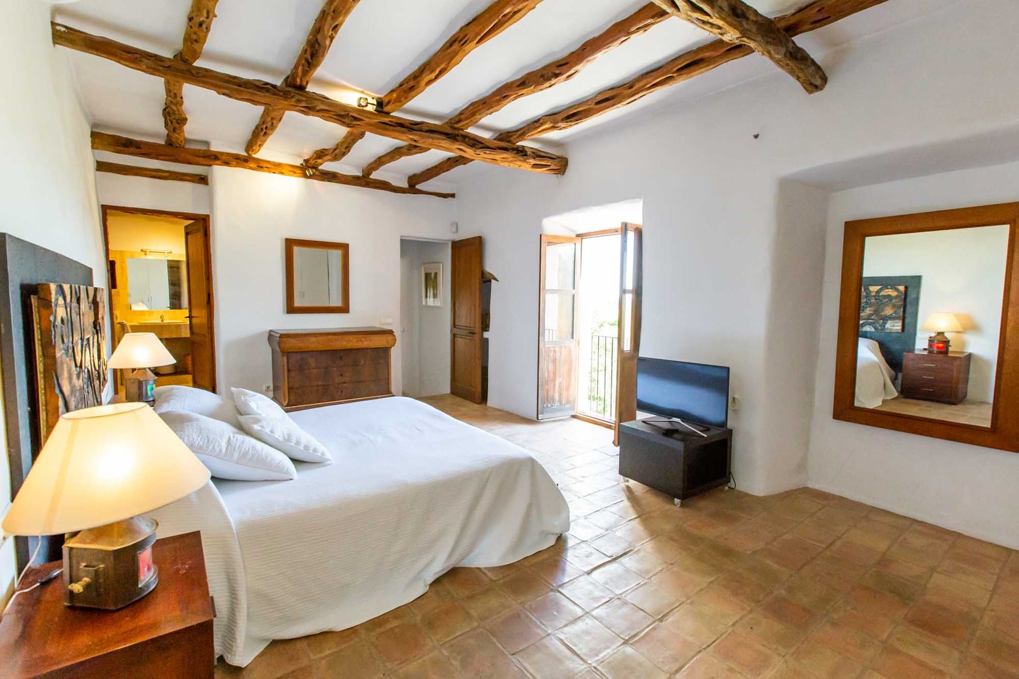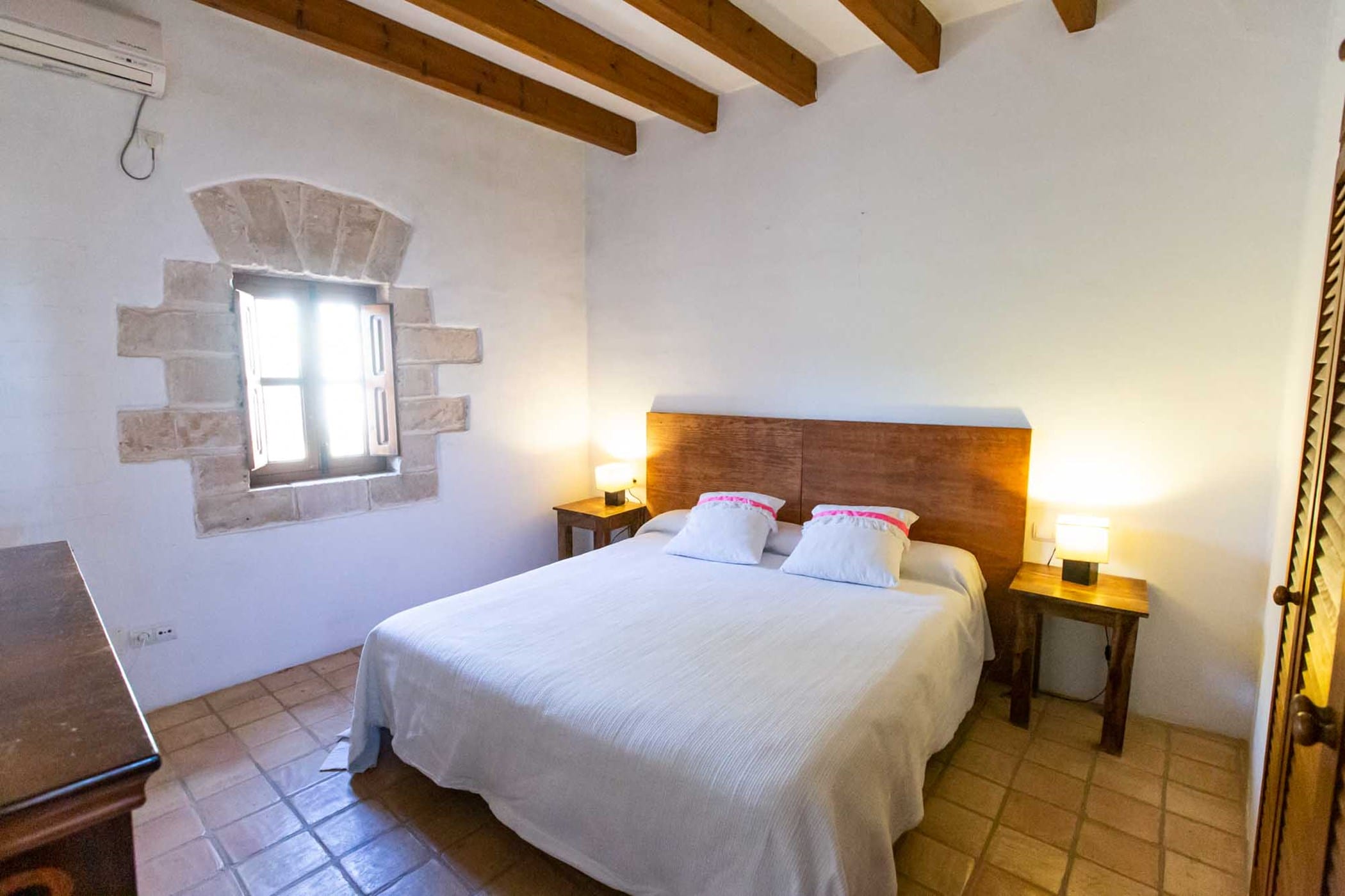 The villa combines original rustic charm — Sabina beams and traditional tiled floors — with modern comforts. The main house features 4 double bedrooms, while the separate guesthouse offers 5 twin bedrooms, comfortably accommodating up to 18 guests.
