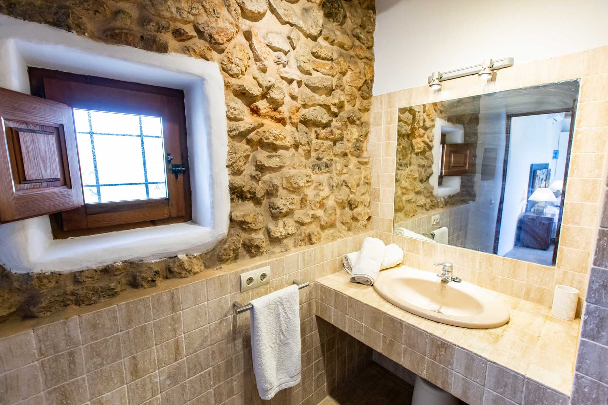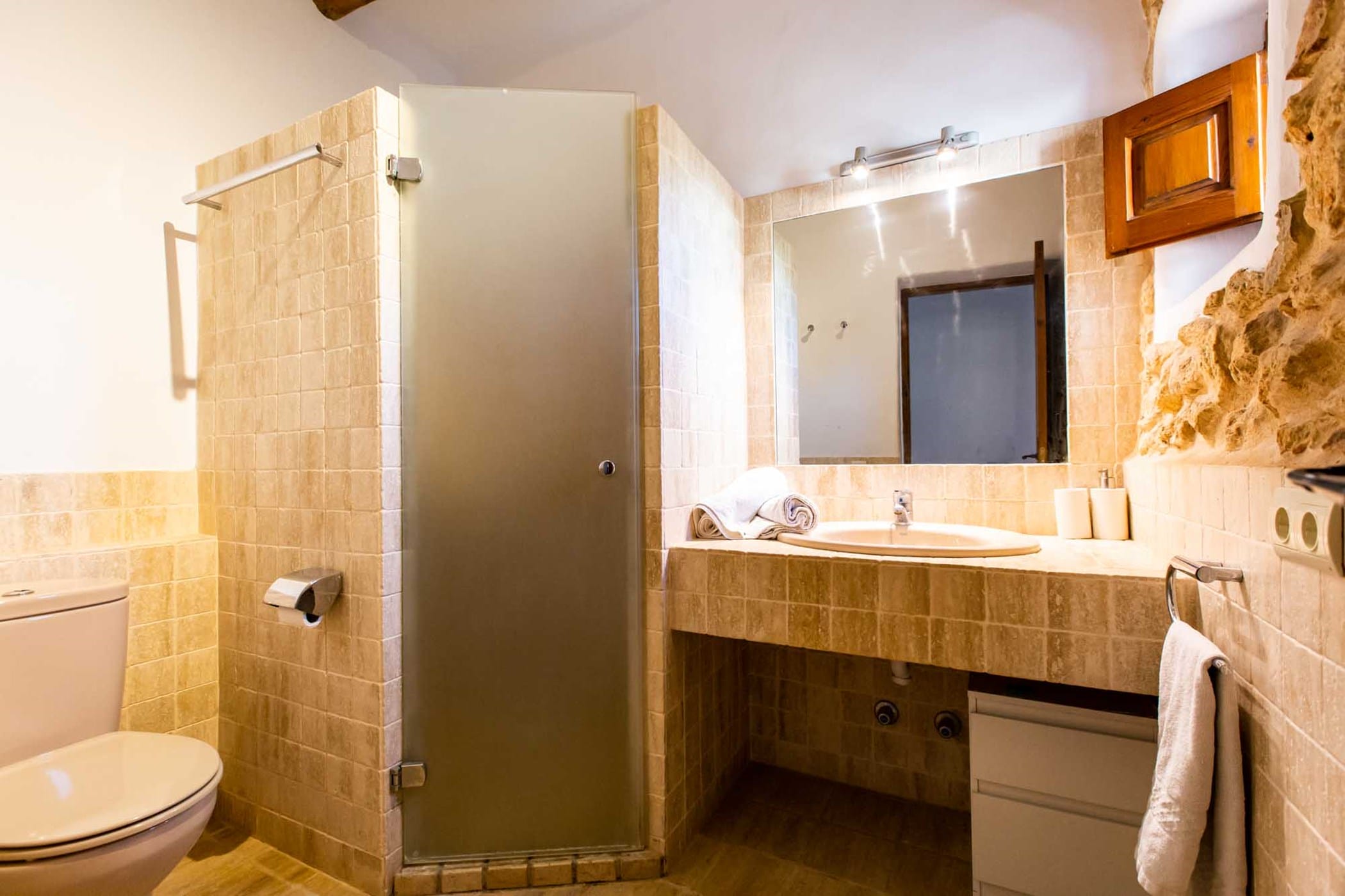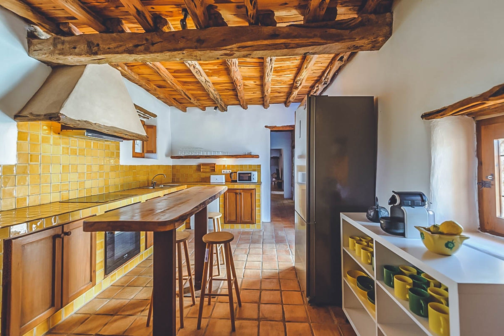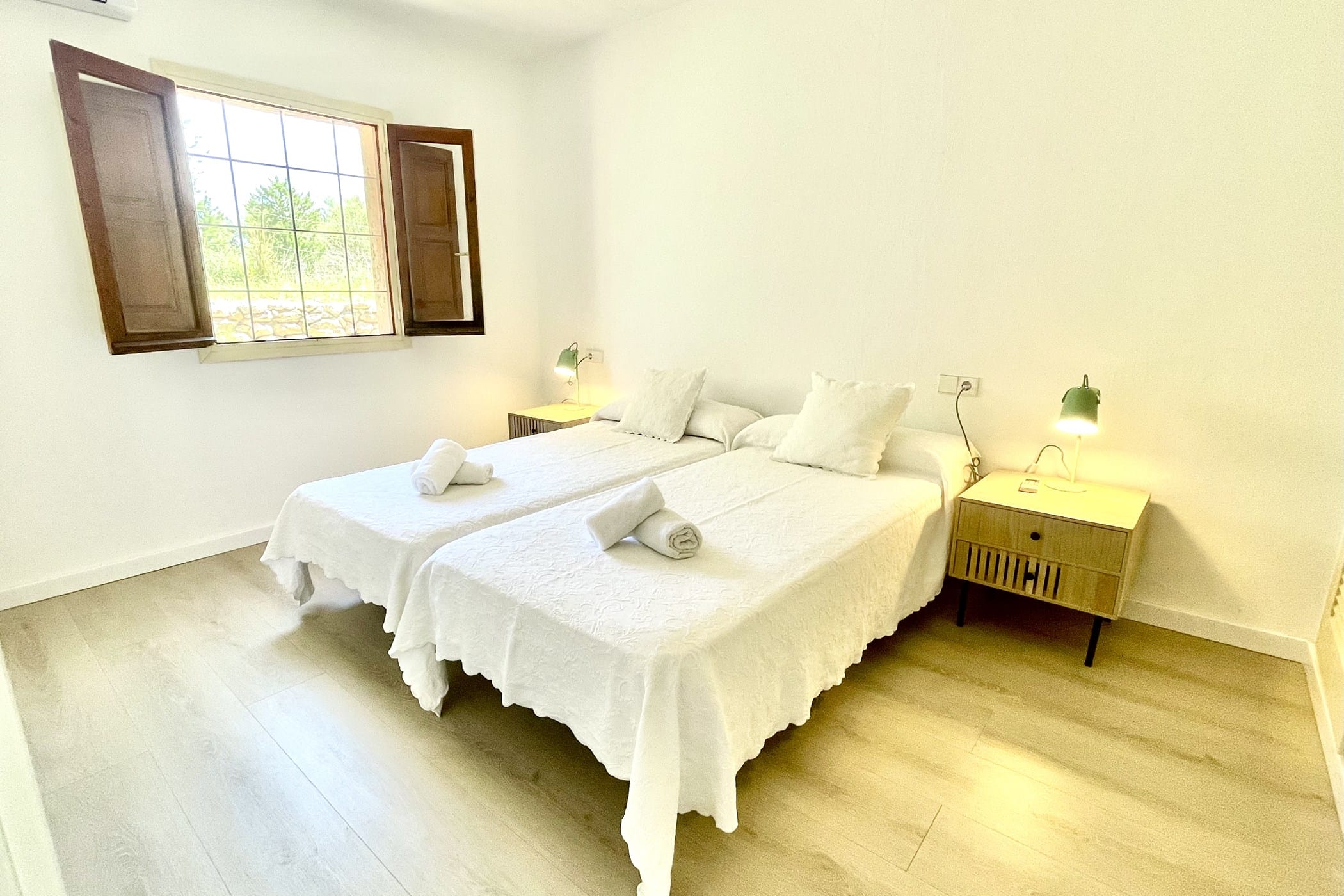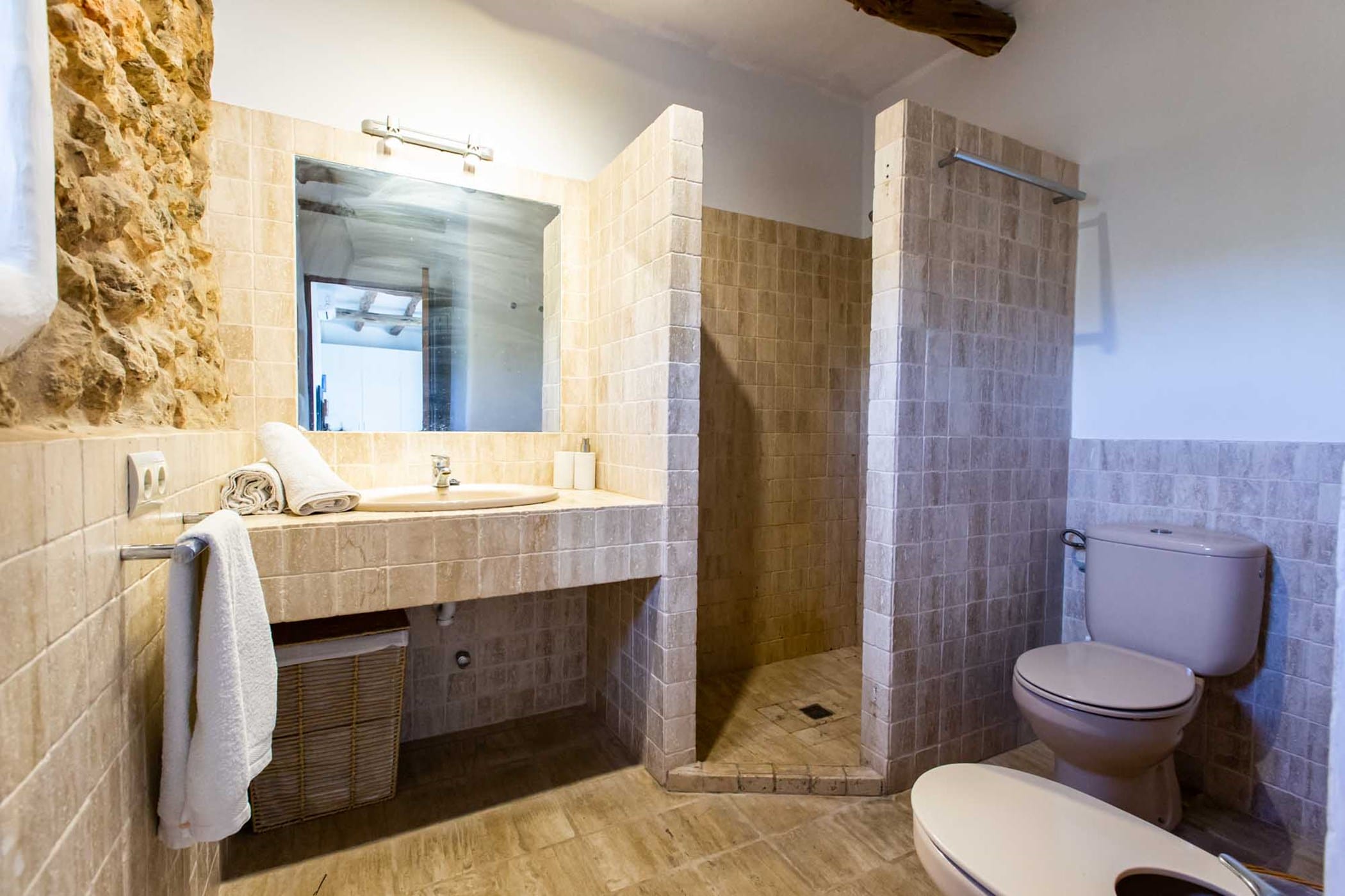 The villa combines original rustic charm — Sabina beams and traditional tiled floors — with modern comforts. The main house features 4 double bedrooms, while the separate guesthouse offers 5 twin bedrooms, comfortably accommodating up to 18 guests.