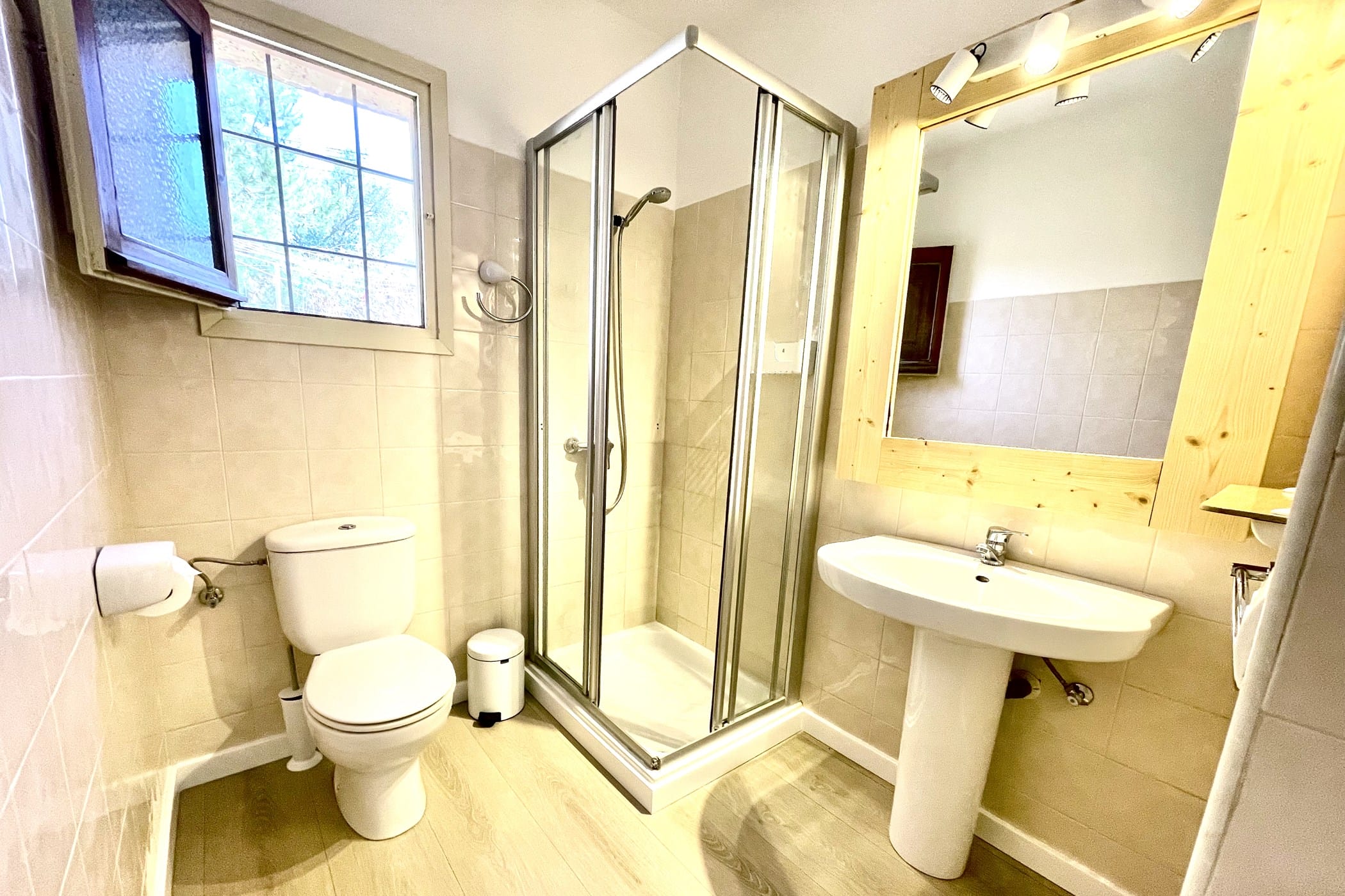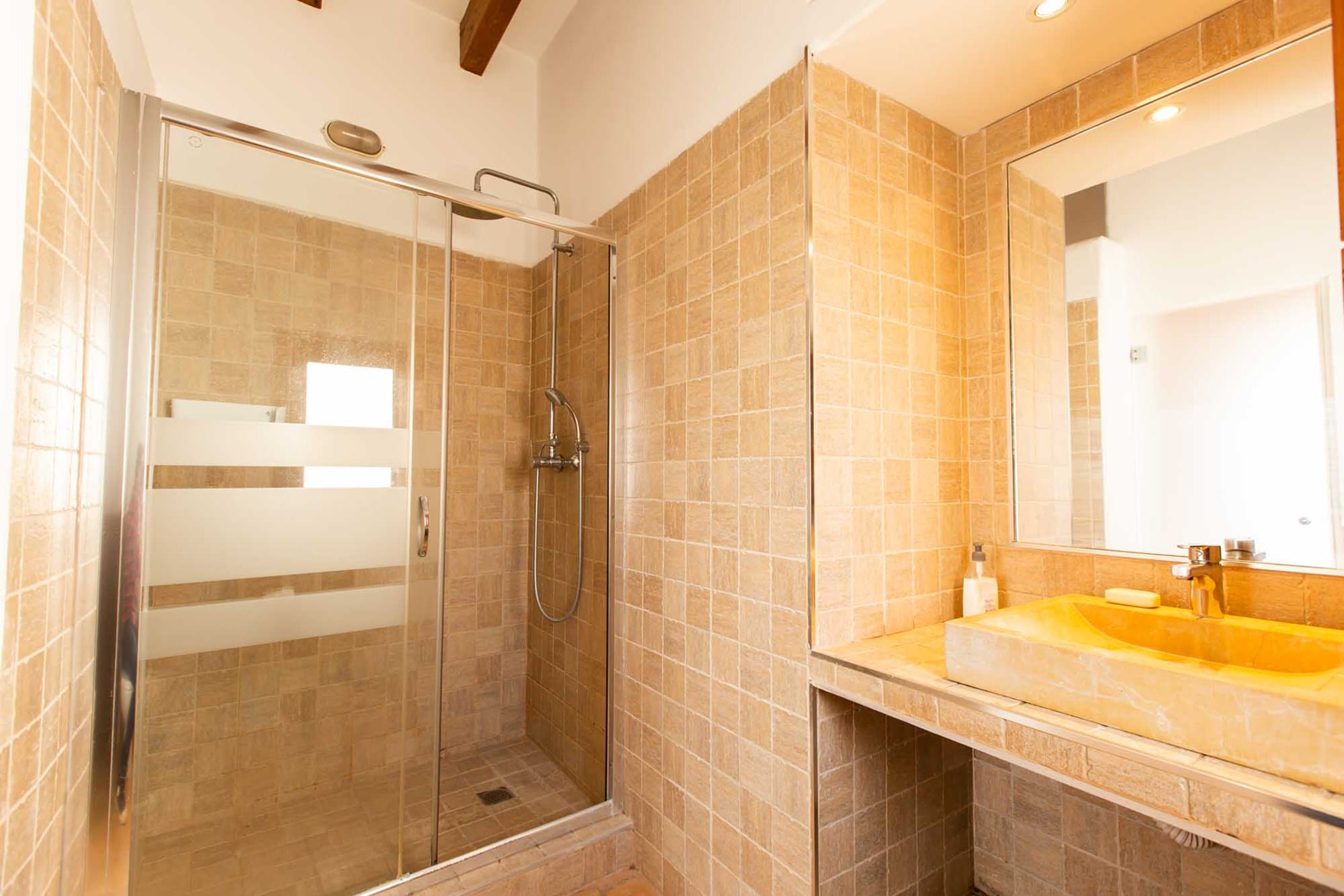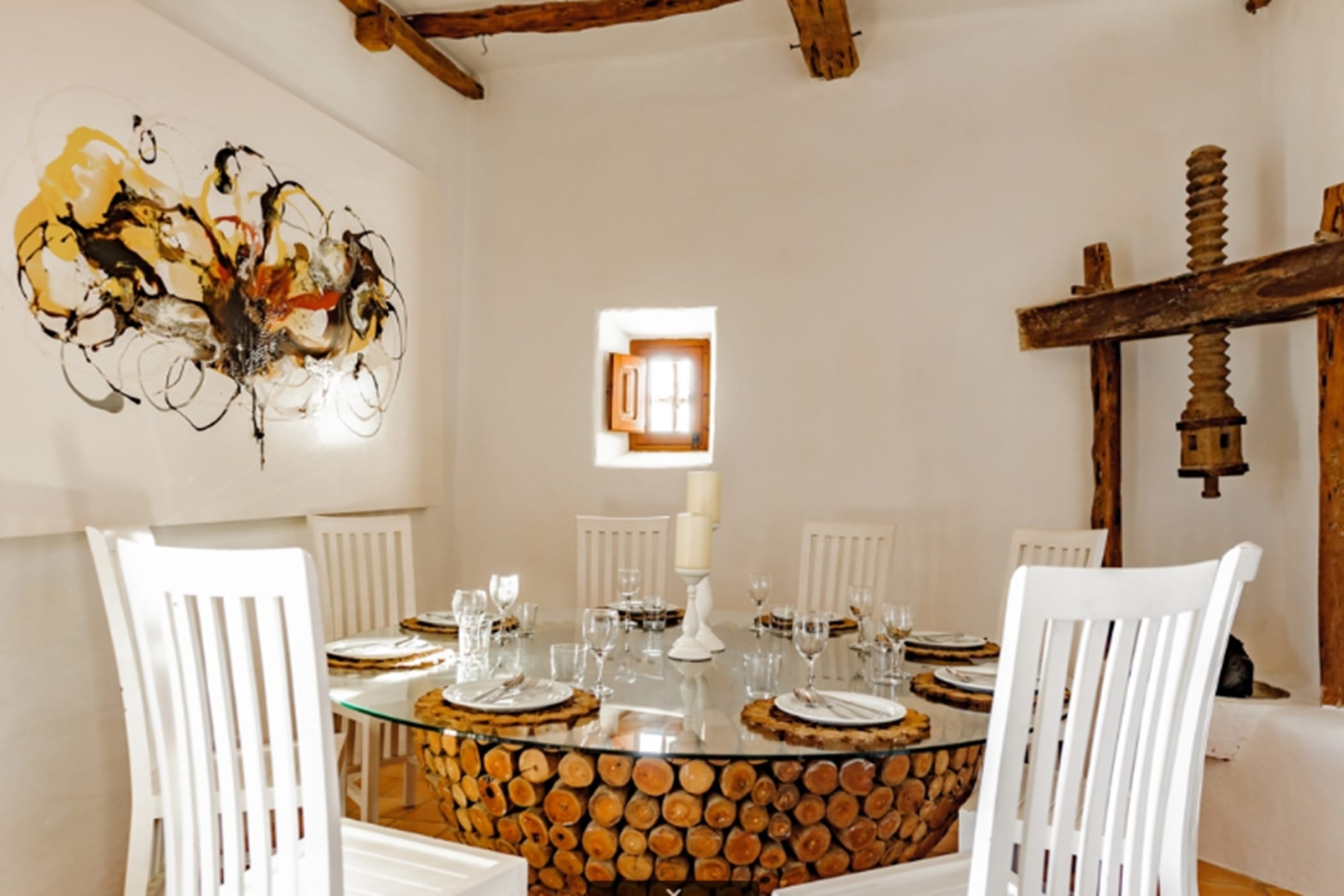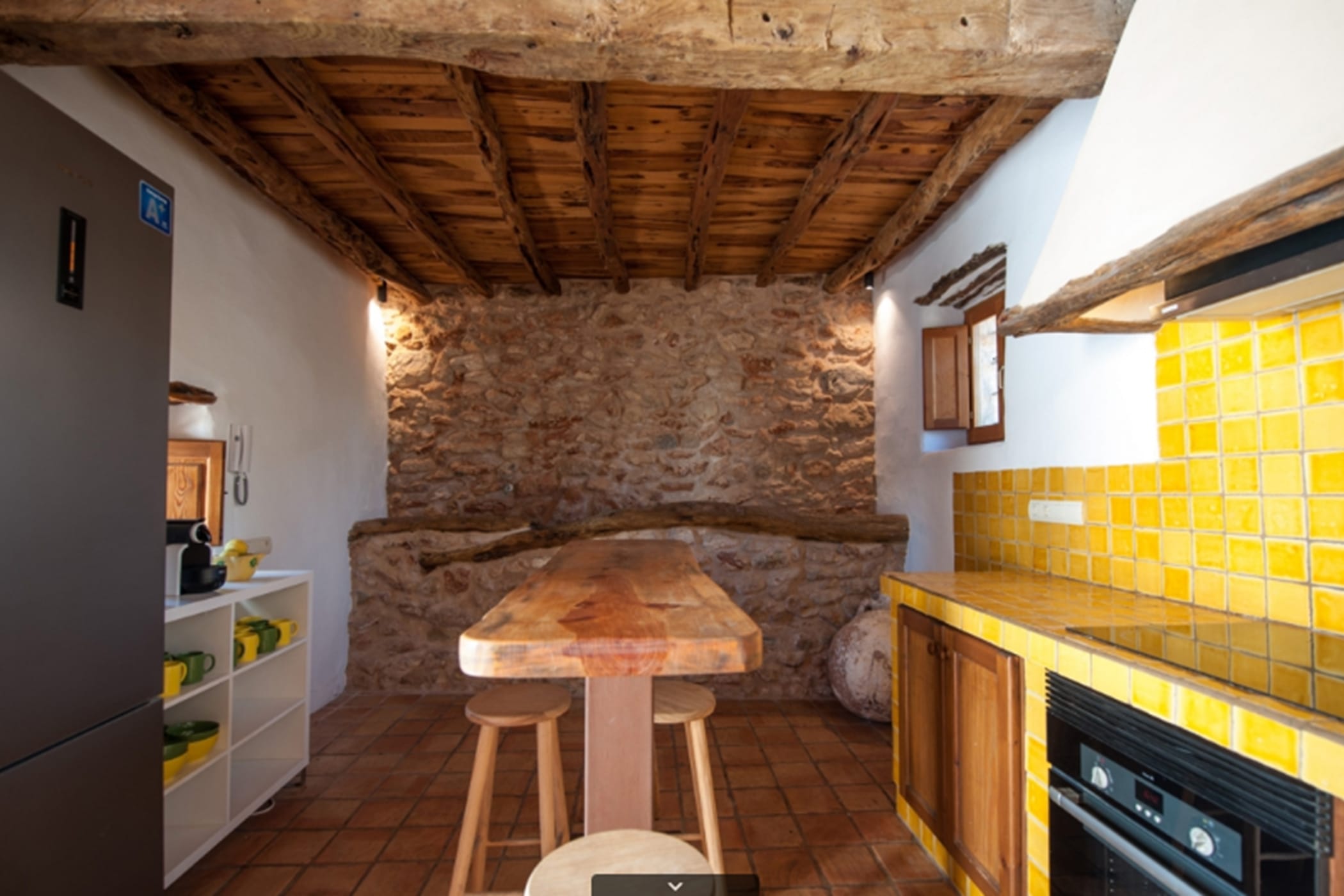 The villa combines original rustic charm — Sabina beams and traditional tiled floors — with modern comforts. The main house features 4 double bedrooms, while the separate guesthouse offers 5 twin bedrooms, comfortably accommodating up to 18 guests.