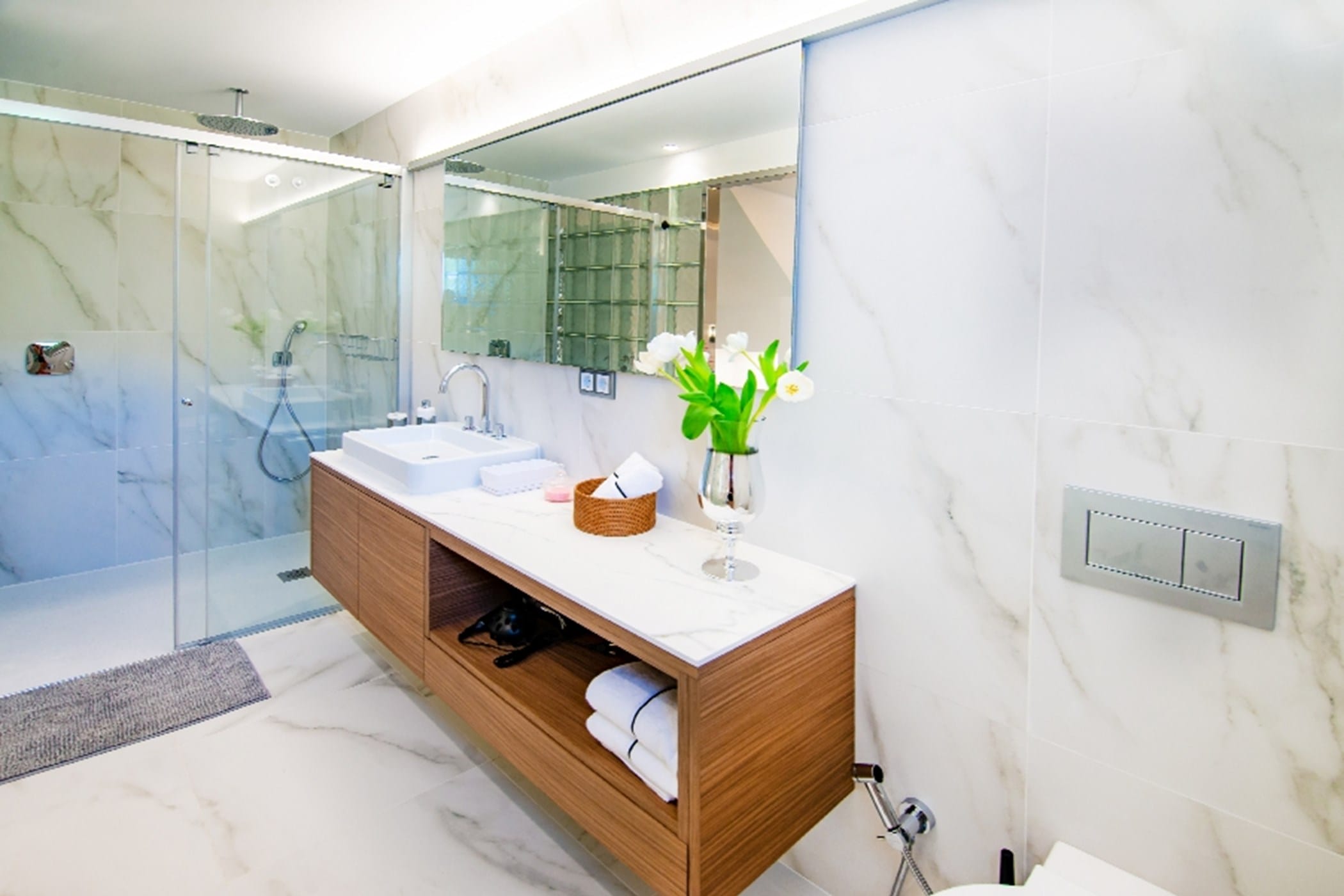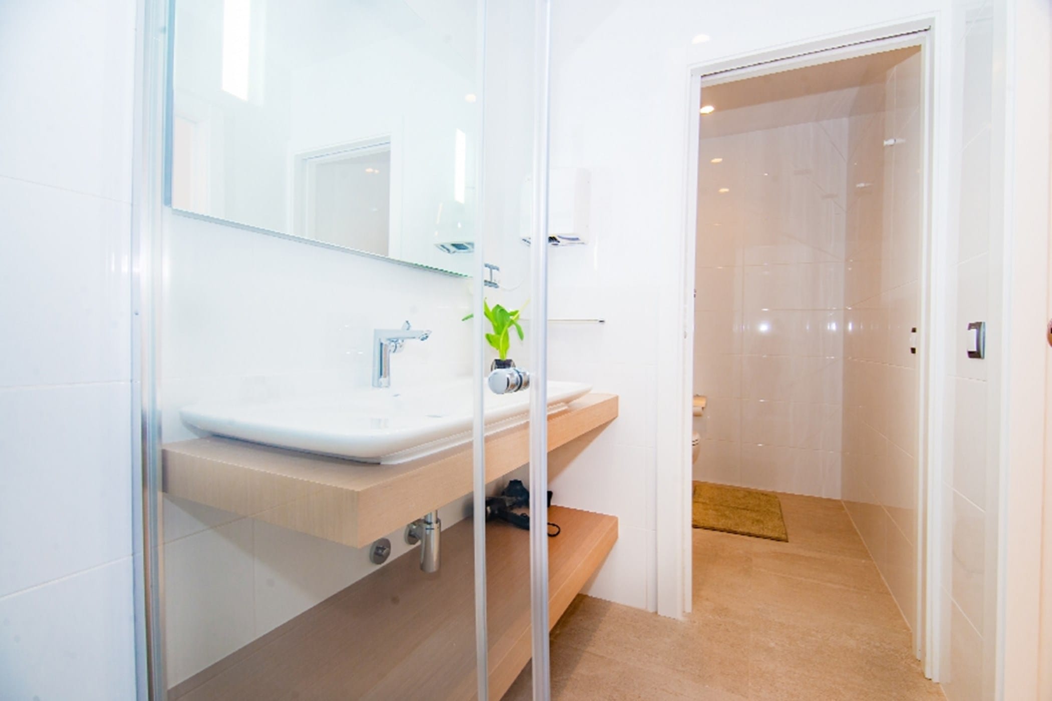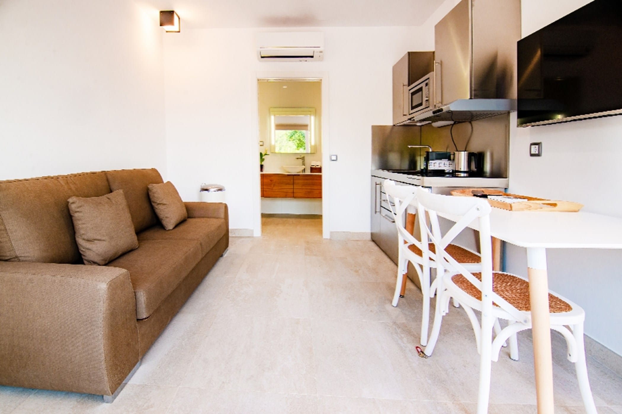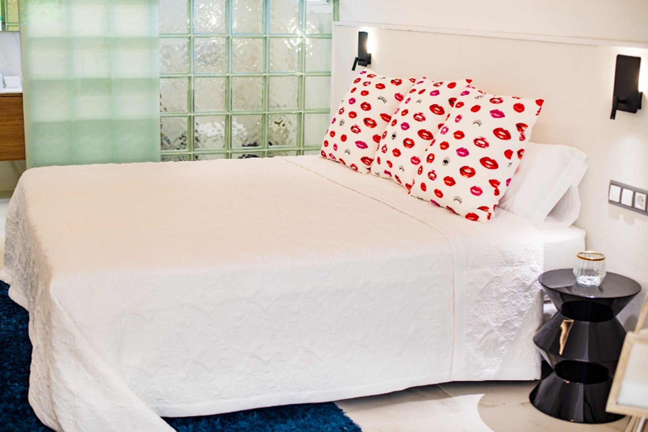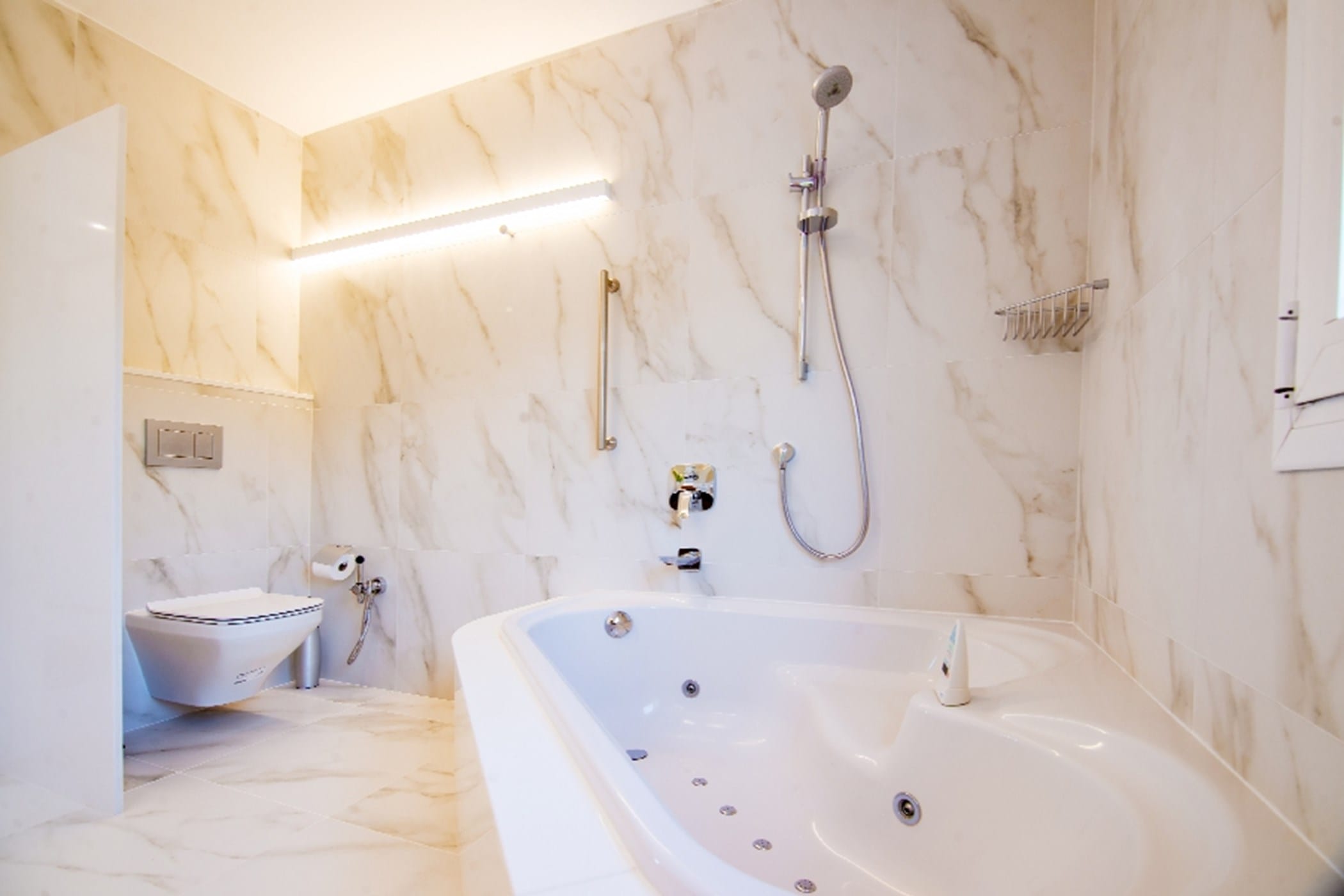 The villa features 7 spacious bedrooms (6 double and 1 twin), all with en-suite bathrooms, plus a separate staff apartment with 2 additional bedrooms (1 twin + 1 double), a living room, kitchen, and bathroom — providing flexibility and extra privacy.